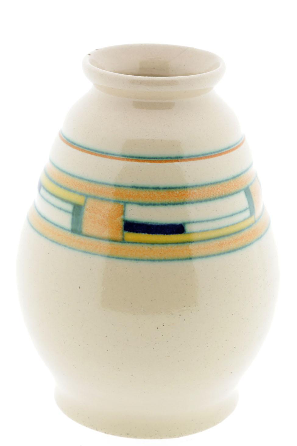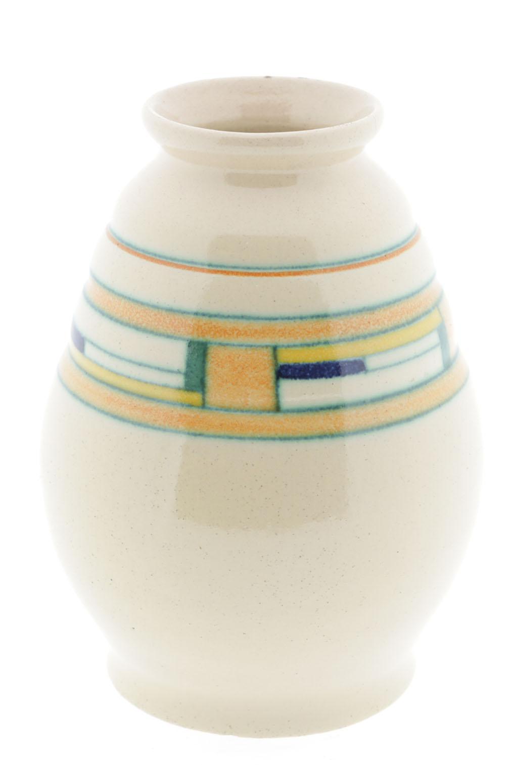 Velsen Kennemer Potterij Holland, aardewerken siervaas, het decor is ontworpen door E. Snel en geschilderd door J.G.P. Belt, model nr. 17, h.18 cm., dit model is afgebeeld in: Velser aardewerk, Tachtig jaar jong; blz. 10,32,51 en 64 (haarlijn en klein defect aan onderzijde)