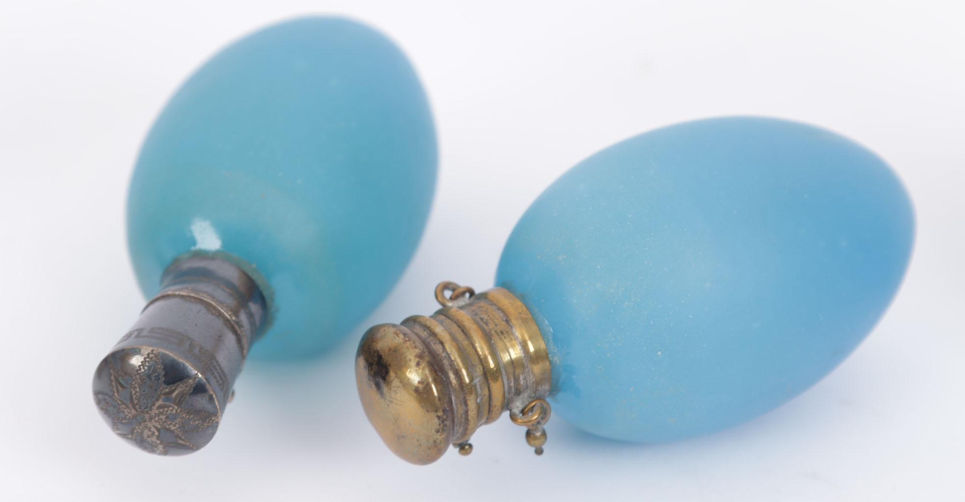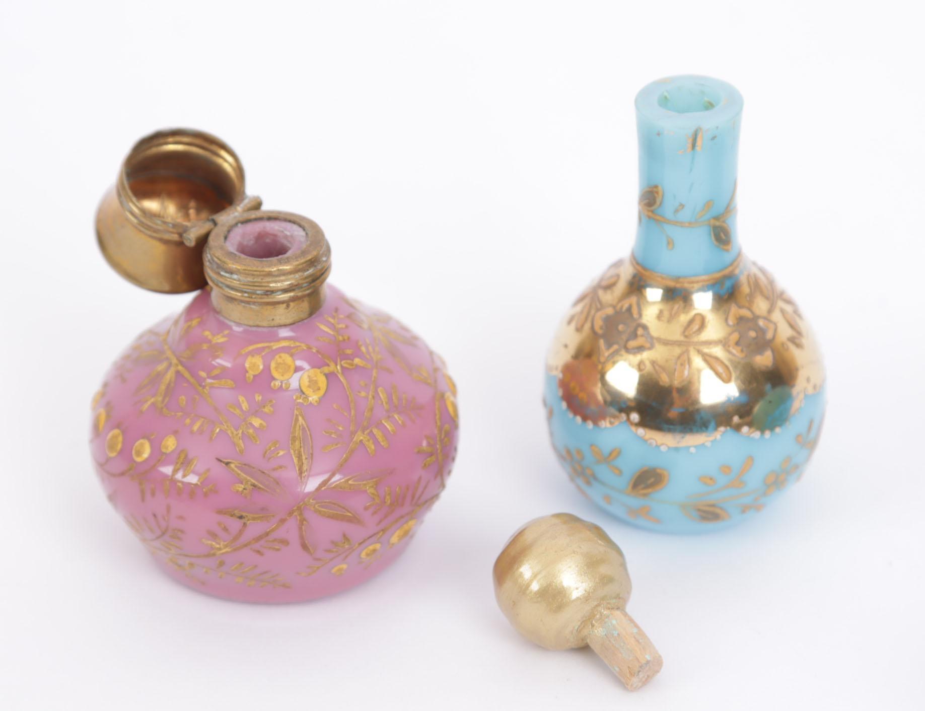 5 parfumflesjes, waaonder: 1 roze porceleinen flesje met gouden geëmailleerde versiering en koperen scharnierende dop, hoogte 5,5 cm, 1 turquoise porceleinen flesje met goud emaille versiering en gouden stopje, hoogte 7 cm, 3 blauwe opaline glazen flesje, waarvan 2 in ei vorm, waarvan 1 met zilveren scharnierende dop en glazen binnenstopje, hoogte 7-7,5 cm