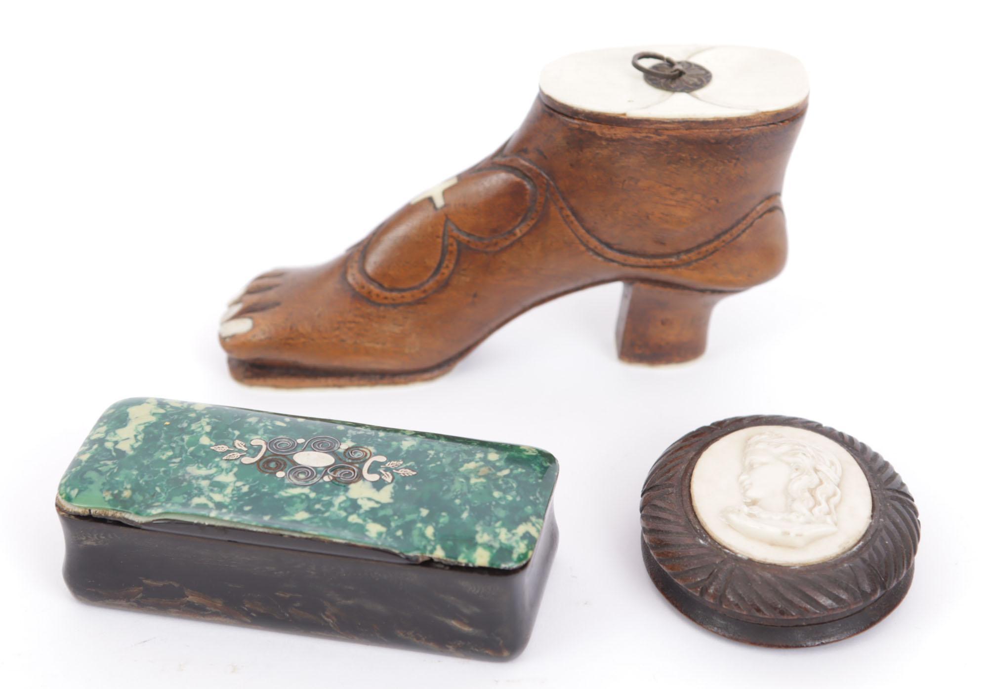 Verzameling van 3 doosjes, waaronder: een houten snuifdoos in de vorm van een voet op sandaal met deksel, zool en tenen van been, deksel met ringetje, 19e eeuws, lengte 12 cm, hoogte 6,8 cm, 1 langwerpig papiermaché snuifdoos met gevlekt groen lakdeksel, waarin een zilveren decoratie, eind 19e eeuw, 2,7x9,5x4,3 cm, 1 ovaal plat bewerkt houten snuifdoosje met wit meisjesprofiel op deksel (à la camee), lengte 6,4 cm