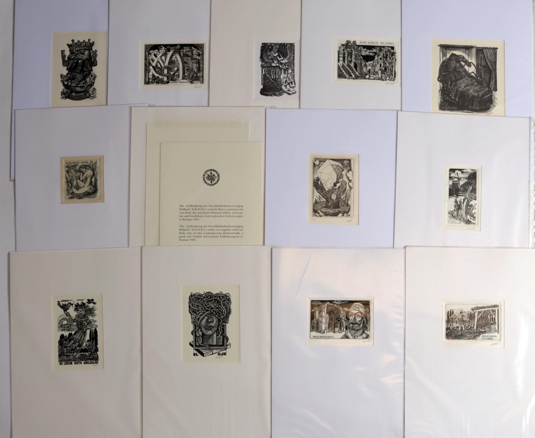 Strik, L., plm. 40 exlibris / kleingrafiek, C2/X2 (21 x C2), grotendeels gesigneerd. In passe-partouts. Voor o.a. De Bruyn, Meulemans, Willemse, Zwiers, Hausweiler, Quapp, Wiese, Rhebergen, Veldhuizen, Wetselaar, De Haas, Burch.