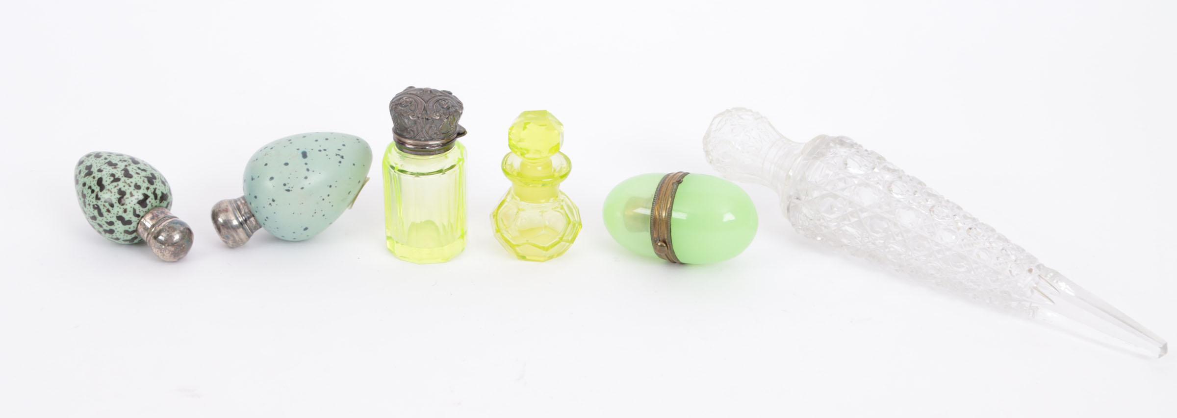 6 parfumflesjes, waaronder: 1 klein staand uraniumglas groen/geel flacon met geslepen dop, 19e eeuws, Engels, hoogte 6,2 cm, 1 porseleinen vogelei met zilverkleurige metalen schroefdop, groen met zwarte vlekken, fabriek Mac Intyre, rond 1890, hoogte 6,7 cm, 1 groen opaline glazen flacon, vorm 2 halve bollen verbonden door koperkleurig metalen montuur, metalen dop, glazen binnendop, rond 1900, hoogte 7 cm, 1 porseleinen vogelei, groen met zwarte spikkels, zilveren schroefdop, Birmingham 1888, maker CS/FS Fabriek Mac Intyre, hoogte 7,3 cm, 1 uranium geel/groen glazen flesje, gefacetteerd, zilveren gedecoreerde scharnierende dop, glazen binnendop, hoogte 7 cm, 1 crystallen puntflacon, glazen schroefdop, hoogte 21,5 cm