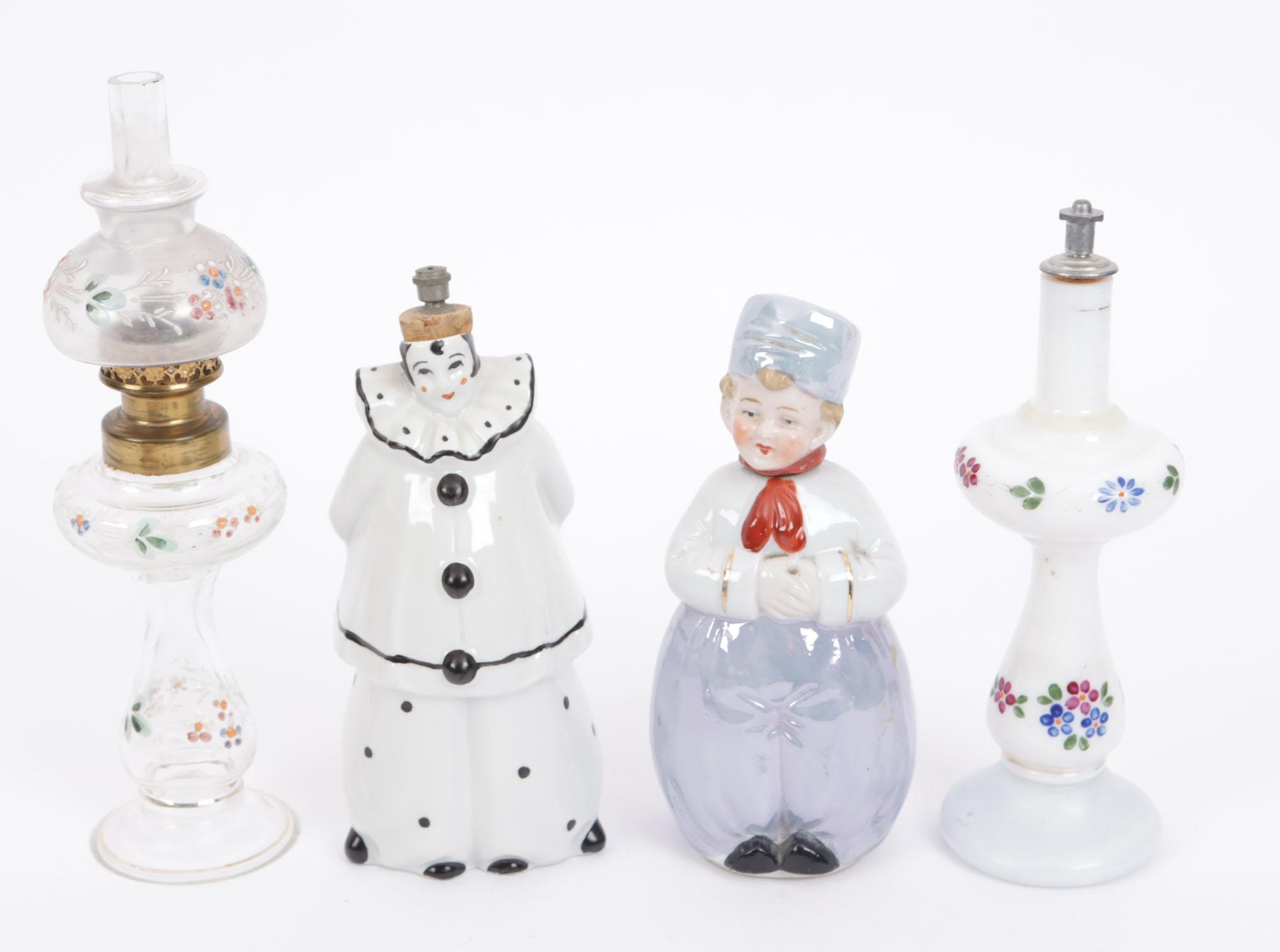 4 parfumflesjes, waaronder: 1 boldootglazen flacon, model antieke olielamp, glas met email bloembeschildering, sprinklerdop gemerkt "Boldoot Amsterdam", opzetglas als kopie van olielamp, begin 20e eeuw, hoogte 20 cm, 1 witte melkglazen fles in vorm olielamp, emaille beschildering, hoogte 16 cm, 1 klein mannetje, waarschijnlijk jeneverflesje, hoofdje is de dop, hoogte 14 cm, 1 porseleinen figuurtje, voorstellend een clown in wit pierrot kostuum, kurken dopje, jaren 1930, Frans, hoogte 15 cm