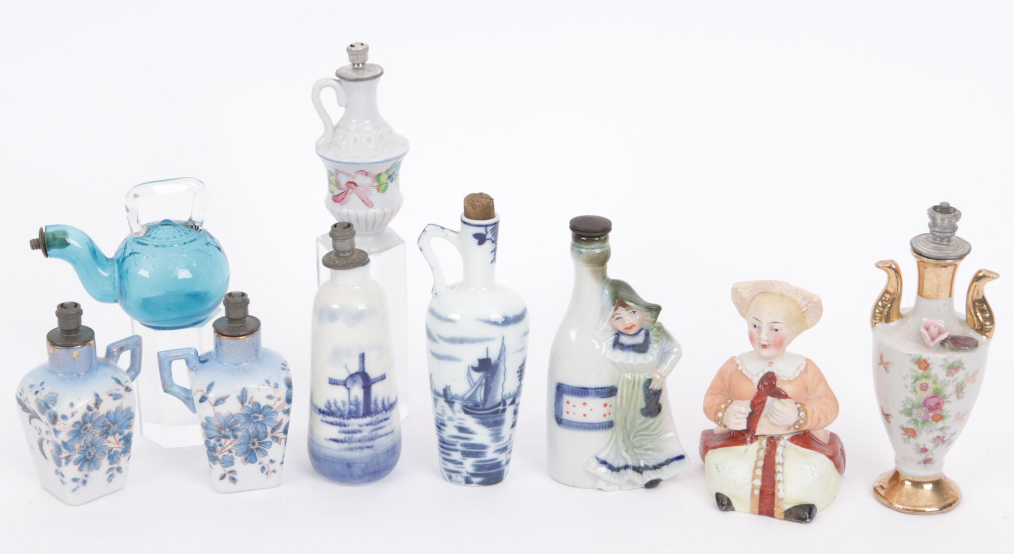 9 parfumflesjes, waaronder: 2 vierkante porseleinen flesjes met handvat, blauwe emaille bloemetjes, ijzeren sprinklerdop op kurk, Boldoot? jaren 1920, hoogte 7,3 cm, 1 biscuit porseleinen vrouwtje, bovenlijfje is de dop, onderlijfje incl. kurkje, jaren 1920, Duits? hoogte 8,2 cm, `1 glazen turquoise flesje in vorm theepotje, hoogte 5,8 cm, 1 porseleinen vrouwtje leunend tegen fles, hoogte 10,2 cm,, 1 porseleinen flesje met beschildering van molen, hoogte 10 cm, 1 porseleinen flesje met landschap en molen, oortje aan fles, hoogte 11,2 cm, 1 wit porseleinen flesje met oortje, emaille bloem- en strik beschildering, hoogte 8 cm, 1 porseleinen flesje op gouden voetje en gouden oortjes en hals, roosje-applicatie en bloembeschildering, hoogte 11,5 cm