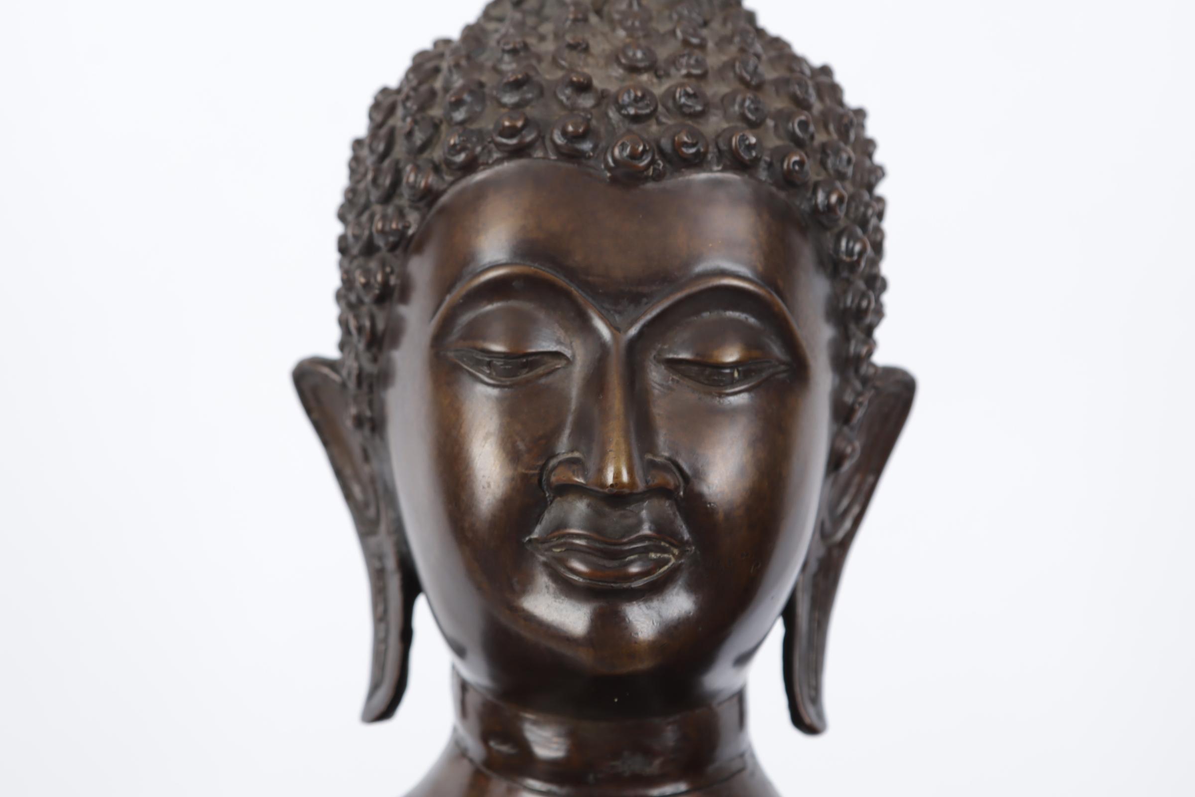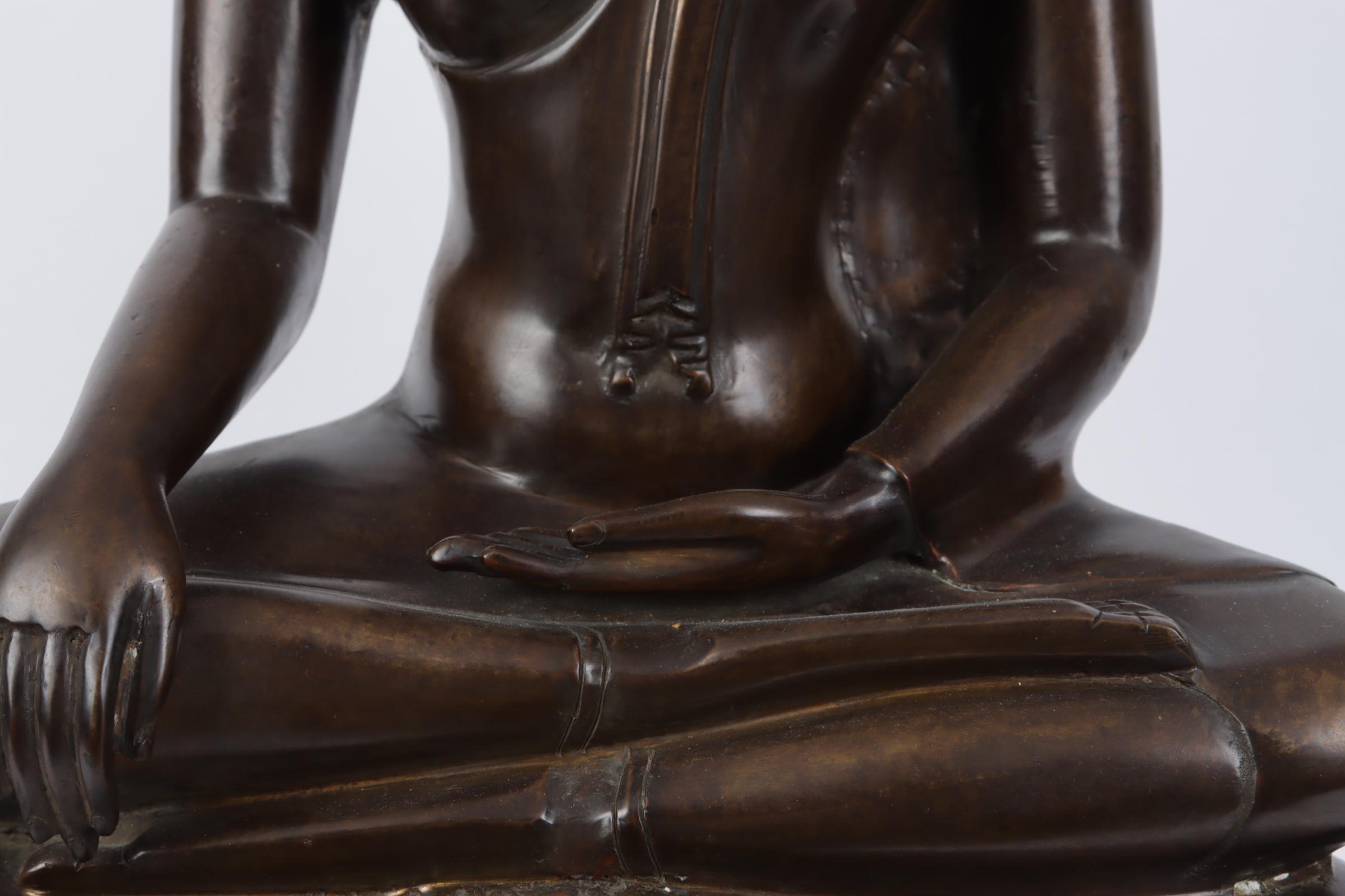 Bronzen sculptuur van een zittende Boeddha op troon, h.74 cm.