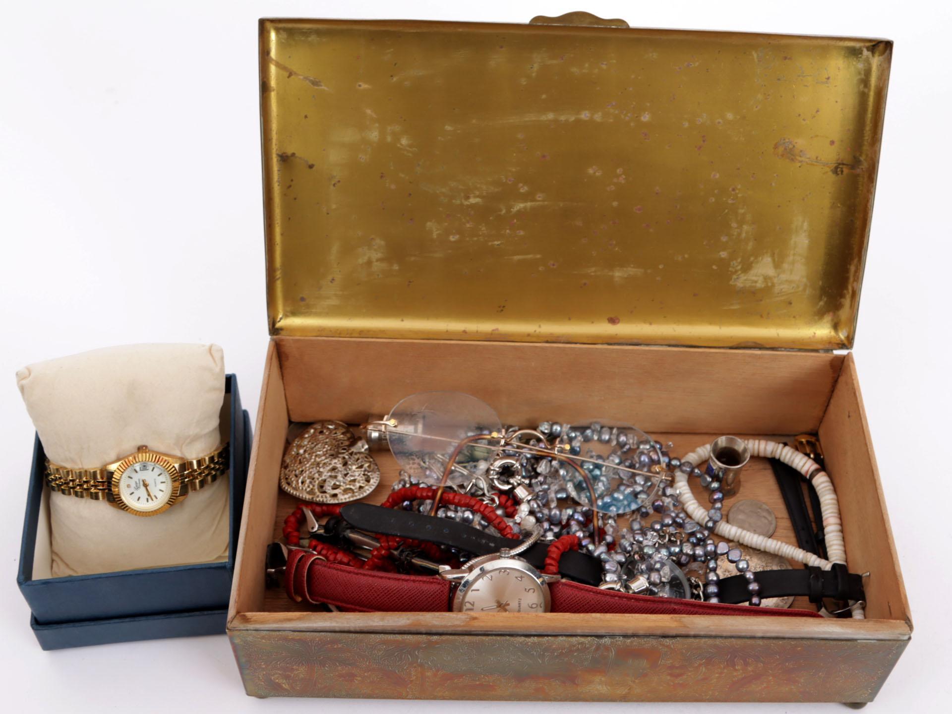Sieradenkistje met inhoud van divers bijoux, horloges, etc.