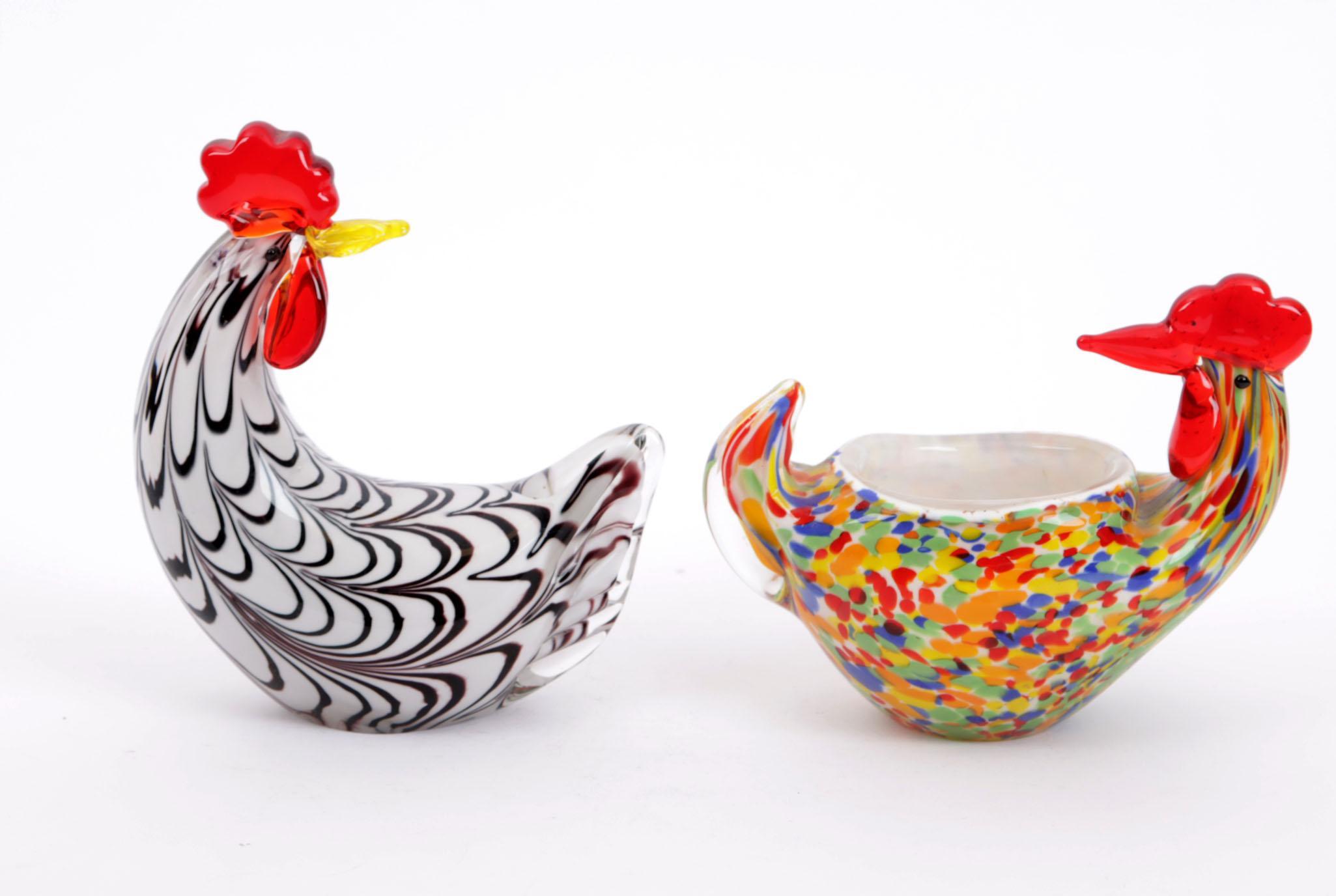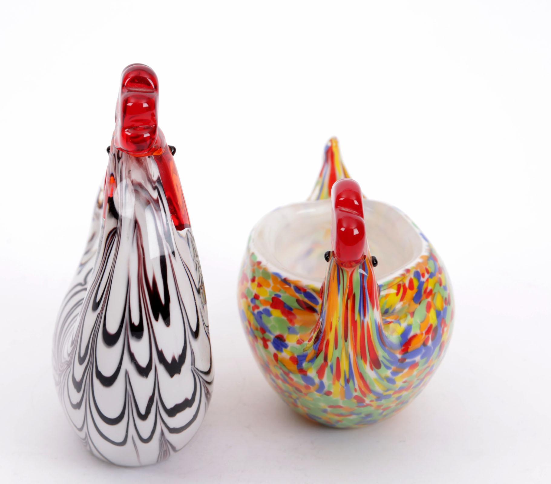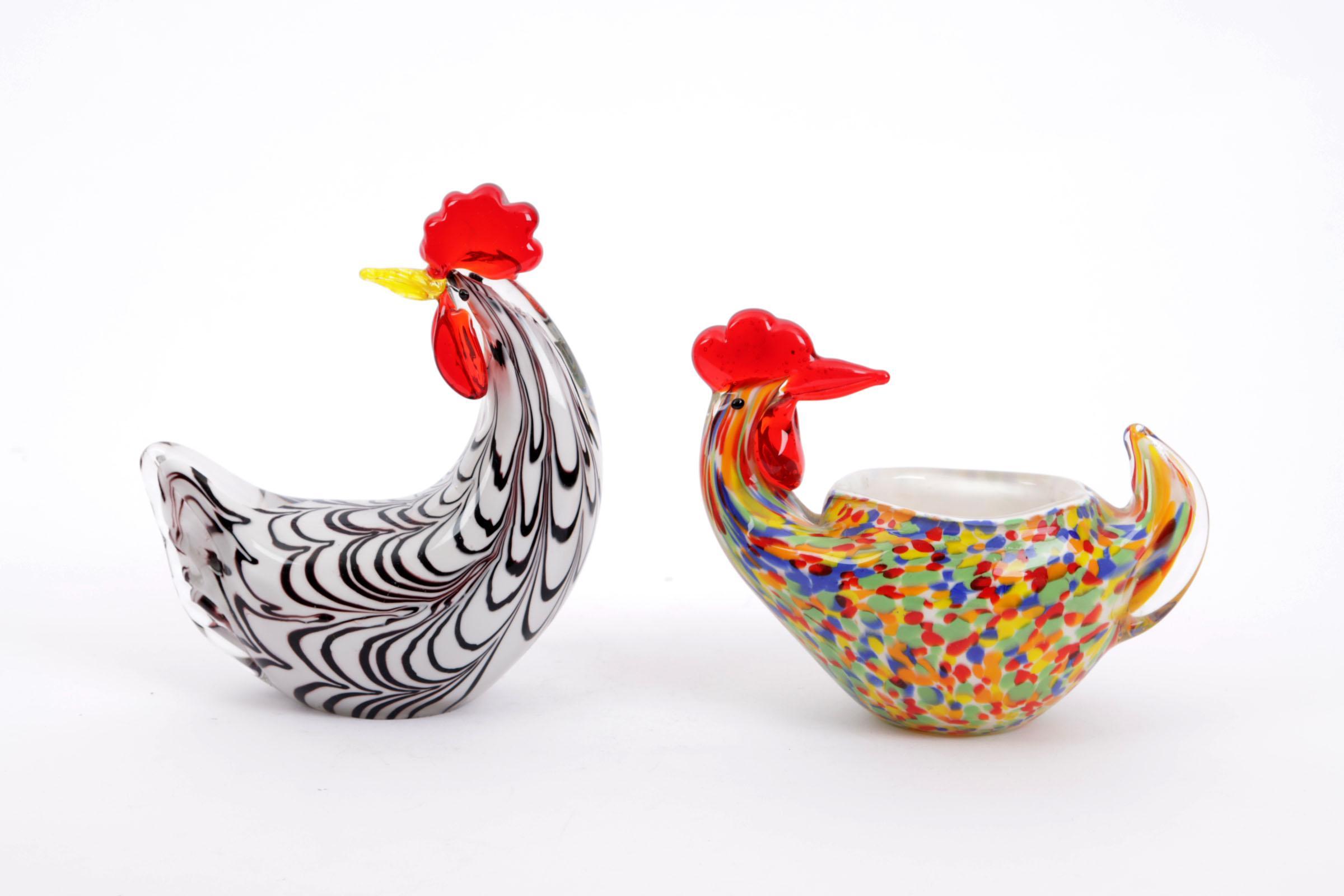 2 Diverse glazen Murano-stijl kippen, h.19 cm.