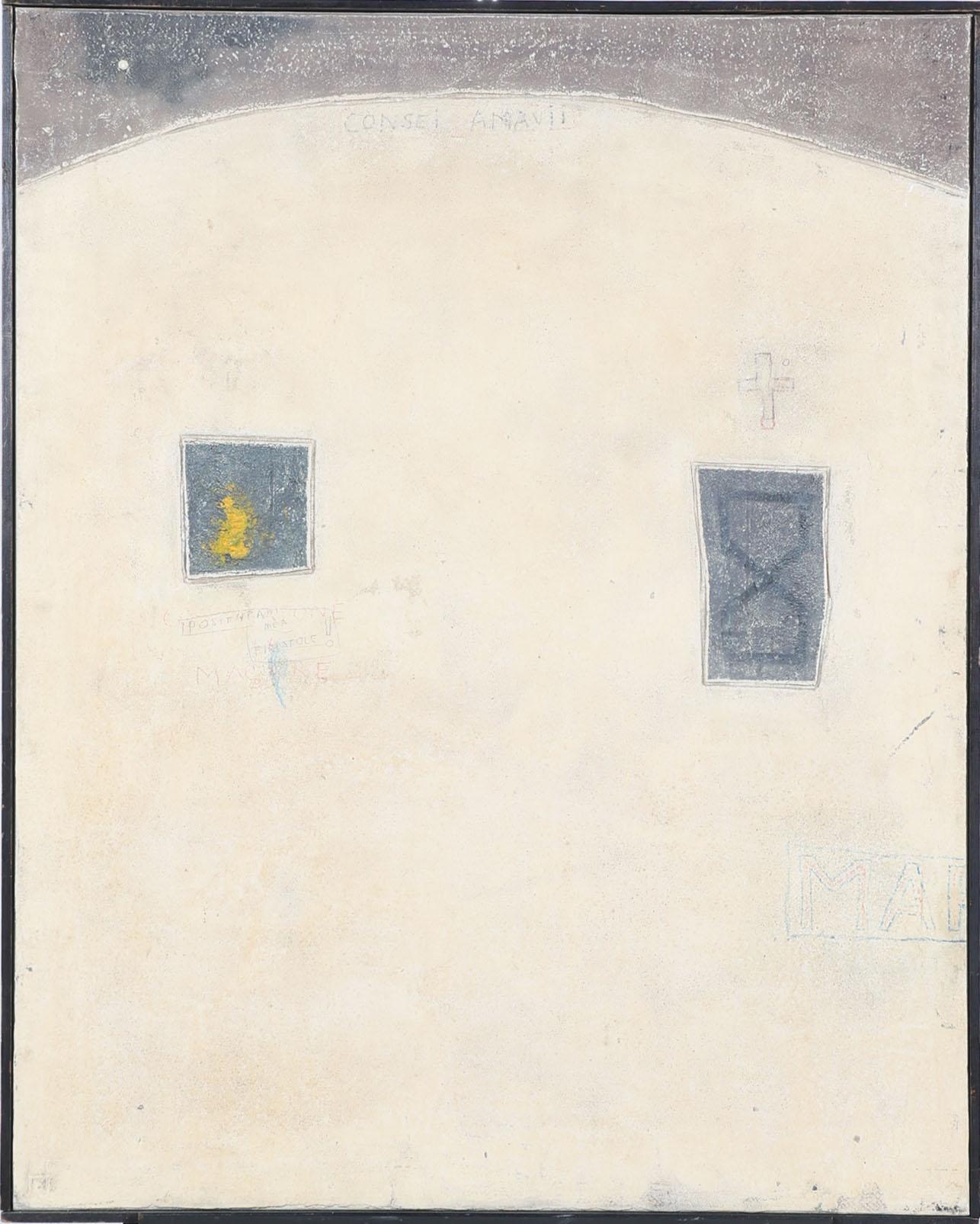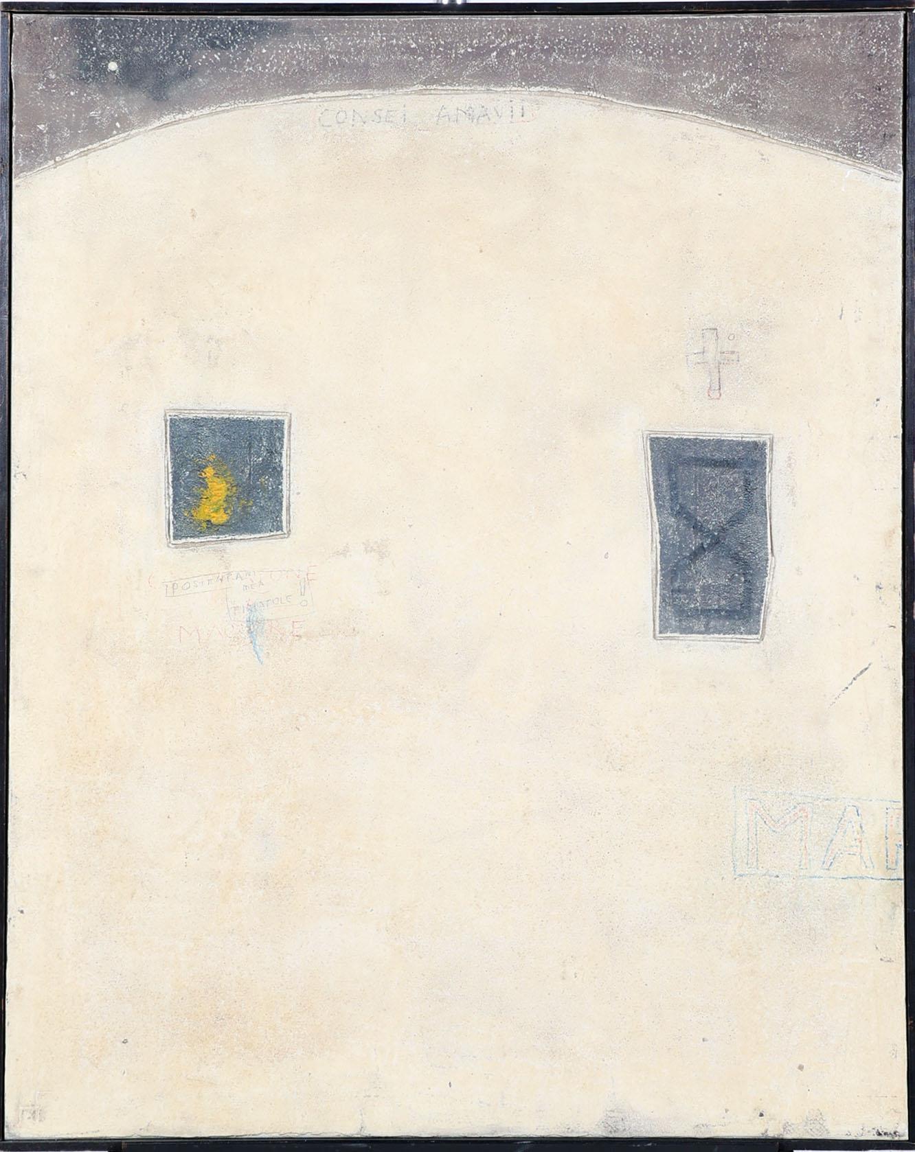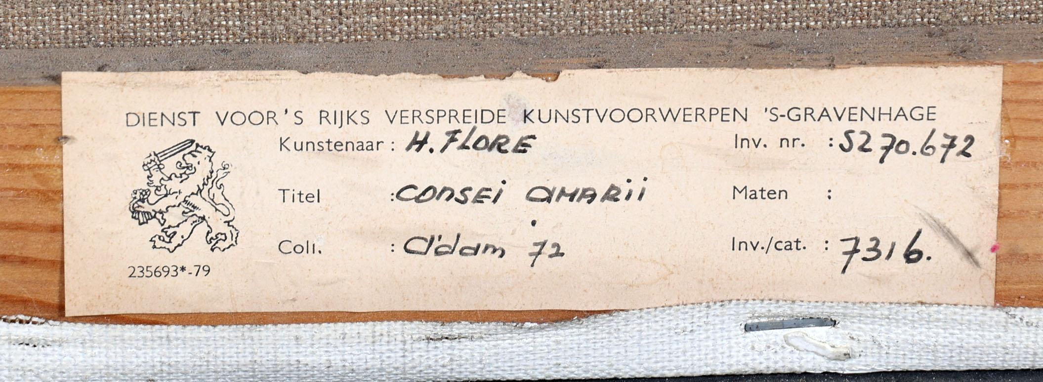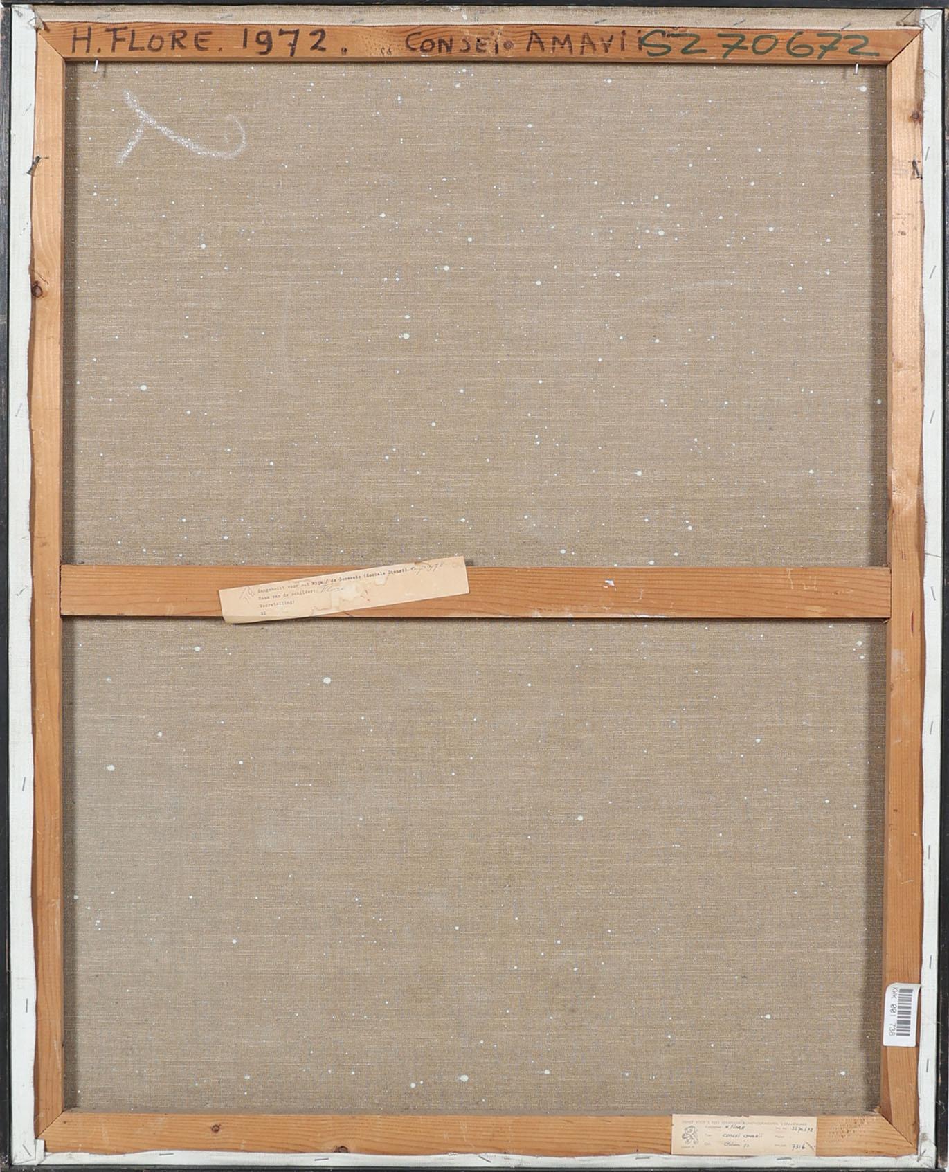 Hendrik Flore (1933), Consei Amarii, gemengde techniek op doek, gedateerd aan achterzijde Amsterdam 1972, provenance particuliere collectie/aangekocht door Dienst voor 's Rijks Verspreide Kunstvoorwerpen, 's-Gravenhage, 100 x 80 cm.