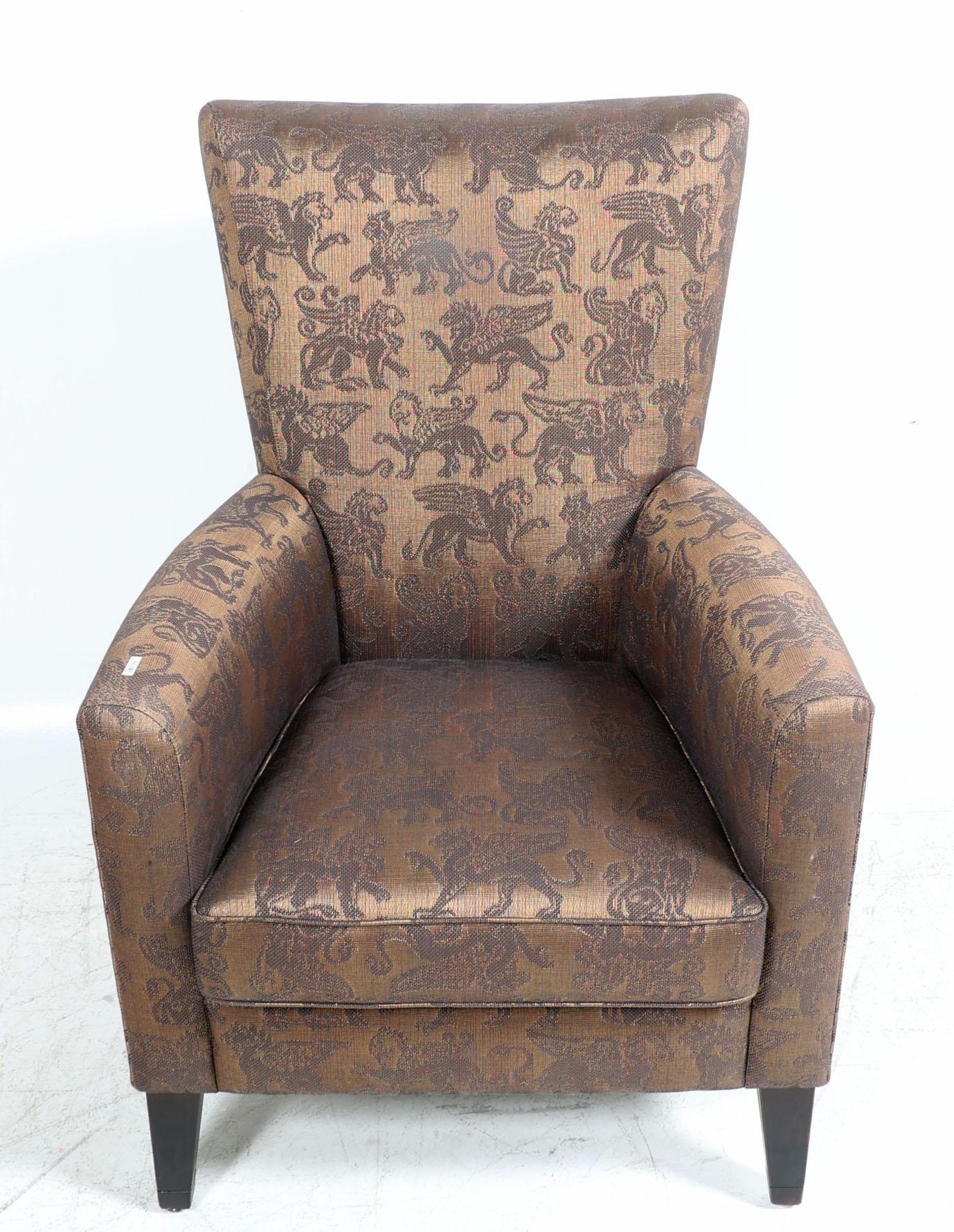 Armfauteuil met bijpassende voetenbank en de stof met decor van Griffioenen