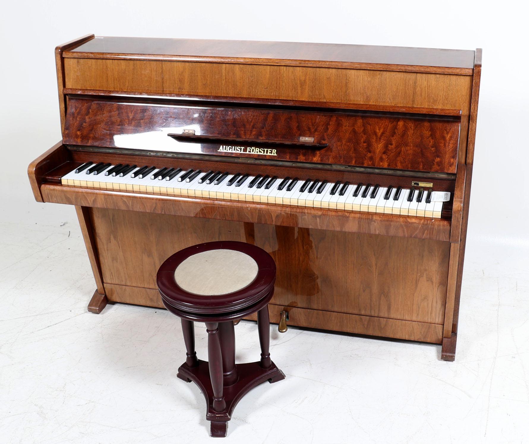 Notenhouten gefineerde piano met pianokruk