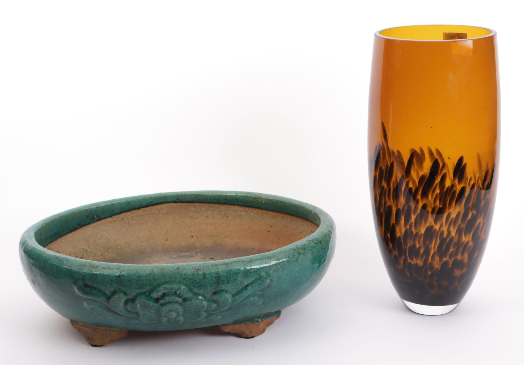 Koop van een groen aardewerken schaal en glazen vaas