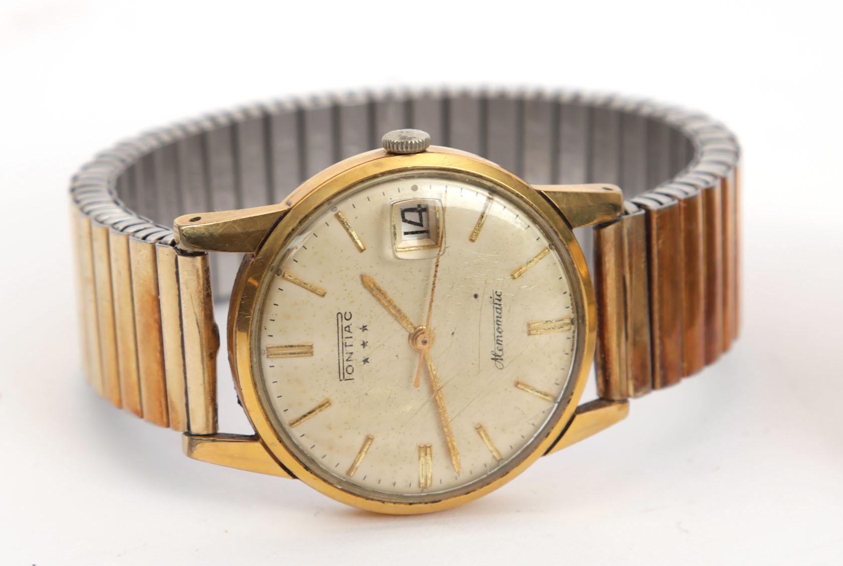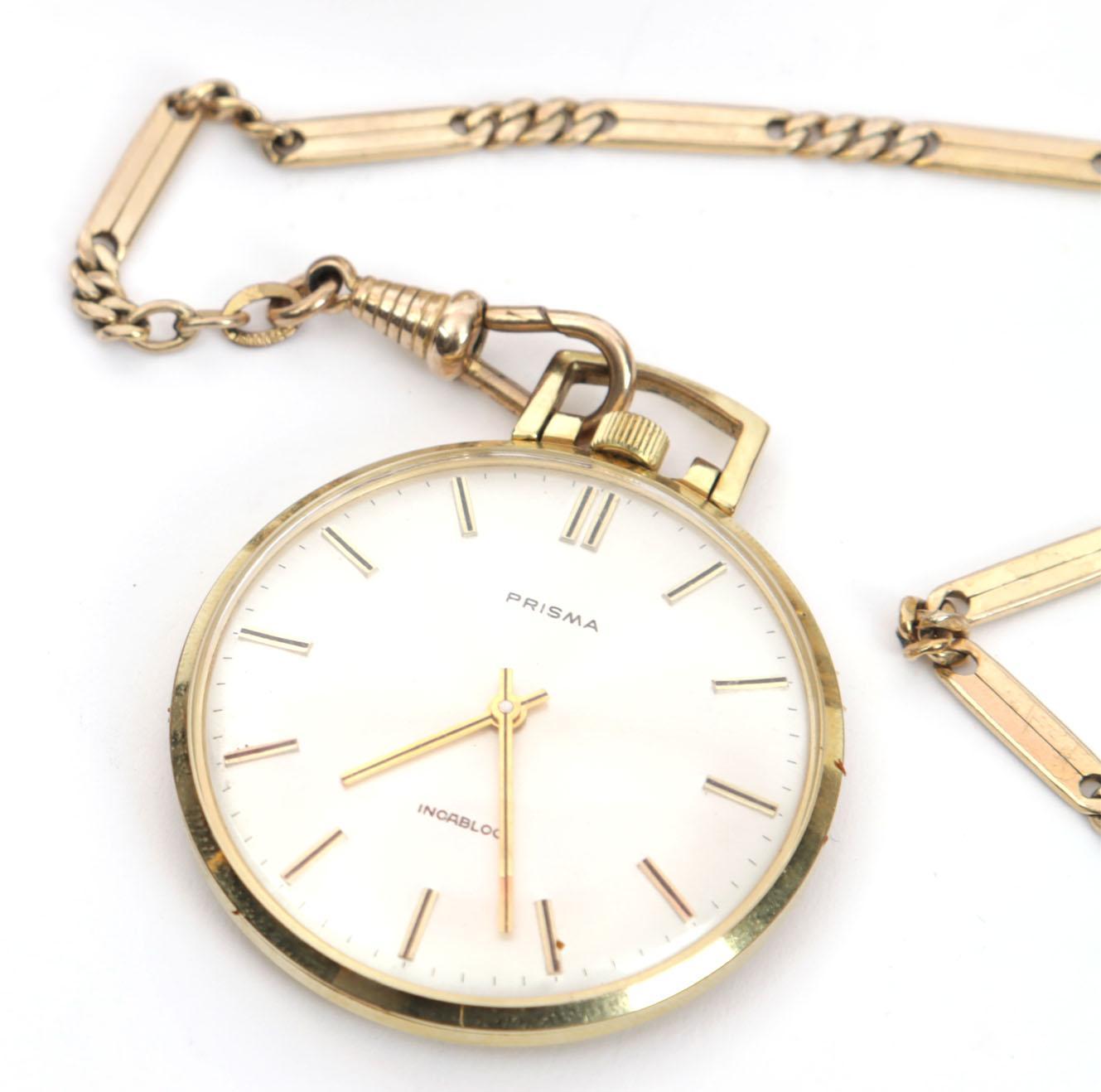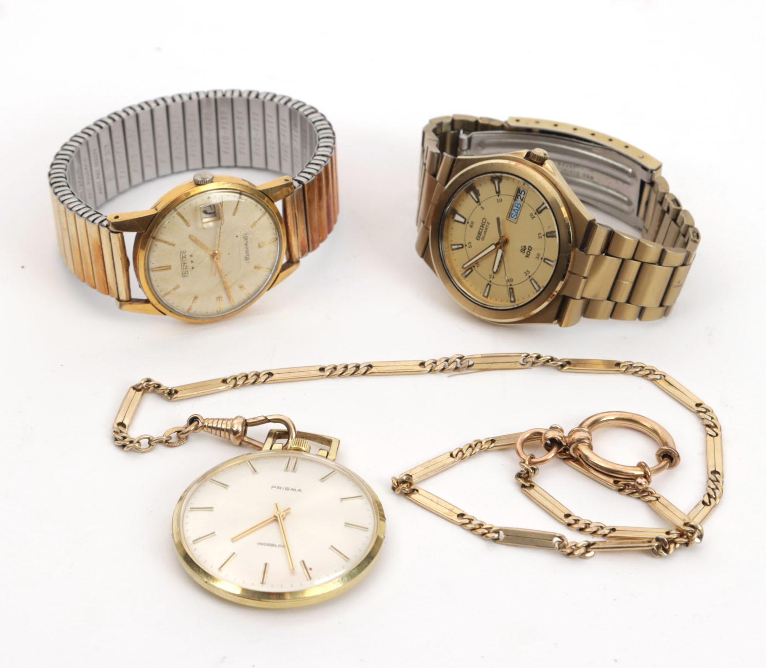 Doublé vestzakhorloge aan doublé ketting, Seiko herenpolshorloge en Pontiac vintage herenpolshorloge