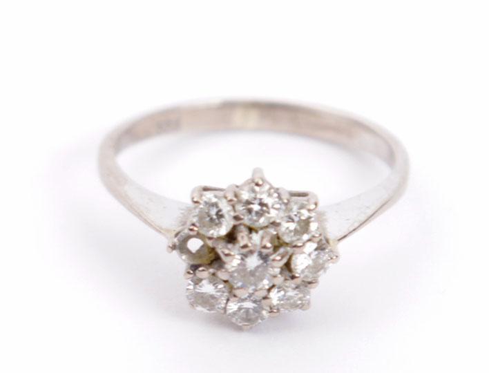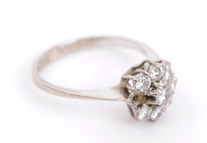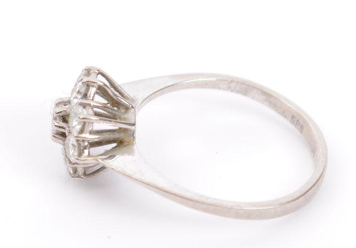 14 Kt. witgouden rozetring bezet met 8 briljantjes (1 ontbreekt), 2,3 gram