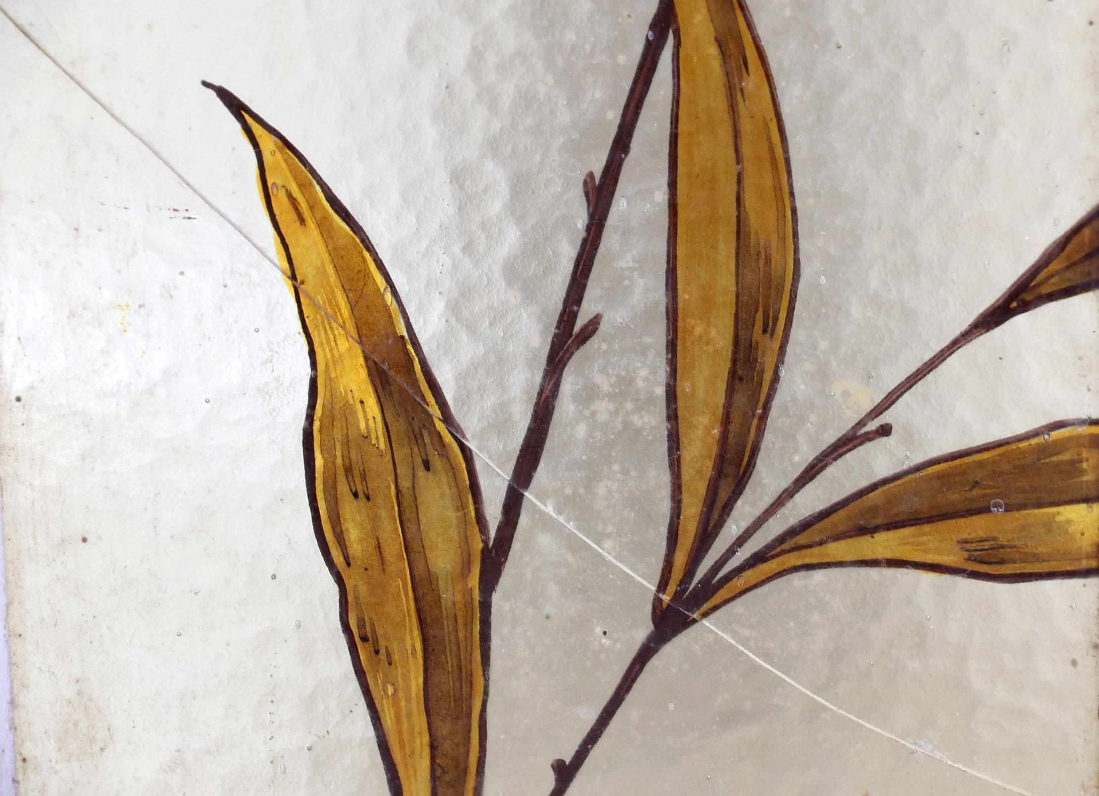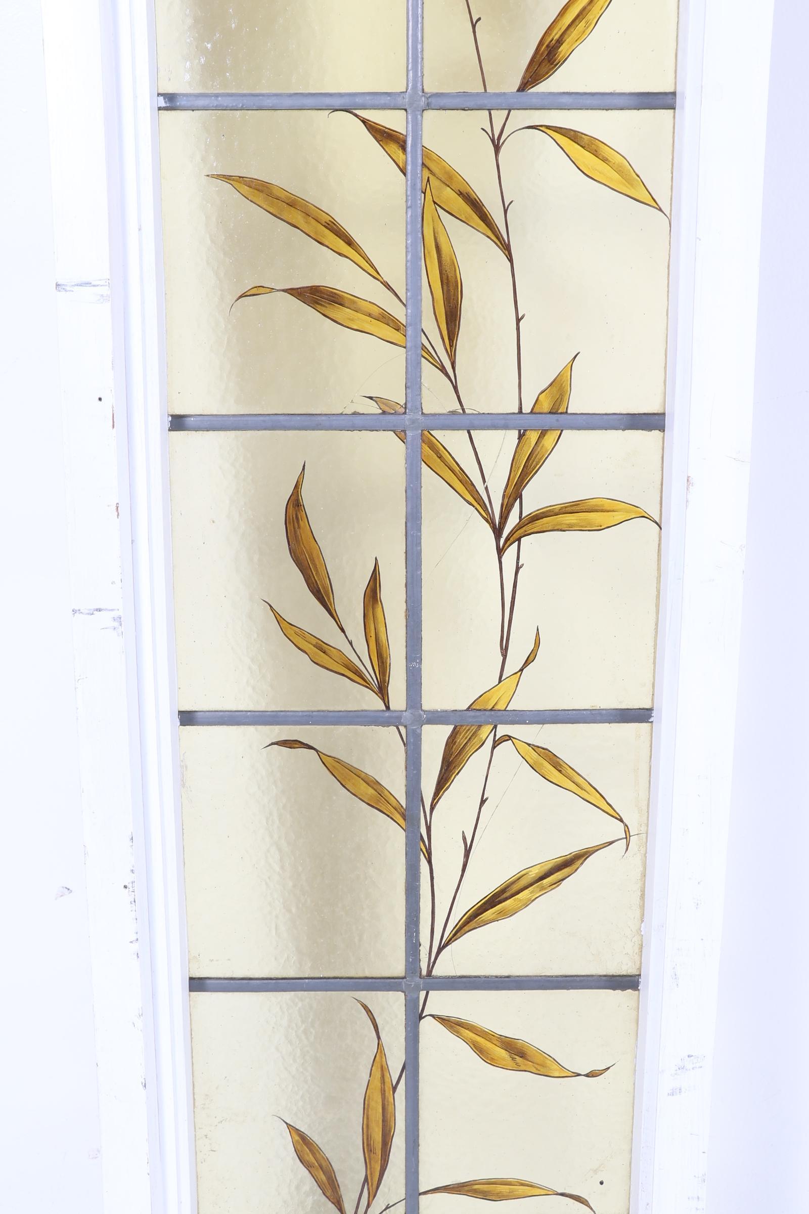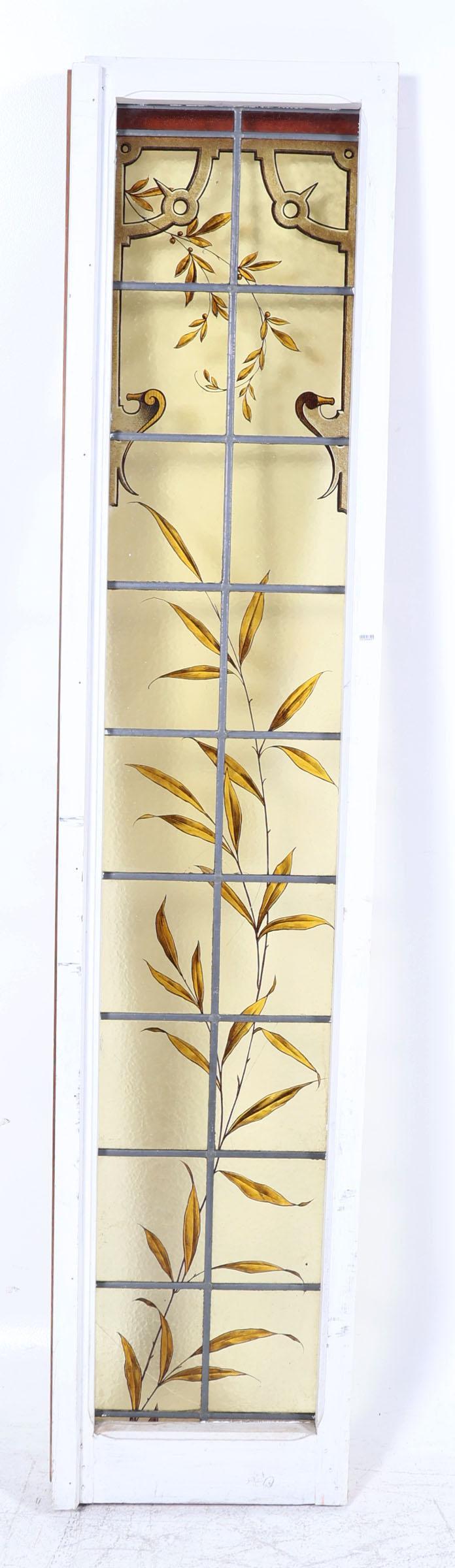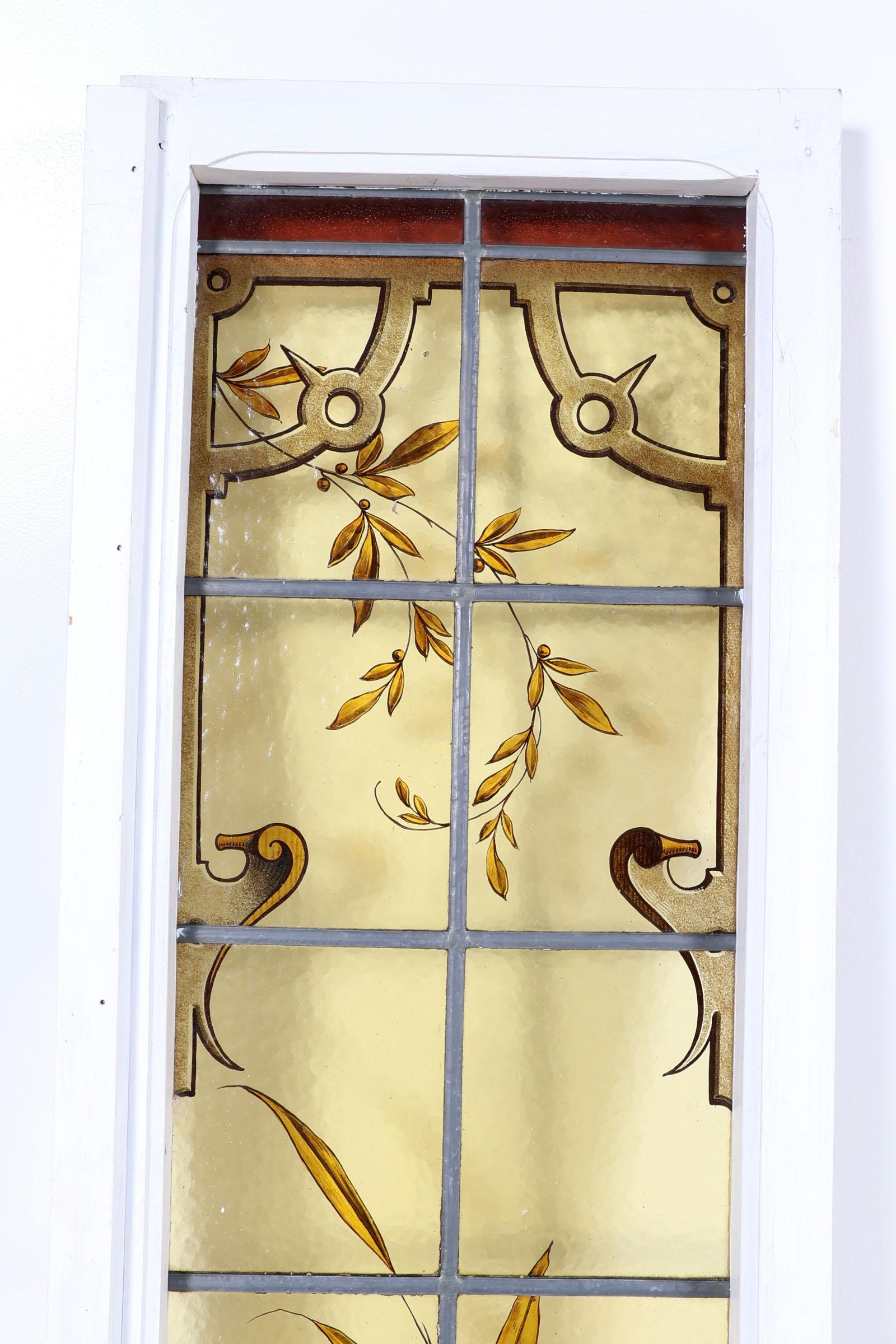Antiek gebrandschilderd glas-in-lood raam met florale motieven, maten incl. kozijn 207 x 44 cm.