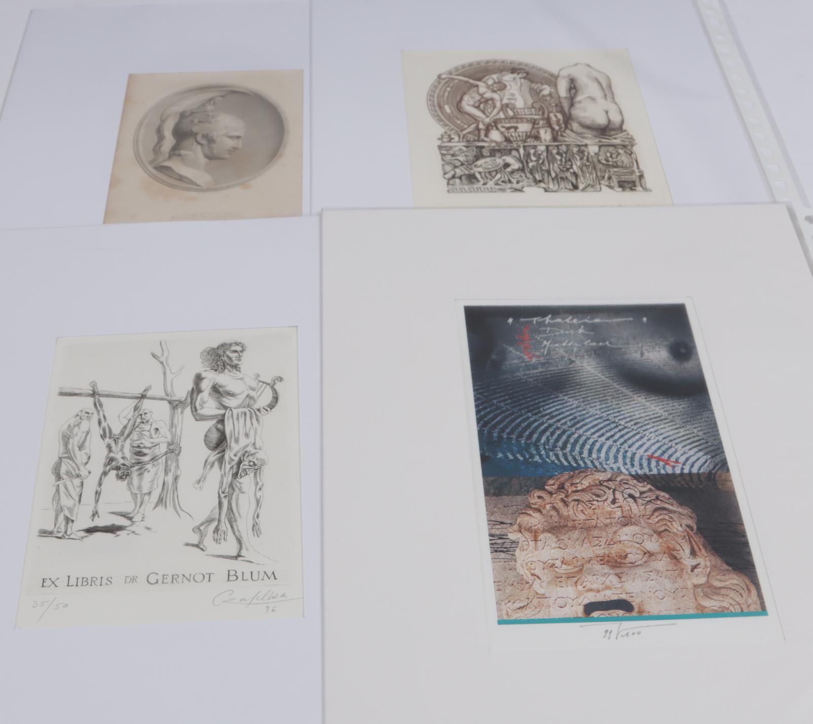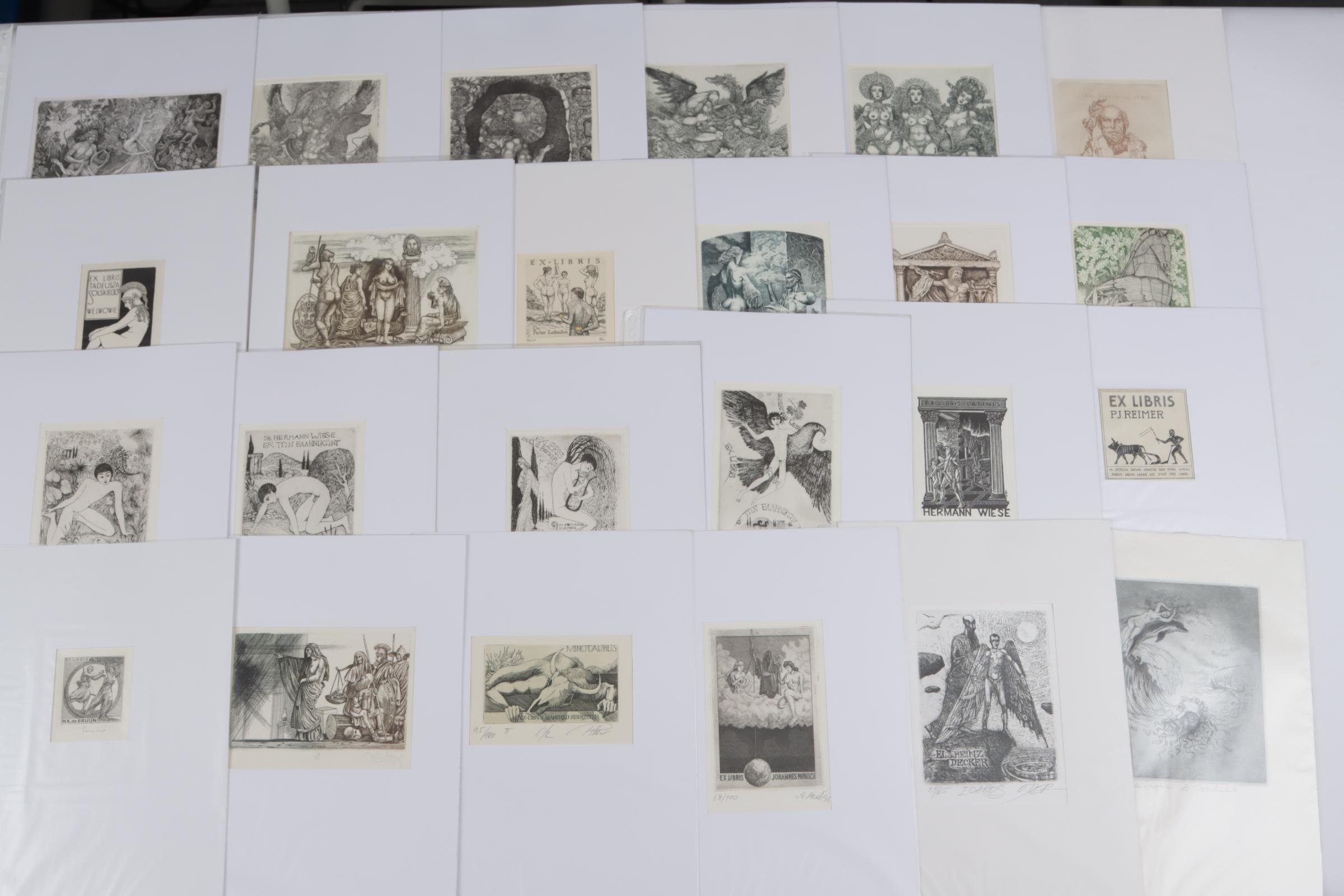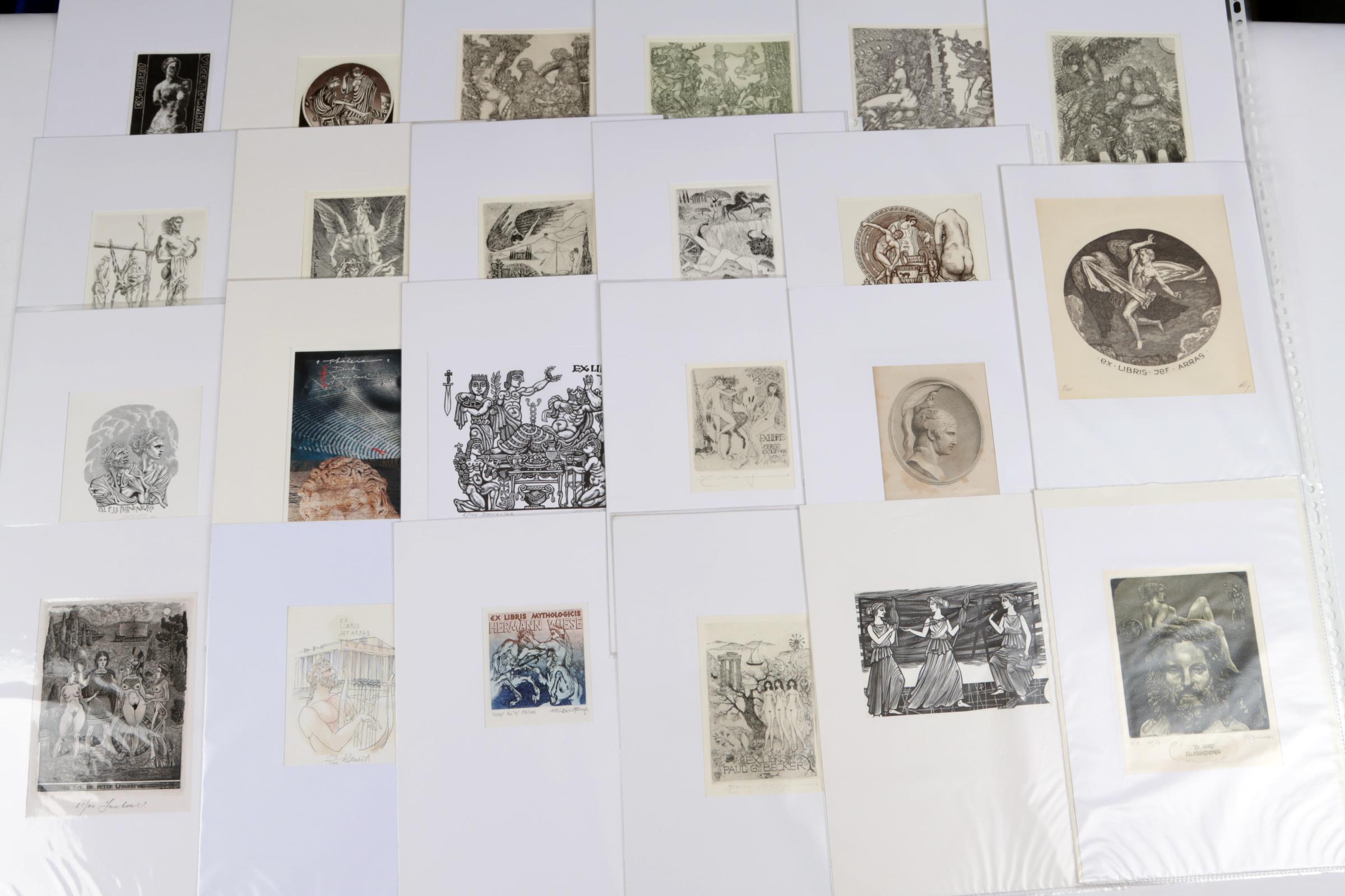 collectie van plm. 45 exlibris, thema: mythologie. Diverse technieken, plm. 35 diepdrukken, rest hoogdruk / vlakdruk. Merendeel gesigneerd, in passe-partouts. Werk van o.a. Juergens, Ondreicka, Minka, Christiaens, Bekker, Ven, Naidenov, Fleischmann, Fenchak, Weidenhaus.