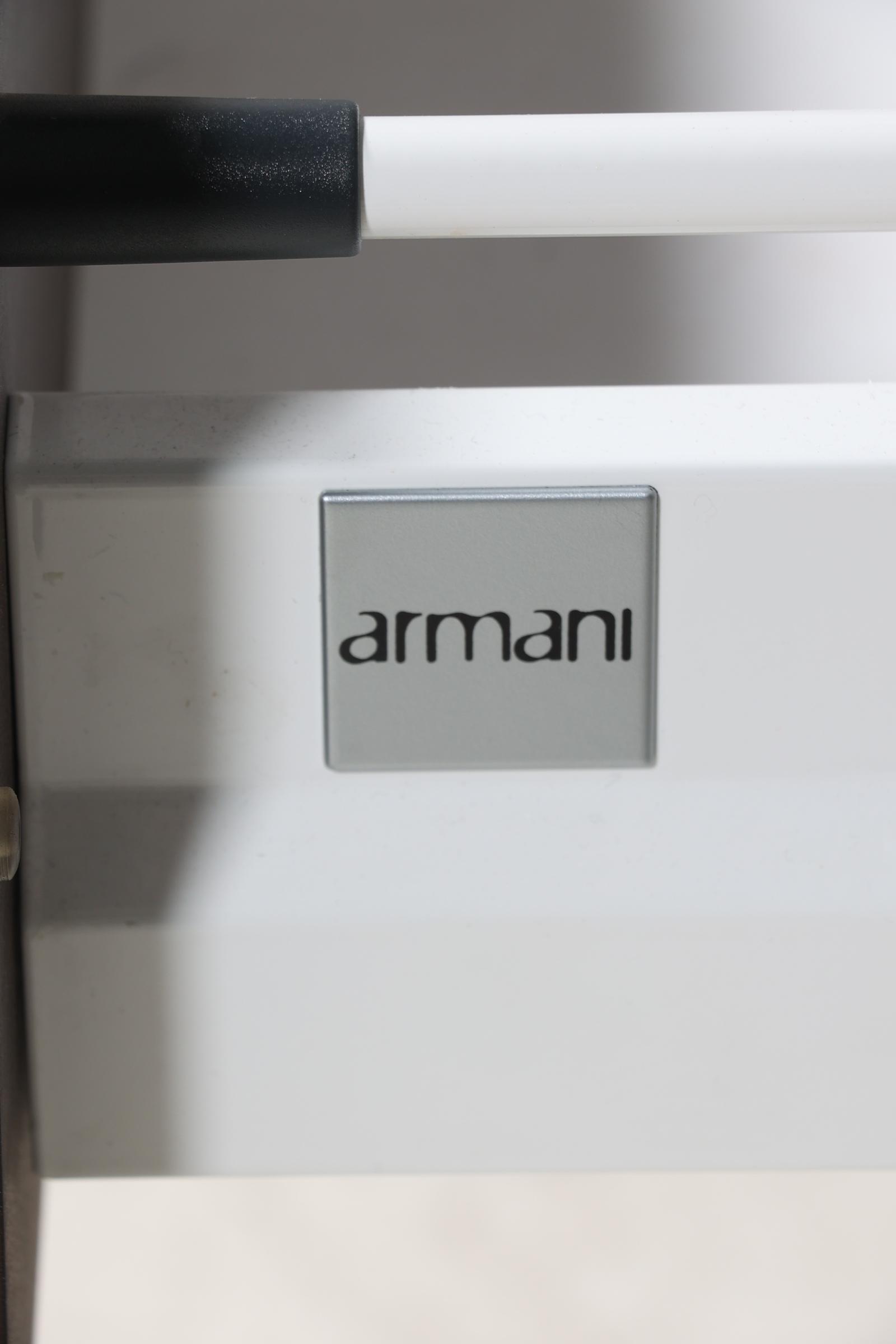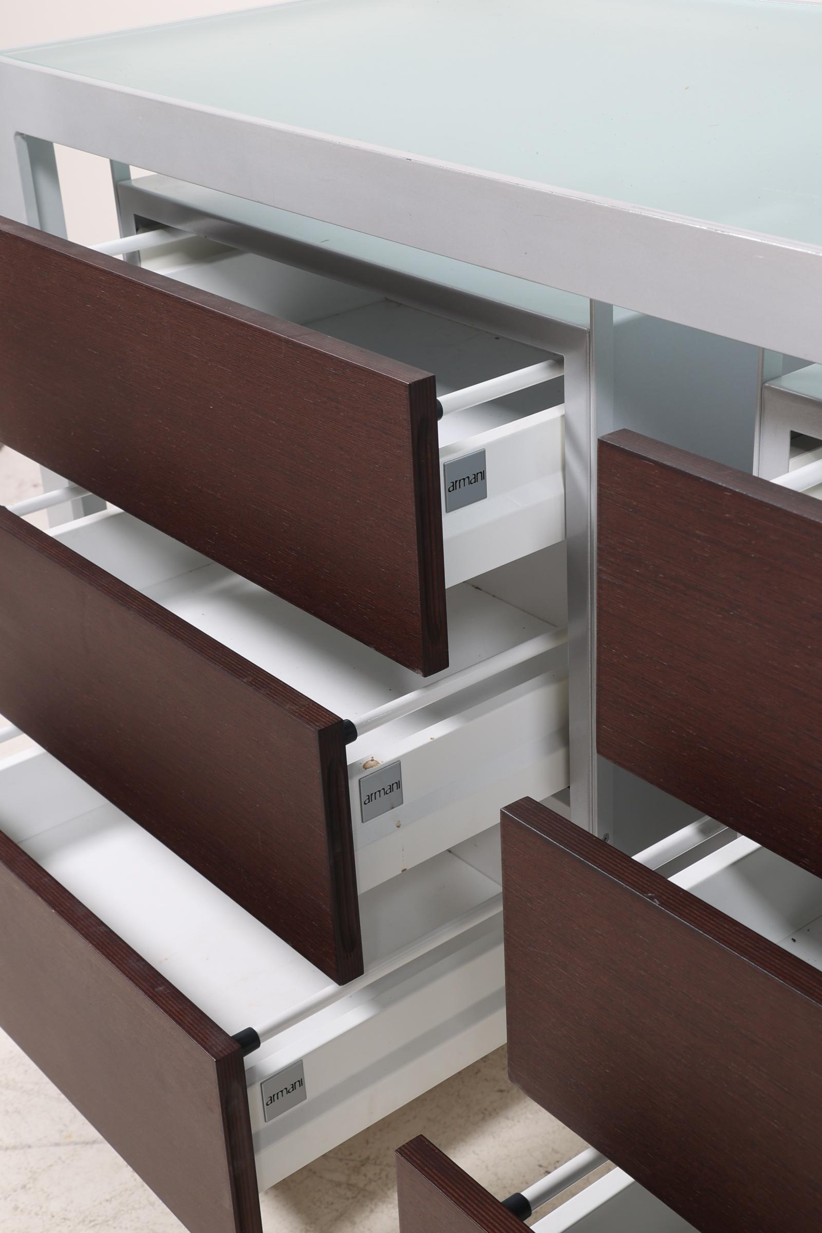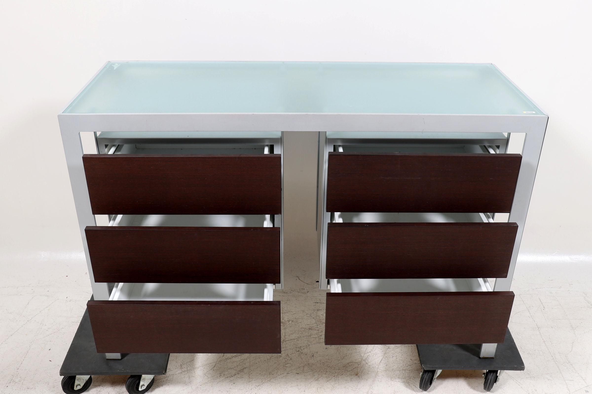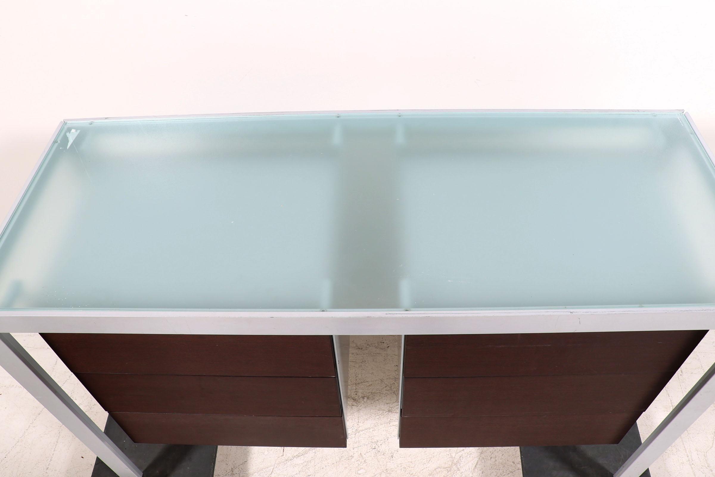Monica Armani, modern metalen dressoir met glasplaat en daaronder 2 hangende ladeblokken, h.90 x b.133 x d.50 cm.