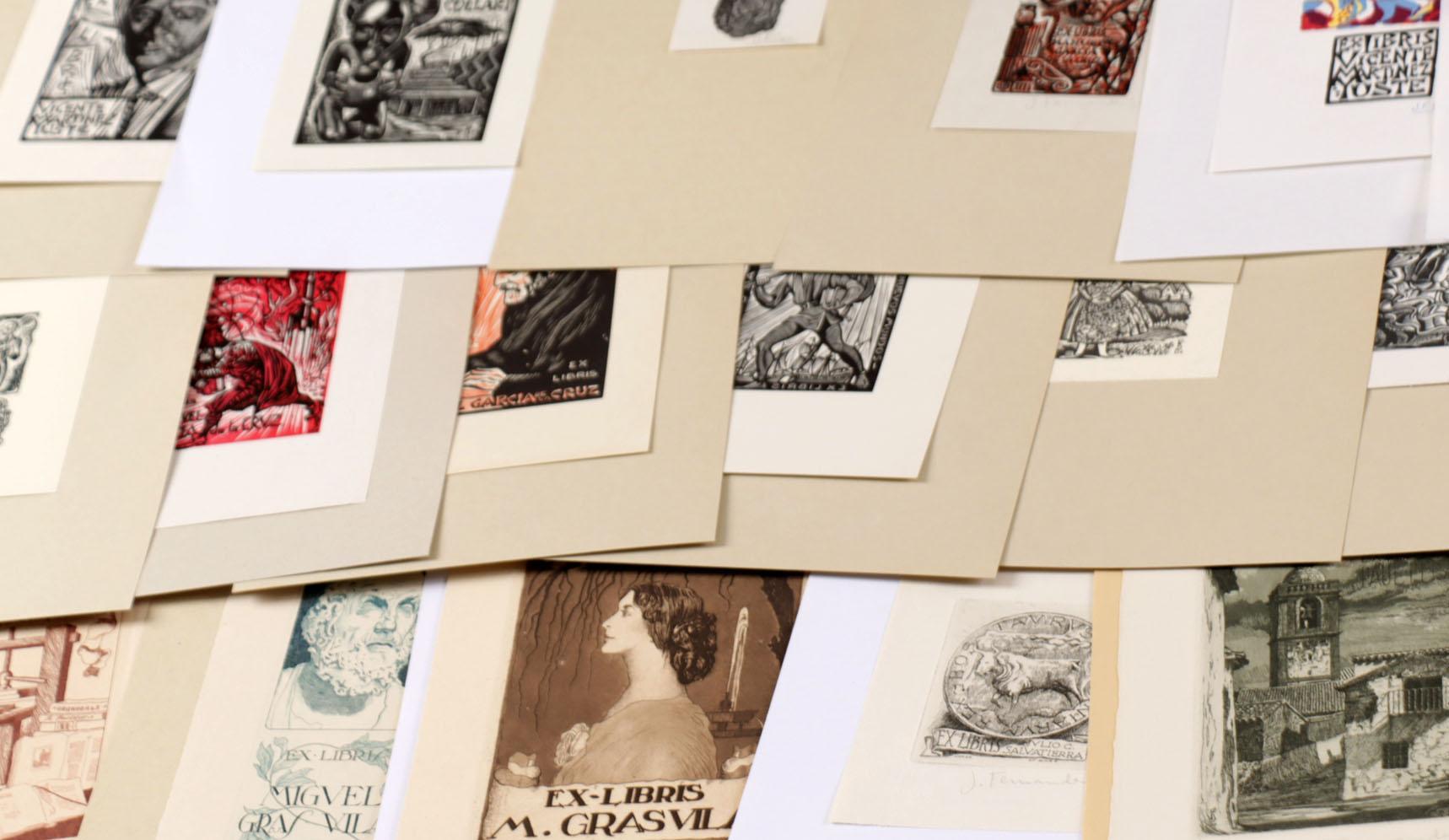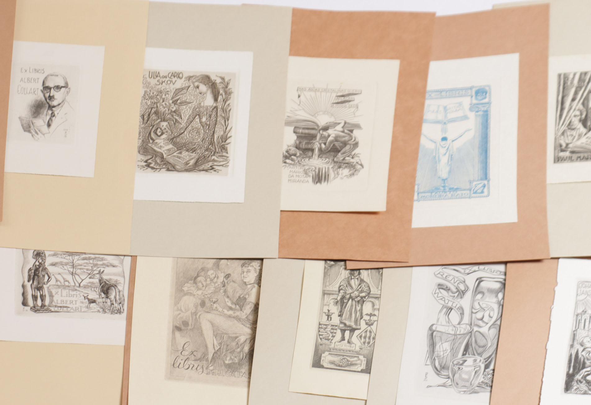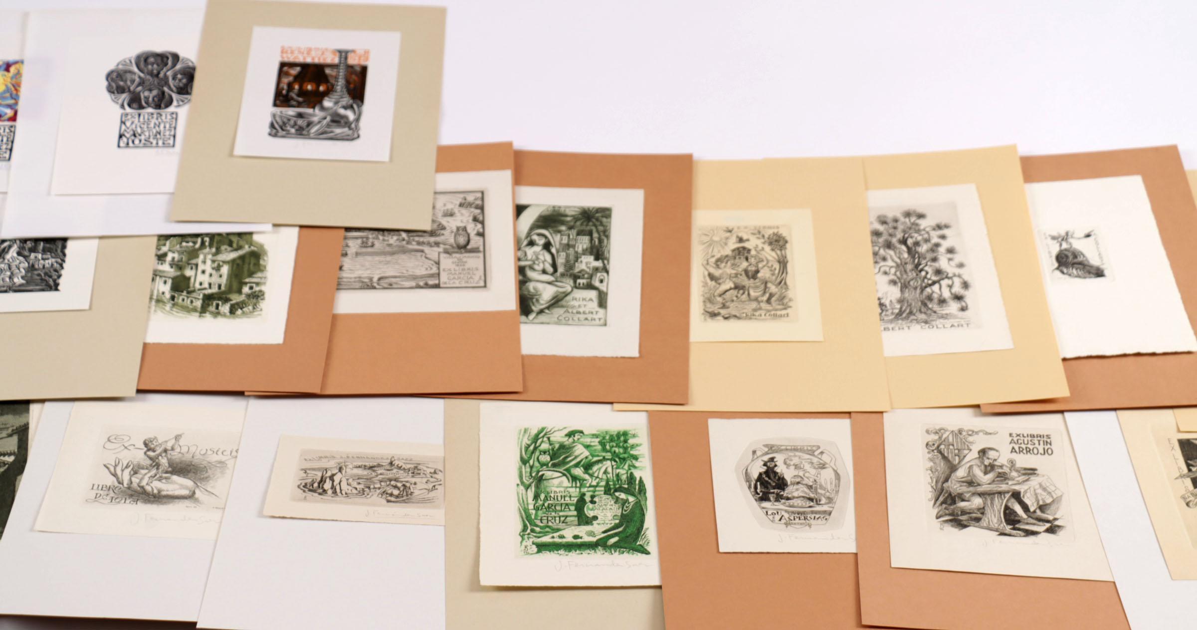 Saez, J.F. (Spanje), plm. 40 exlibris (25 x diepdruk, rest hoogdruk / vlakdruk), deels gesigneerd, opgeplakt. Plus 3 exl. Julibert, Falgas.