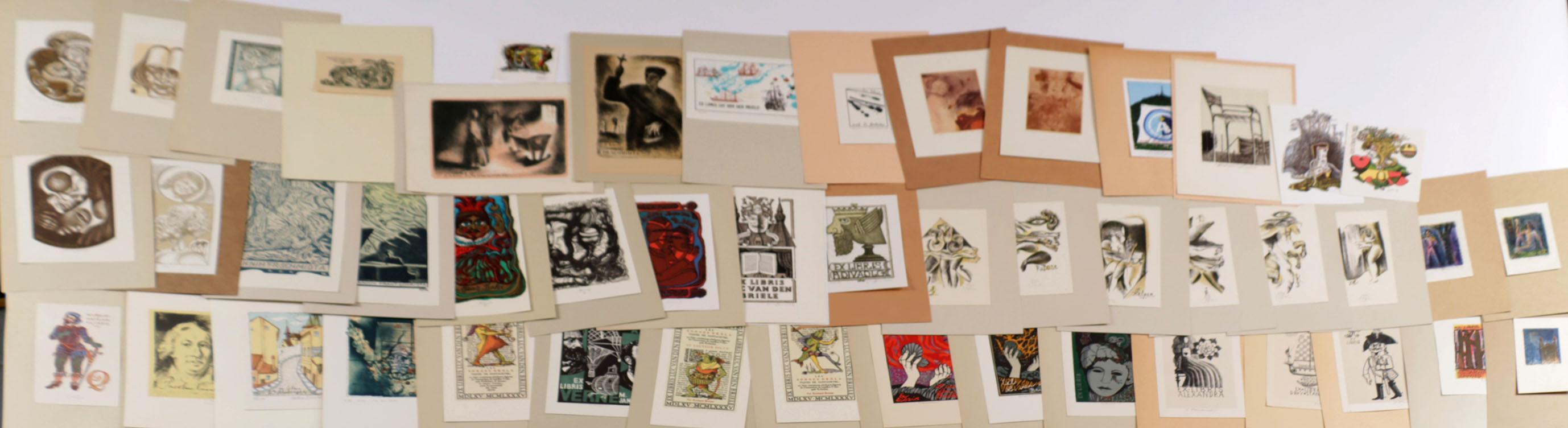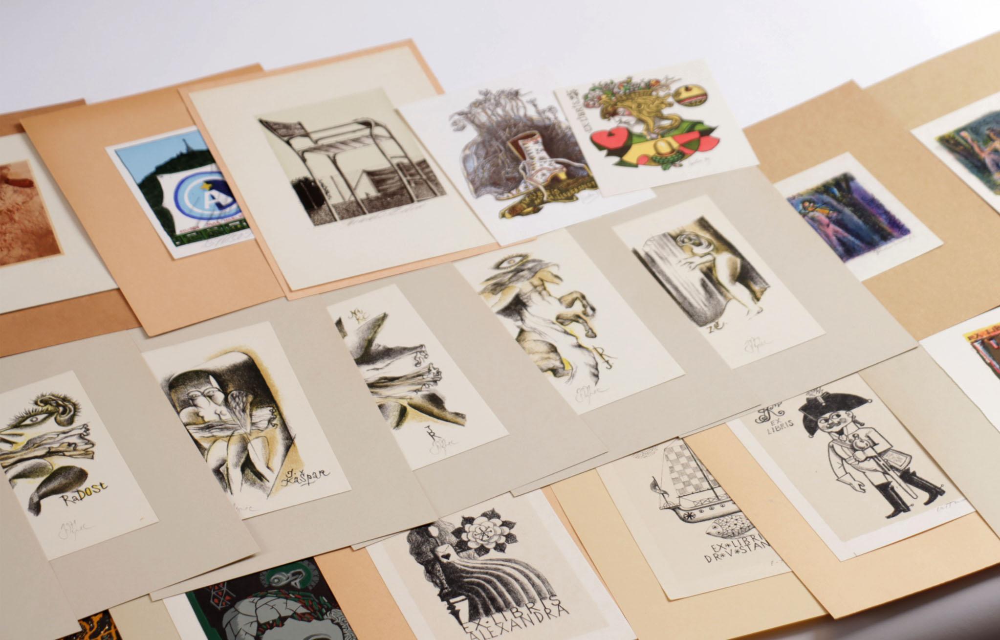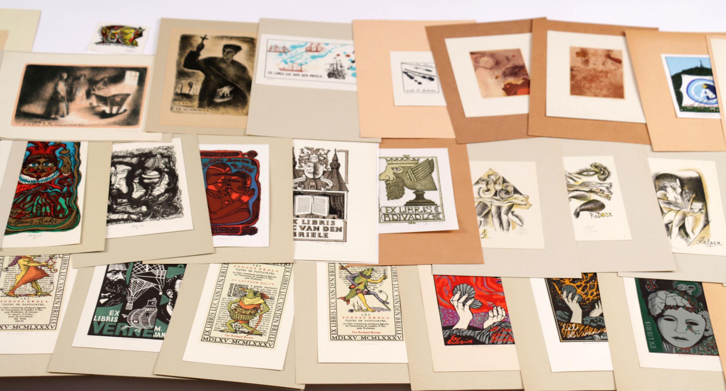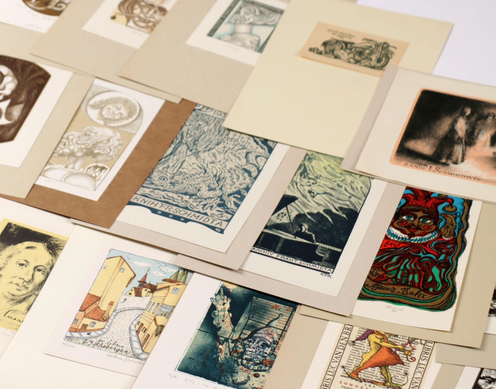 collectie plm. 50 exlibris / kleingrafiek, gemaakt door kunstenaars uit Tsjechië, litho. Deels gesigneerd, opgeplakt. Werk van o.a. Bim, Jirka, Mahelka, Liesler, Jicha, Horanek, Konupek, Uiberlay, Toman, Erazim, Vesely, Kaspar.