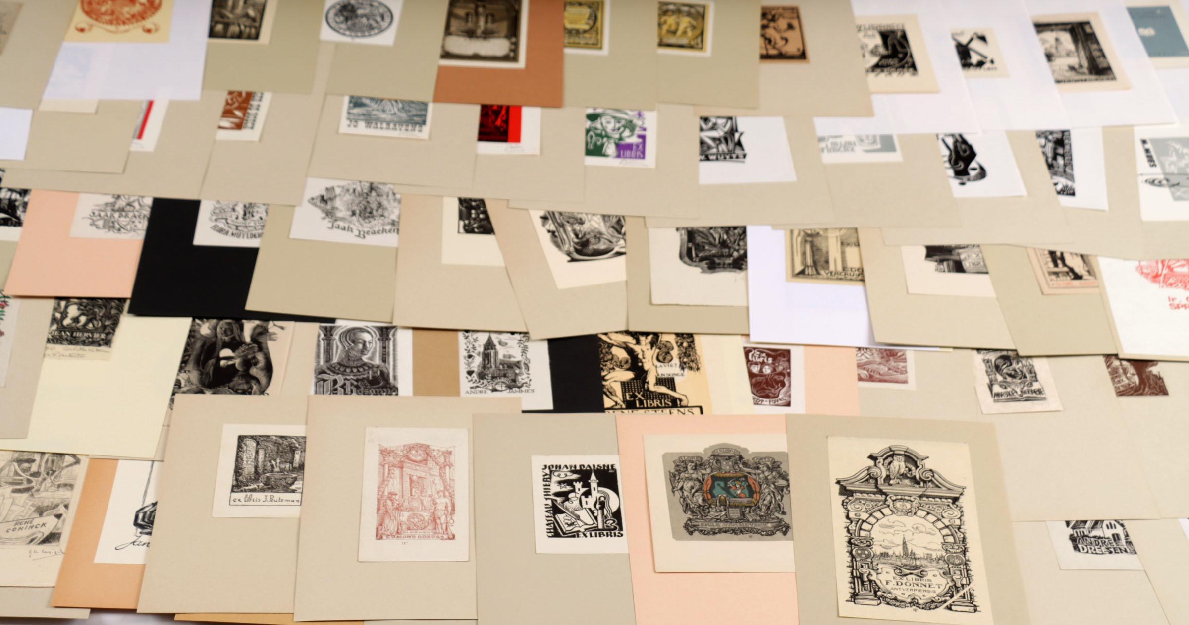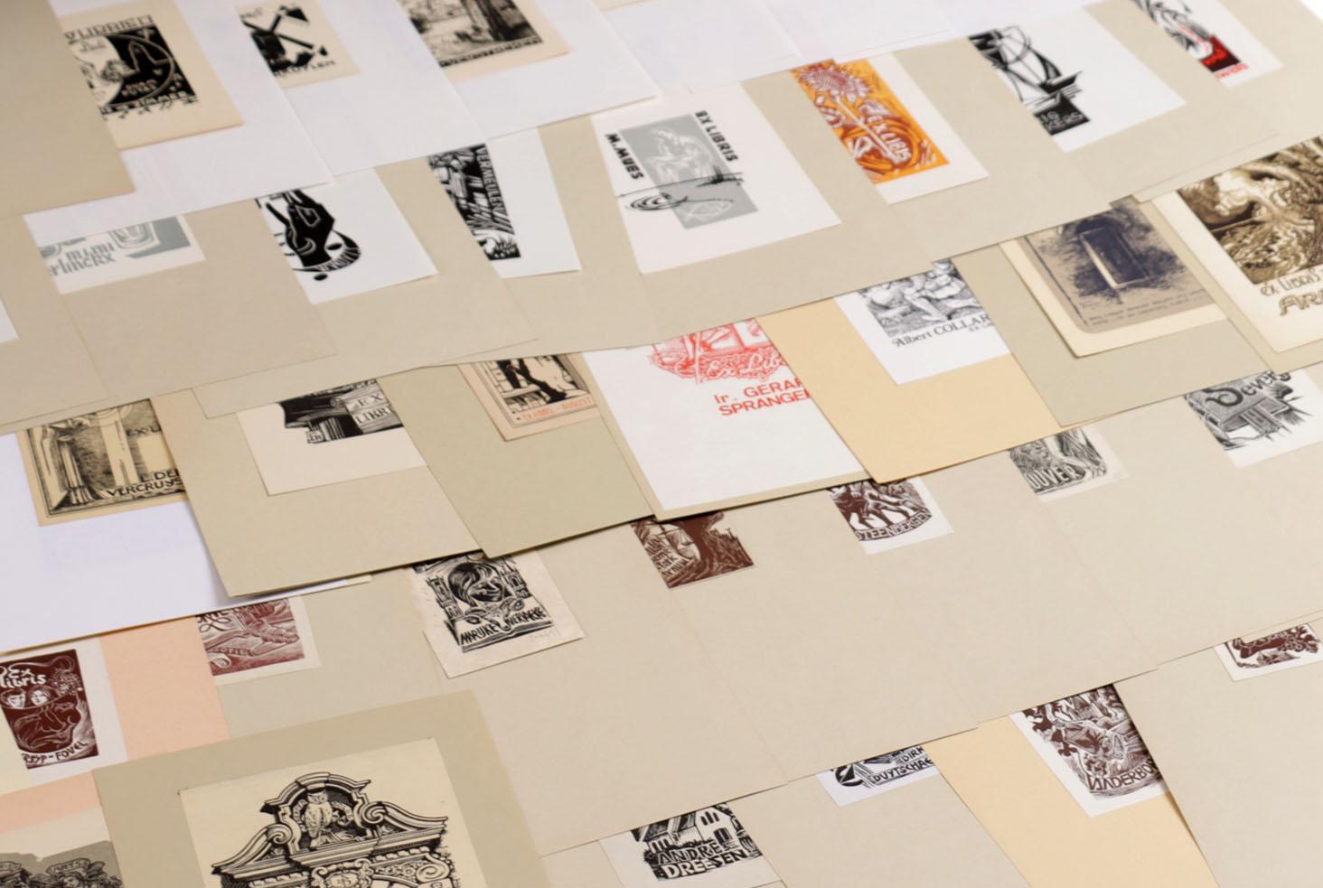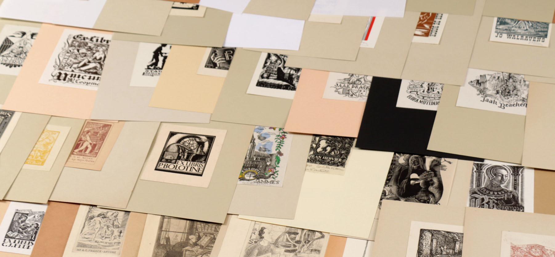collectie plm. 80 exlibris, gemaakt door Belgische kunstenaars, hoogdruk / vlakdruk. Deels gesigneerd, opgeplakt. Werk van o.a. Jul. Severin, Van Ael, G. de Bruyne, Resls, Eygelshoven, Van Neste, Dupond, Pellens.