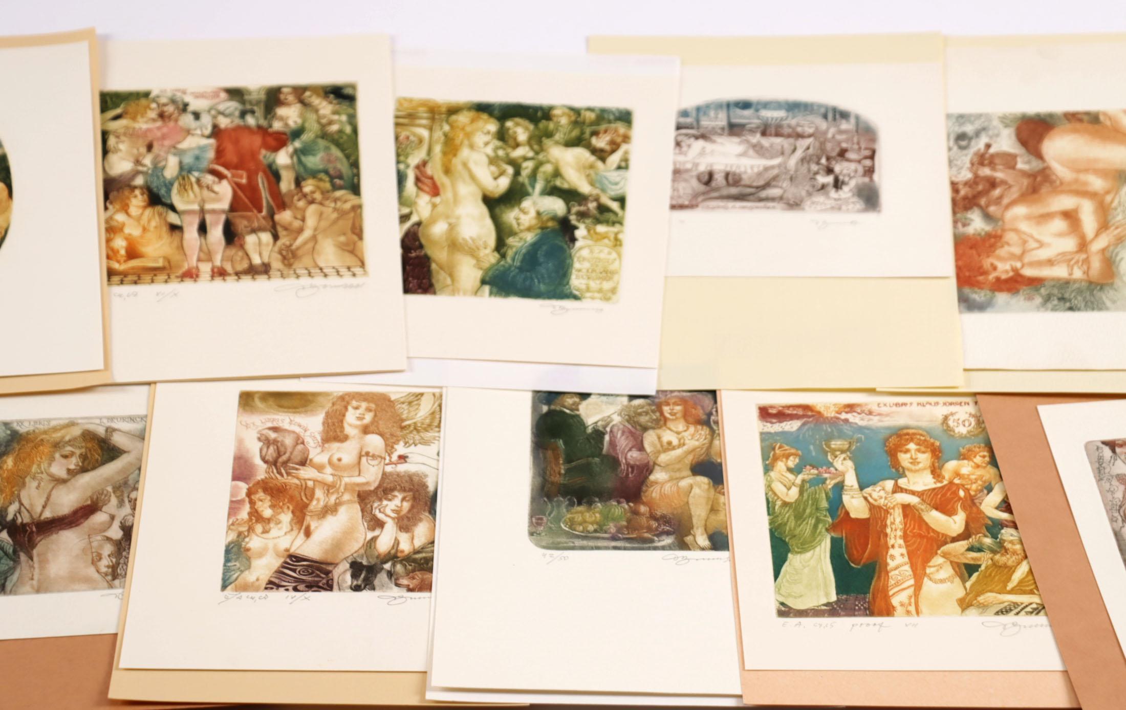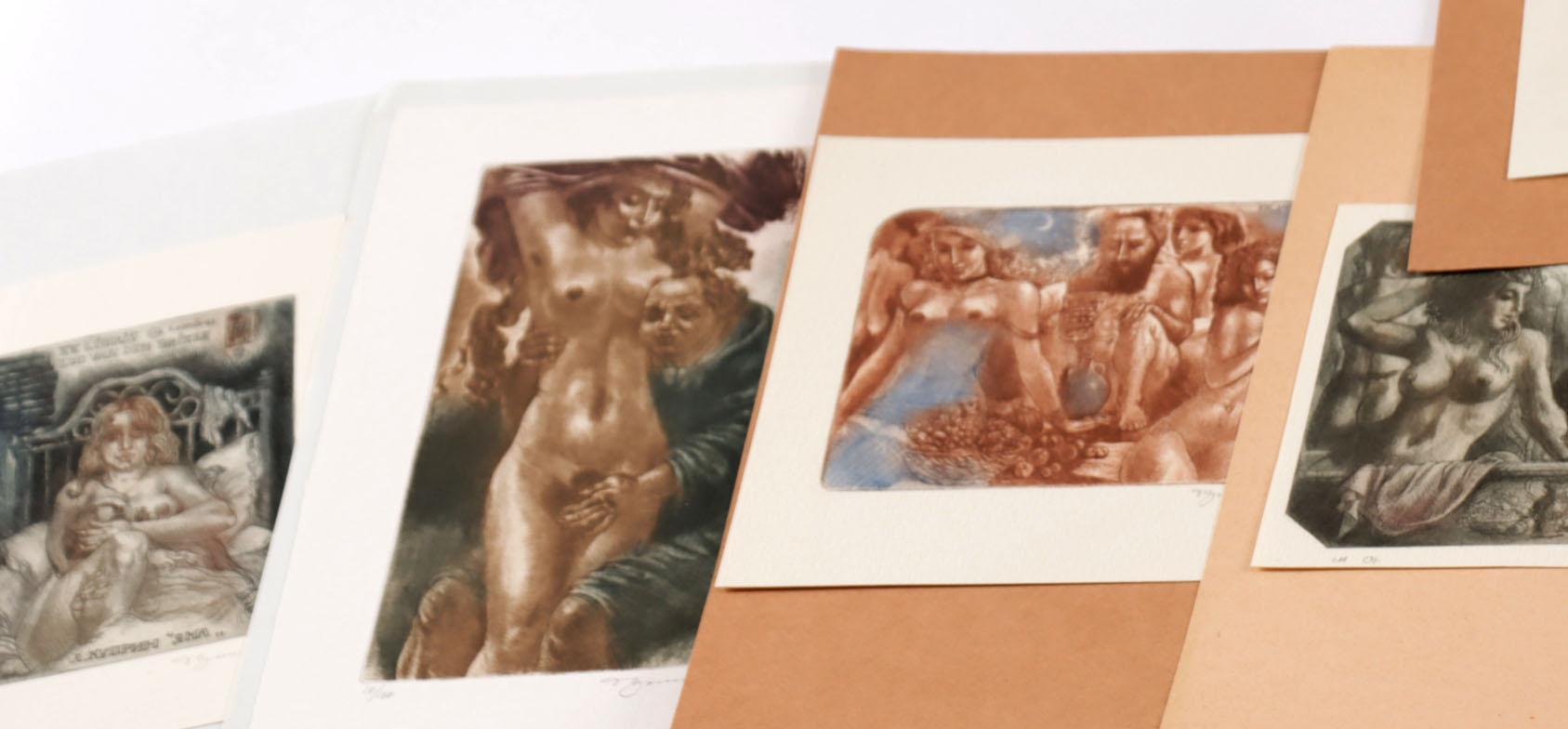 Bekker, D. (Ukr.), plm. 25 exlibris, diepdruk, alle gesigneerd, opgeplakt. Alle: vrouwelijk naakt / erotisch. Voor o.a. Smits, Lenten, Rosen, Thoms, Paalasmaa, Blum, Hausweiler, Metsavir, Skovenborg, Stransky.