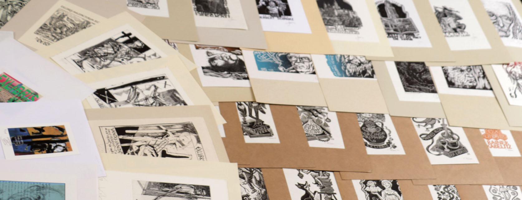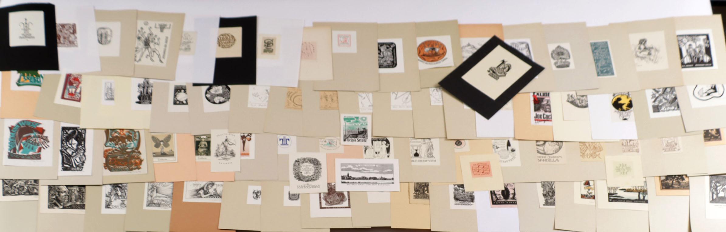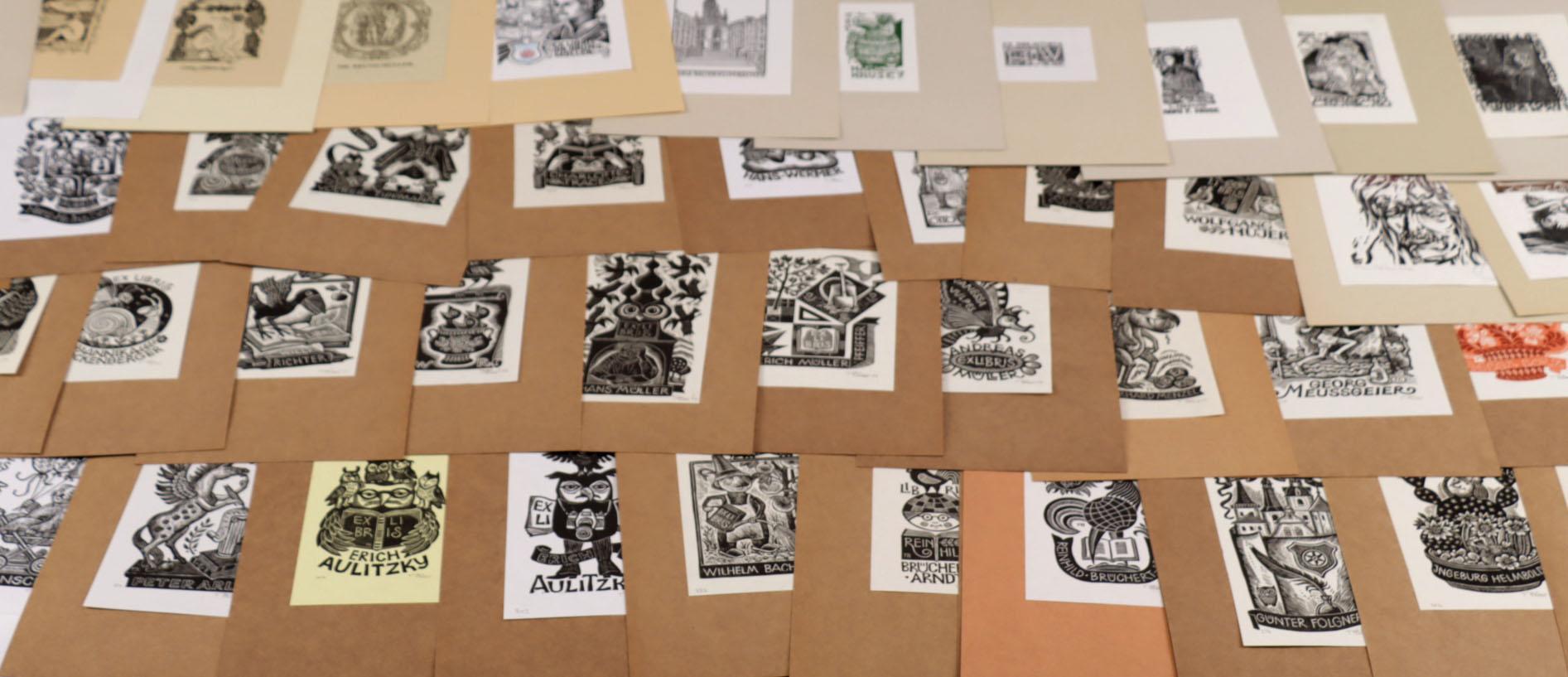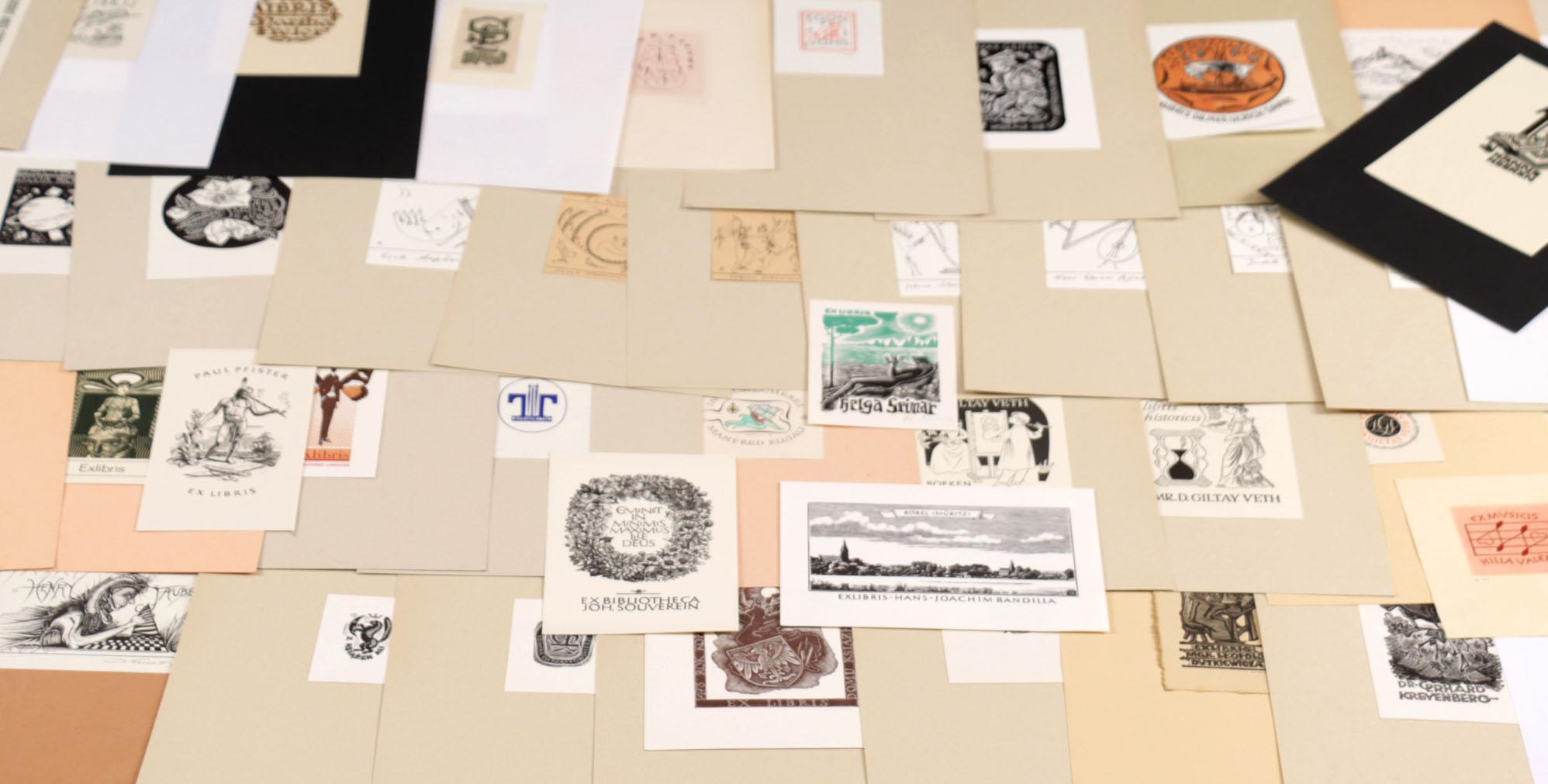 collectie plm. 220 exlibris, gemaakt door kunstenaars uit Duitsland. Hoogdruk / vlakdruk, deels gesigneerd, opgeplakt. Werk van o.a. W. Richter (50x), Schroth (8x), Sos (10x), Strobel-Matza (17x), Knabe (3x), Horodisch (4x), Lange (5x), Xago (8x)