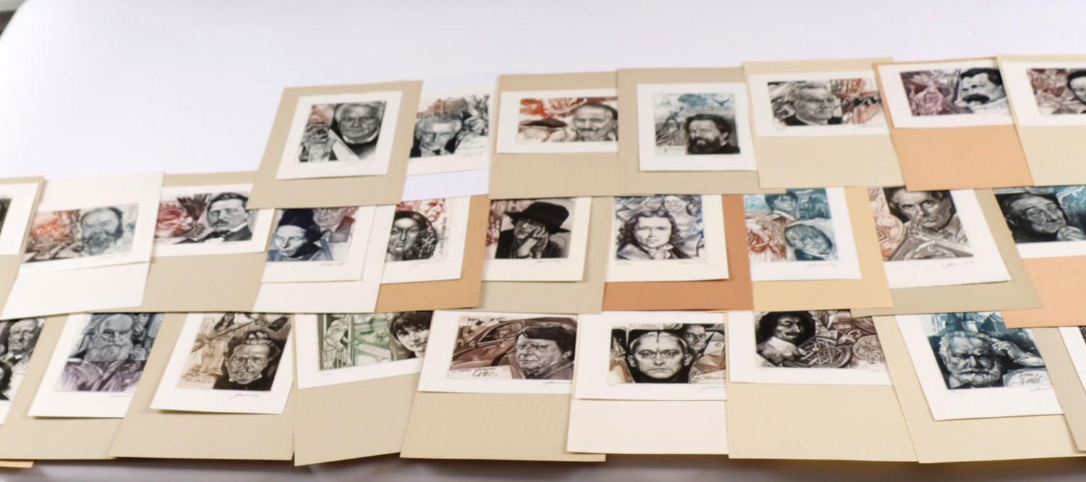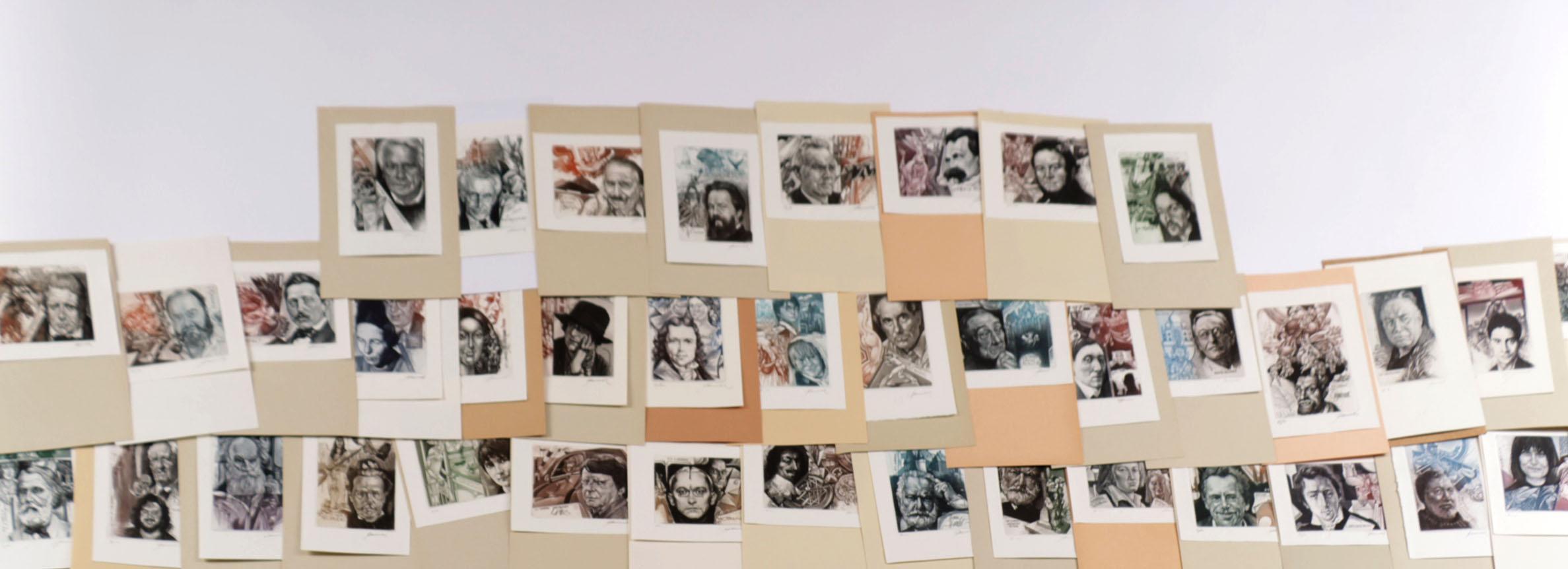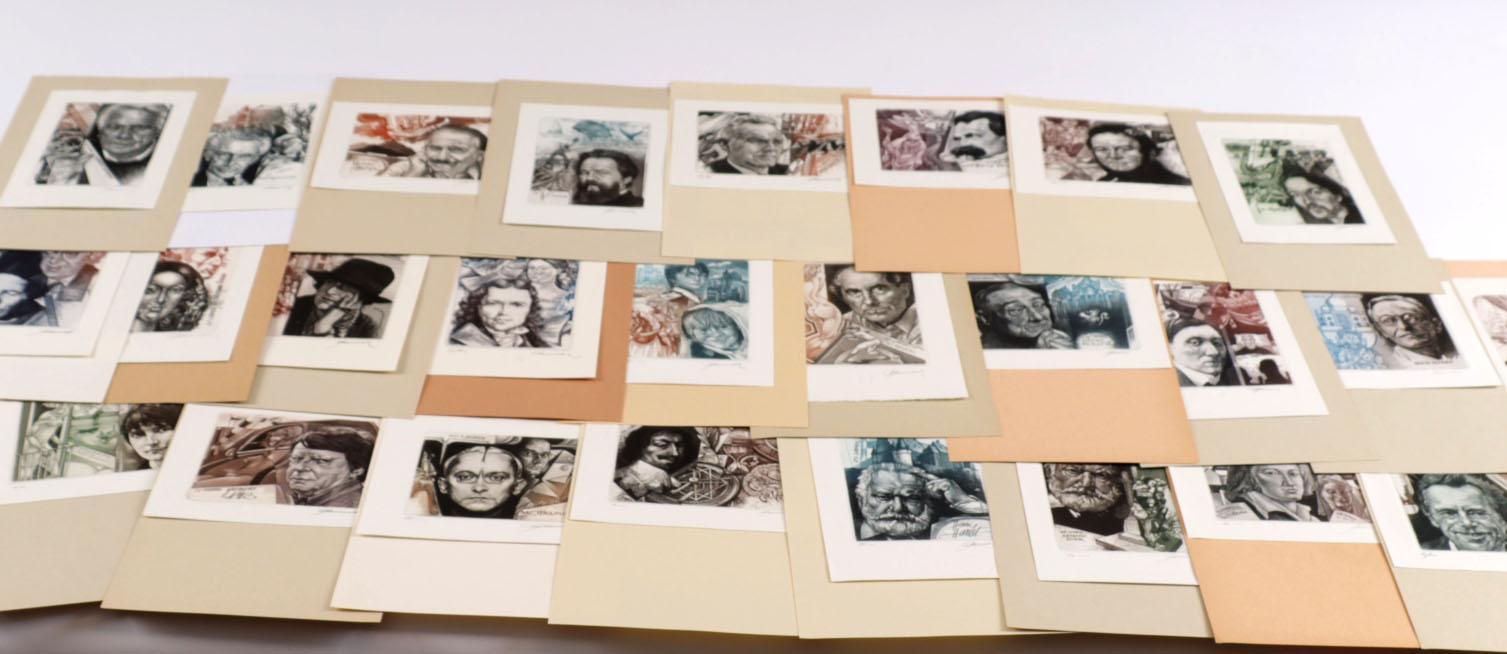 Pauwels, H. (België), plm. 40 exlibris, diepdruk (C3C5), alle gesigneerd. Portretten van o.a. Toergienev, Jackson, Tolatoi, May, Mansfield, Lampo, Lanoye, V. Hugo, V. Havel, Heine, Hemingway, Kafka, Rabelais, Hesse, Roth, Sand, W. Scott, Semprun, Stevenson, Mulisch, Melville.