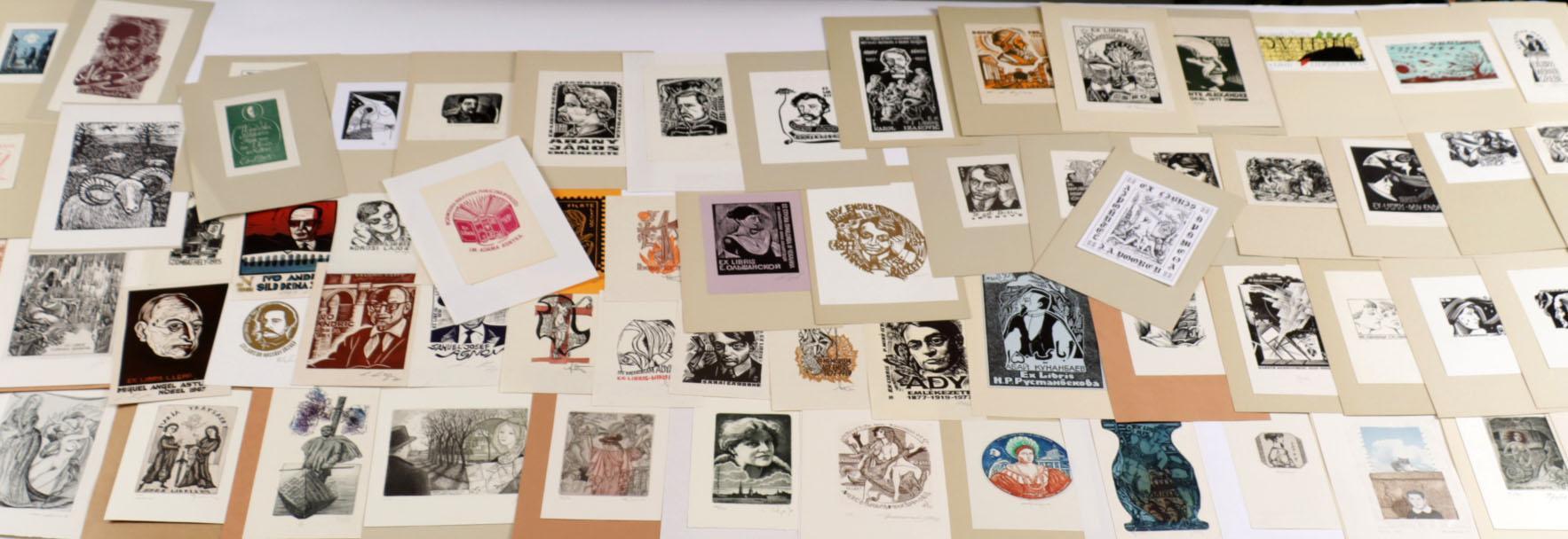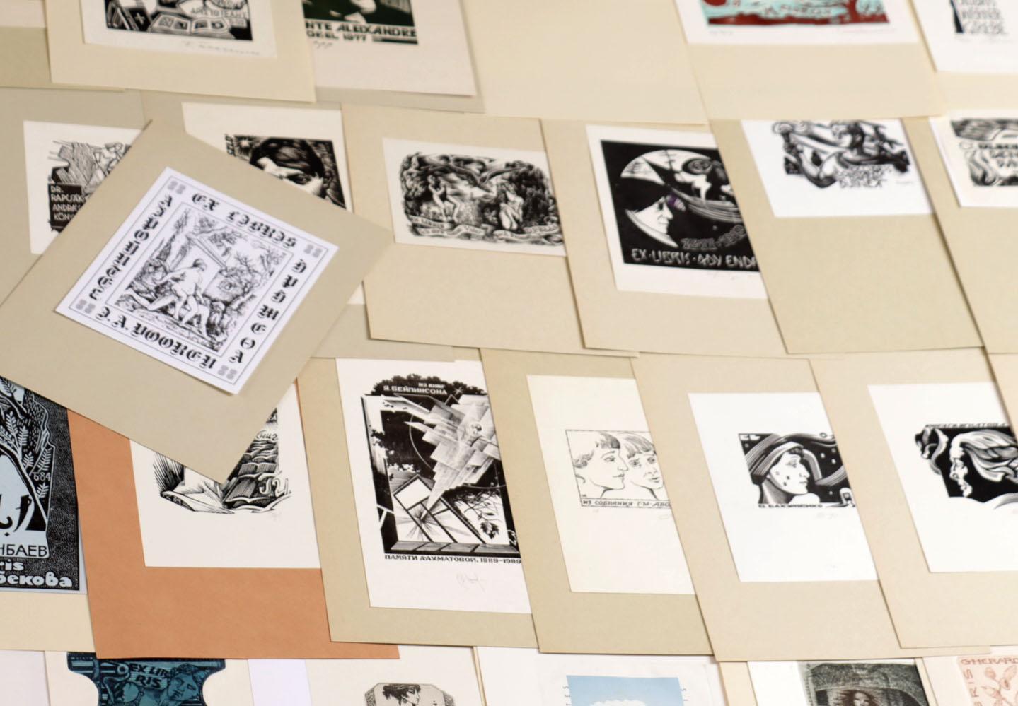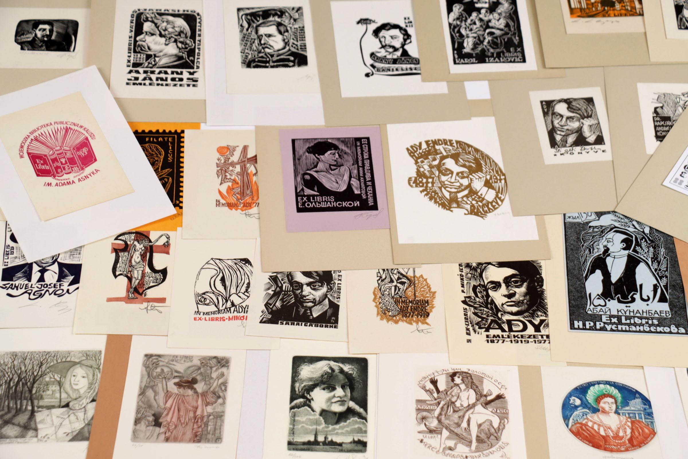 collectie plm. 85 exlibris, thema: literatuur / schrijvers (met de letter A). 16 x diepdruk, rest hoogdruk / vlakdruk. Deels gesigneerd, deels opgeplakt. Werk van o.a. Antimonova, Sasalino, Hlavaty, Jirincova, Rovegno, Keller, Raub, Bekker, Ven, Steenvoorden, Henault.