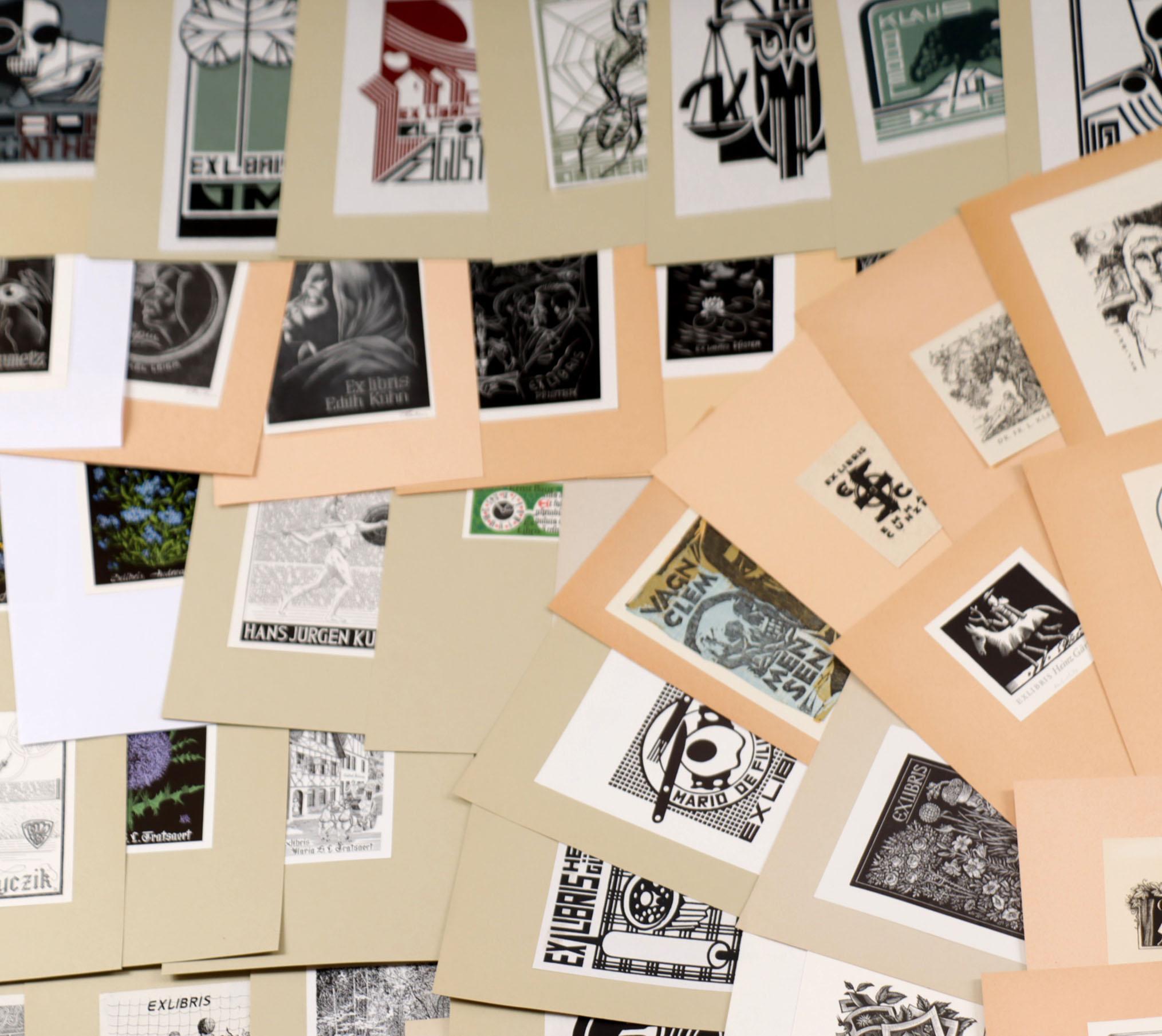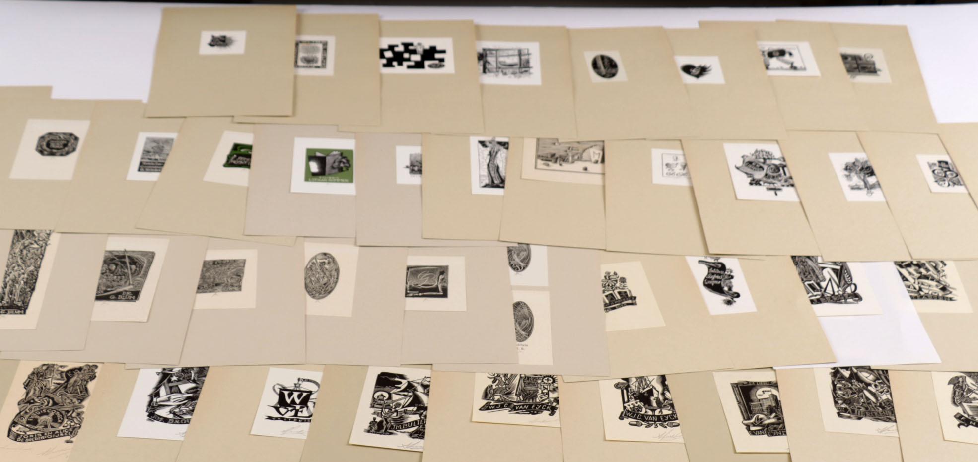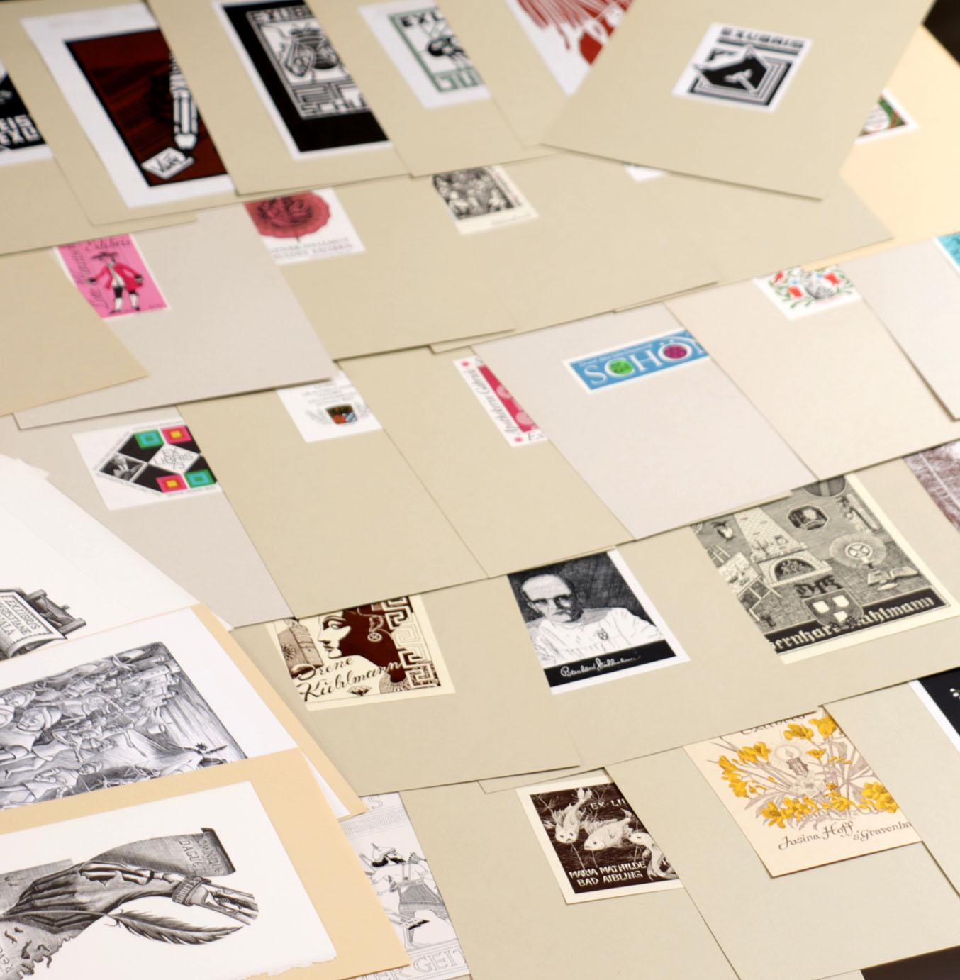 collectie plm. 180 Duitse exlibris, hoogdruk / vlakdruk. Deels gesigneerd, opgeplakt. Werk van o.a. Hmmermann (39x), Herckenrath (24x), Herfurth (15x), Guenther (21x), Kuchenbauer (27x), Kuehlmann (38x)