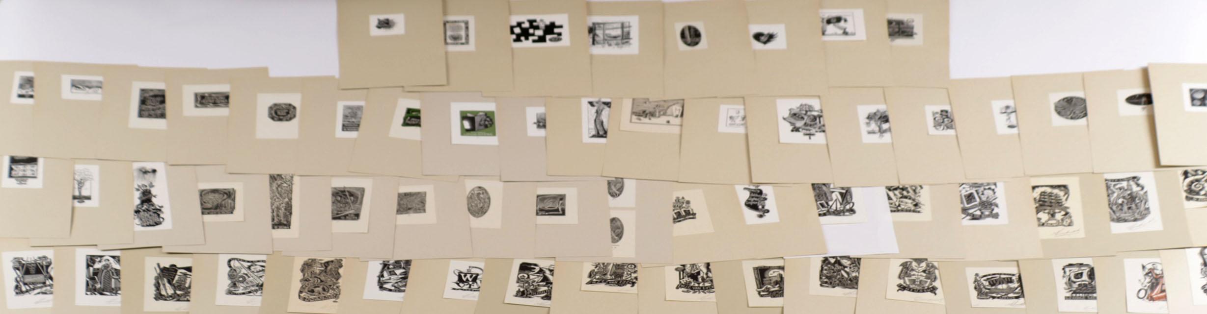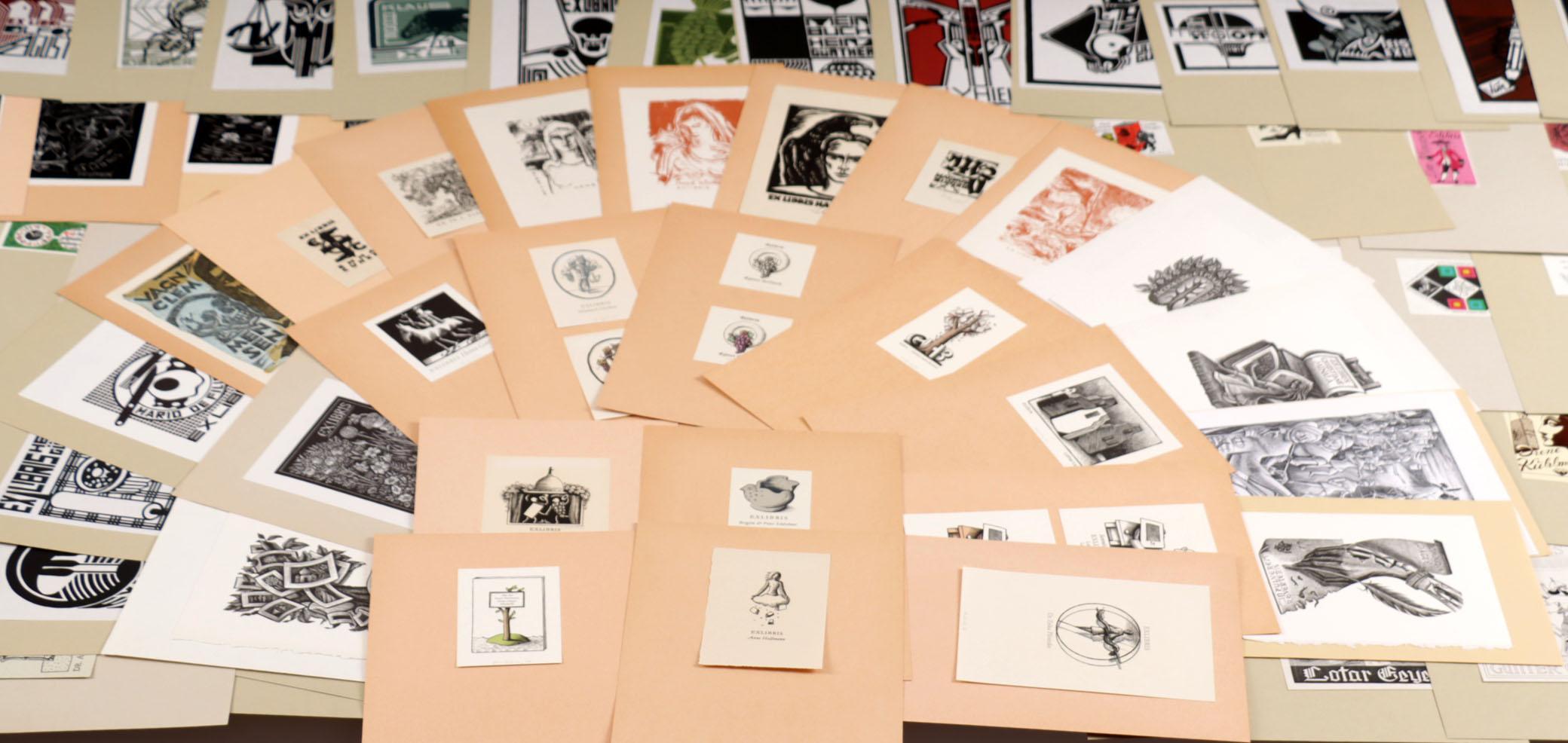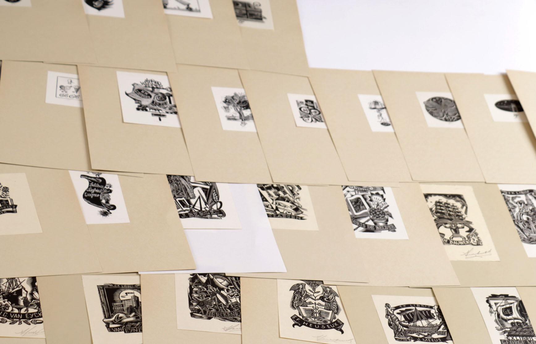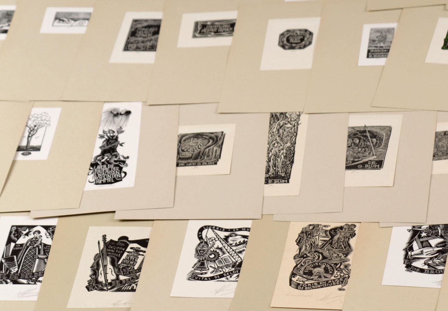 collectie plm. 180 Duitse exlibris, hoogdruk / vlakdruk. Deels gesigneerd, opgeplakt. Werk van o.a. Hmmermann (39x), Herckenrath (24x), Herfurth (15x), Guenther (21x), Kuchenbauer (27x), Kuehlmann (38x)