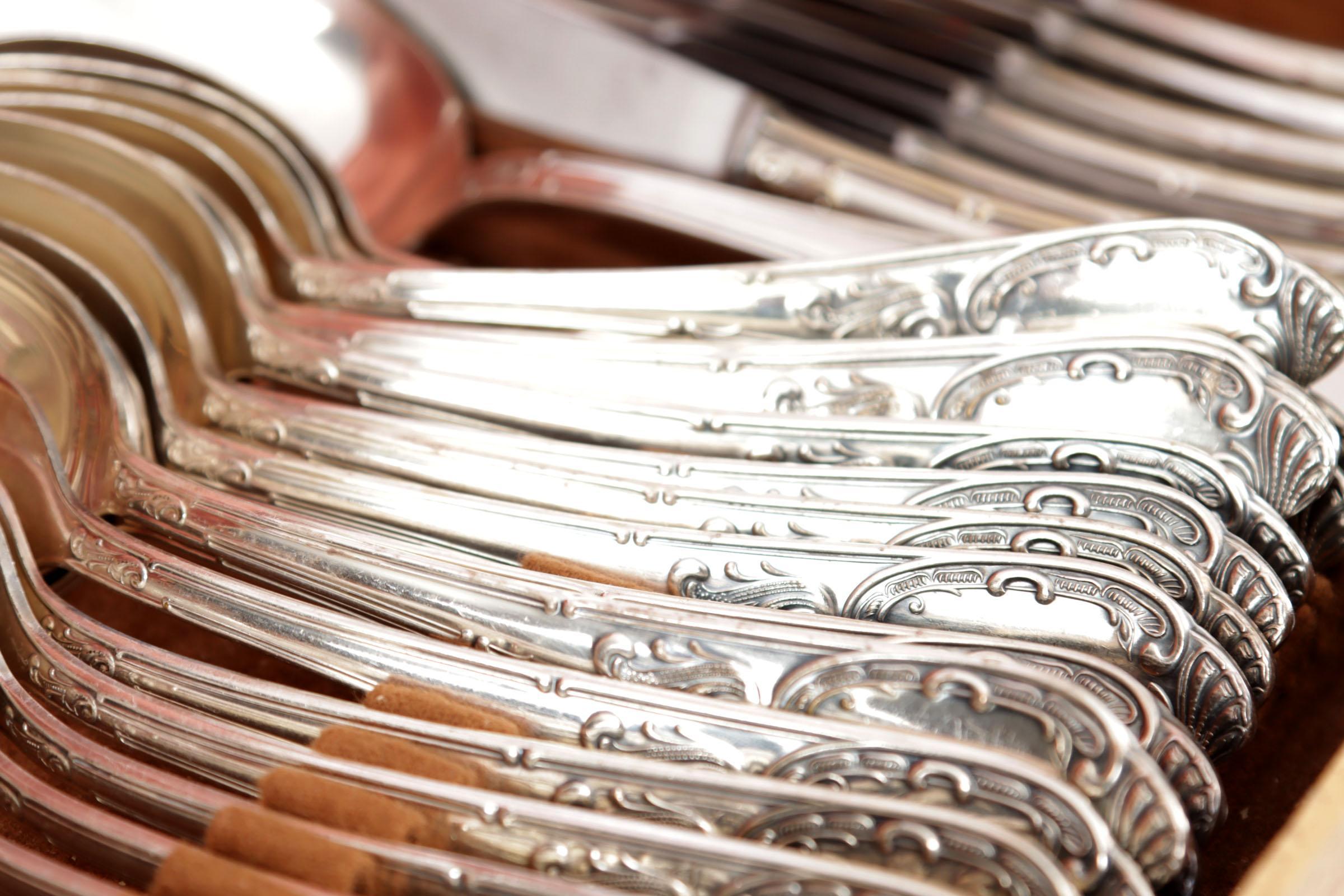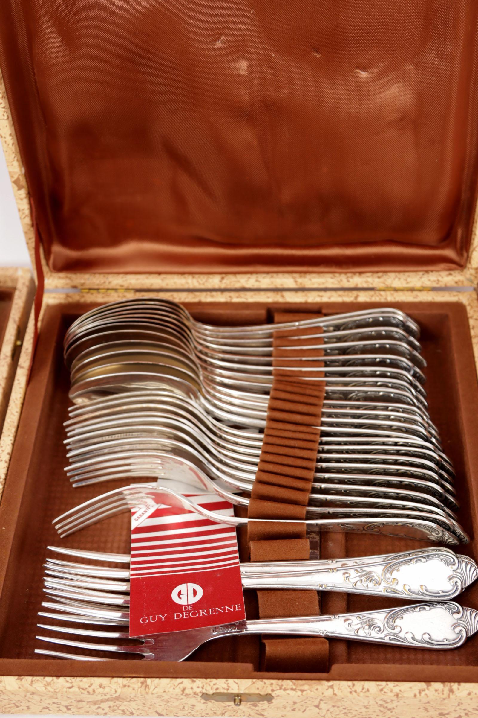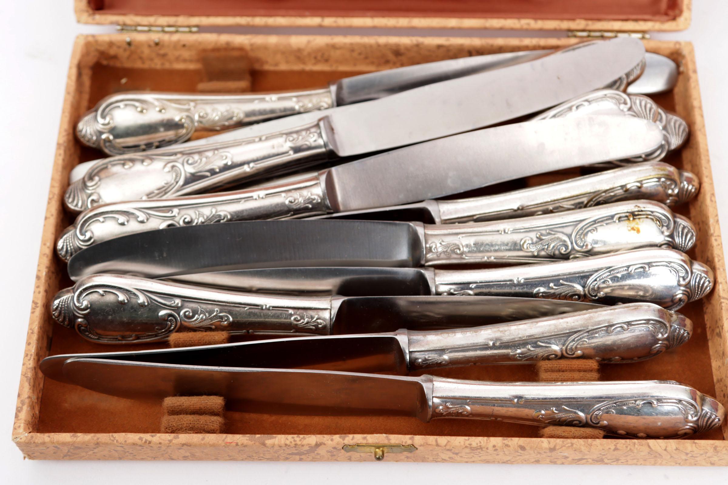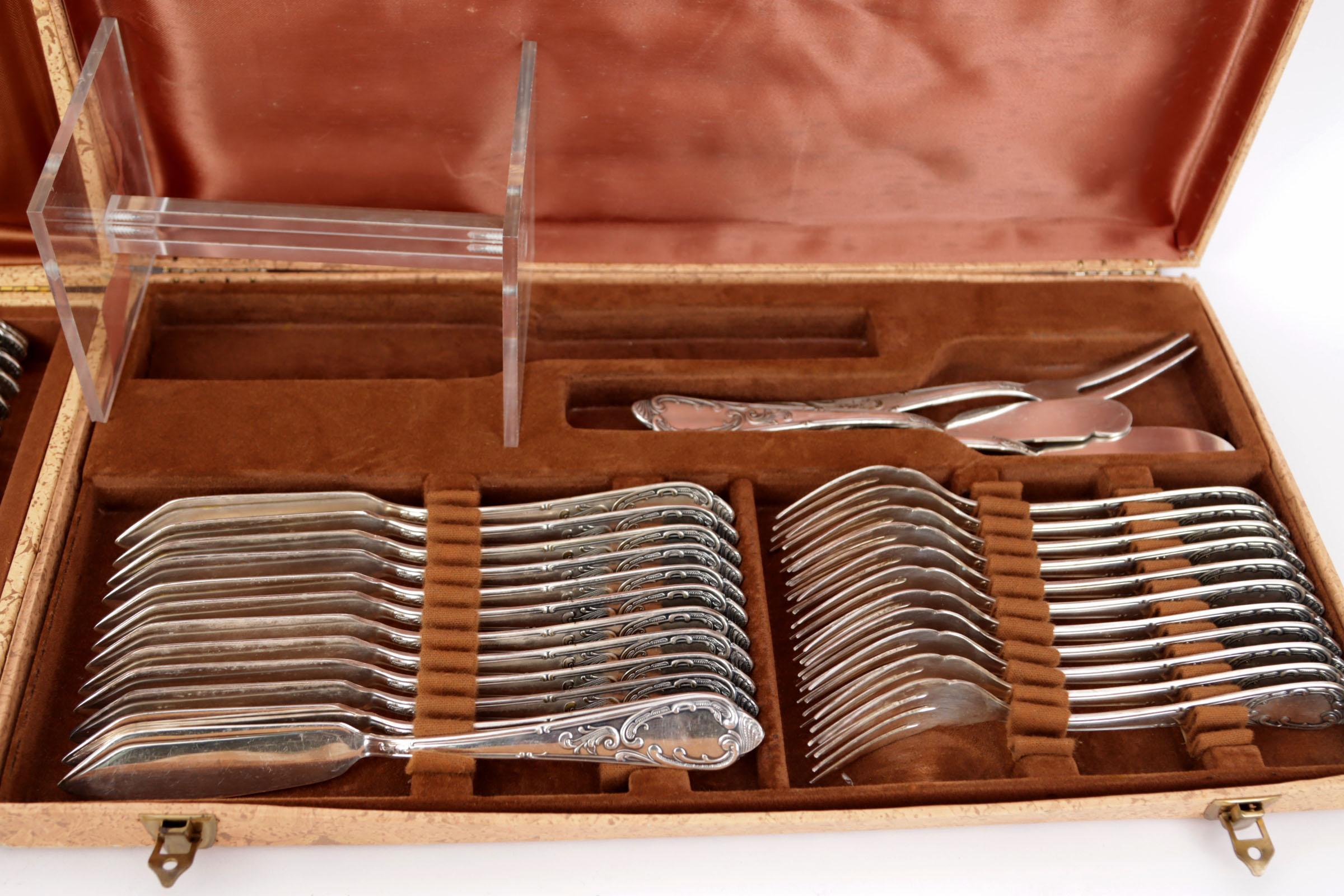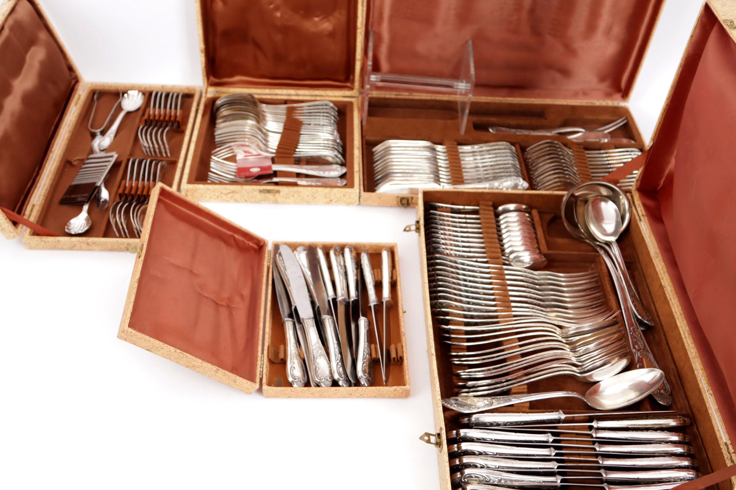 Solingen, verzilverd bestek in Louis XV/Rococo-stijl, in vijf vintage opberg cassettes