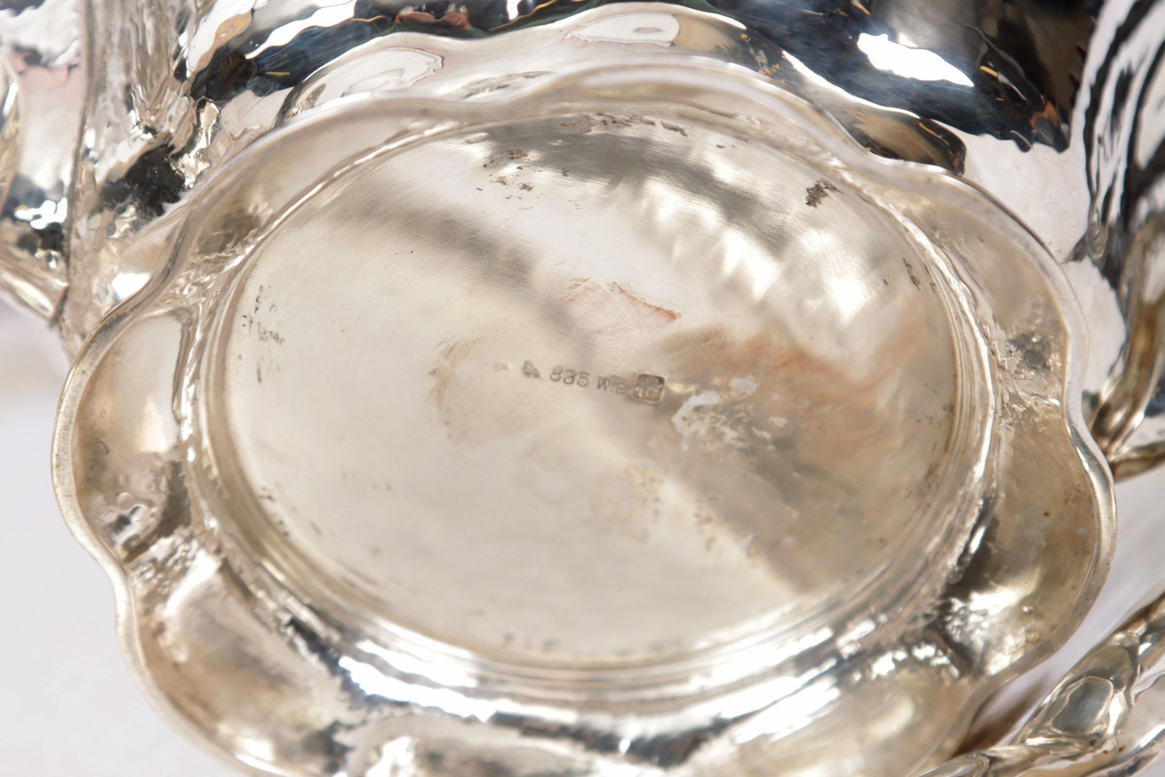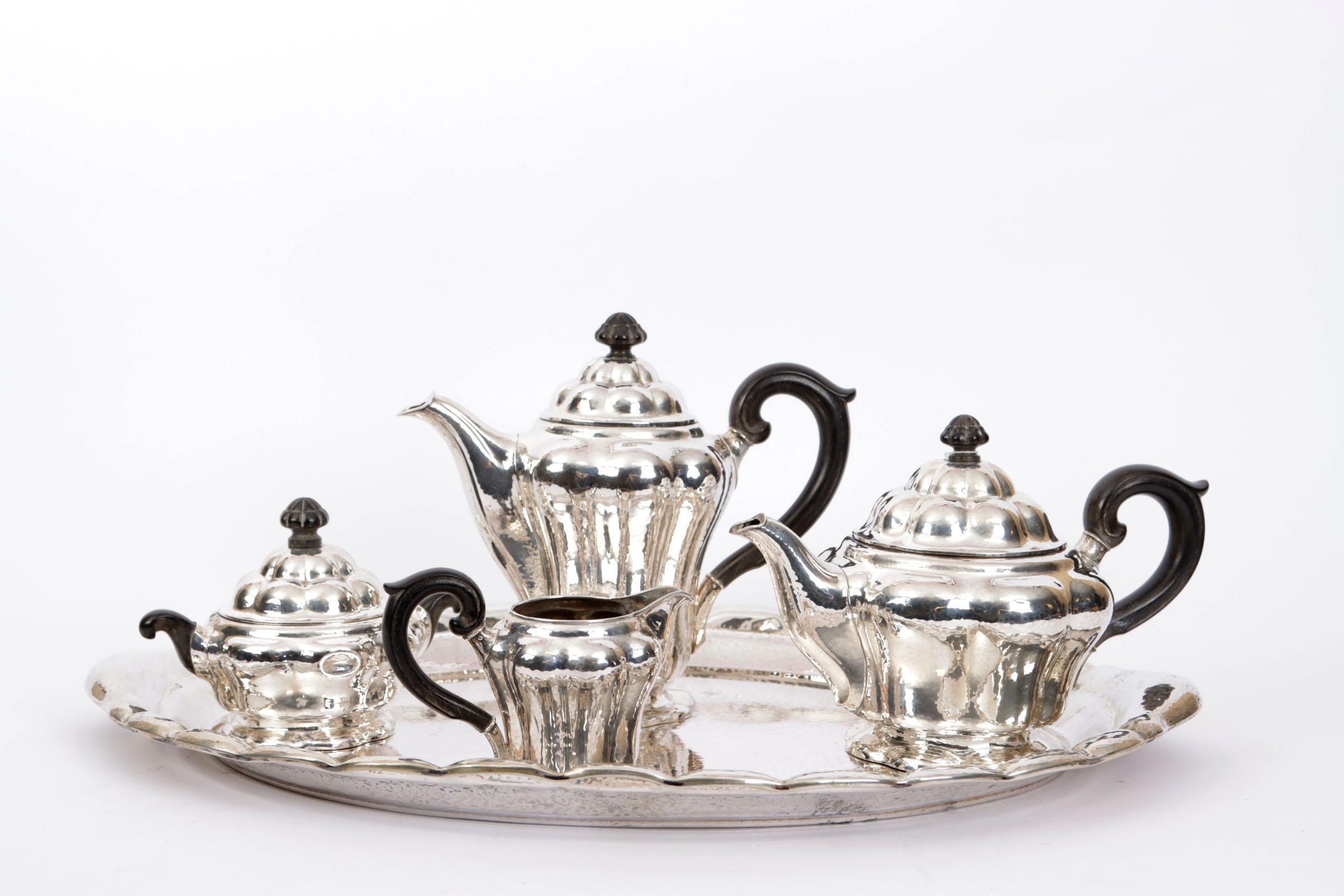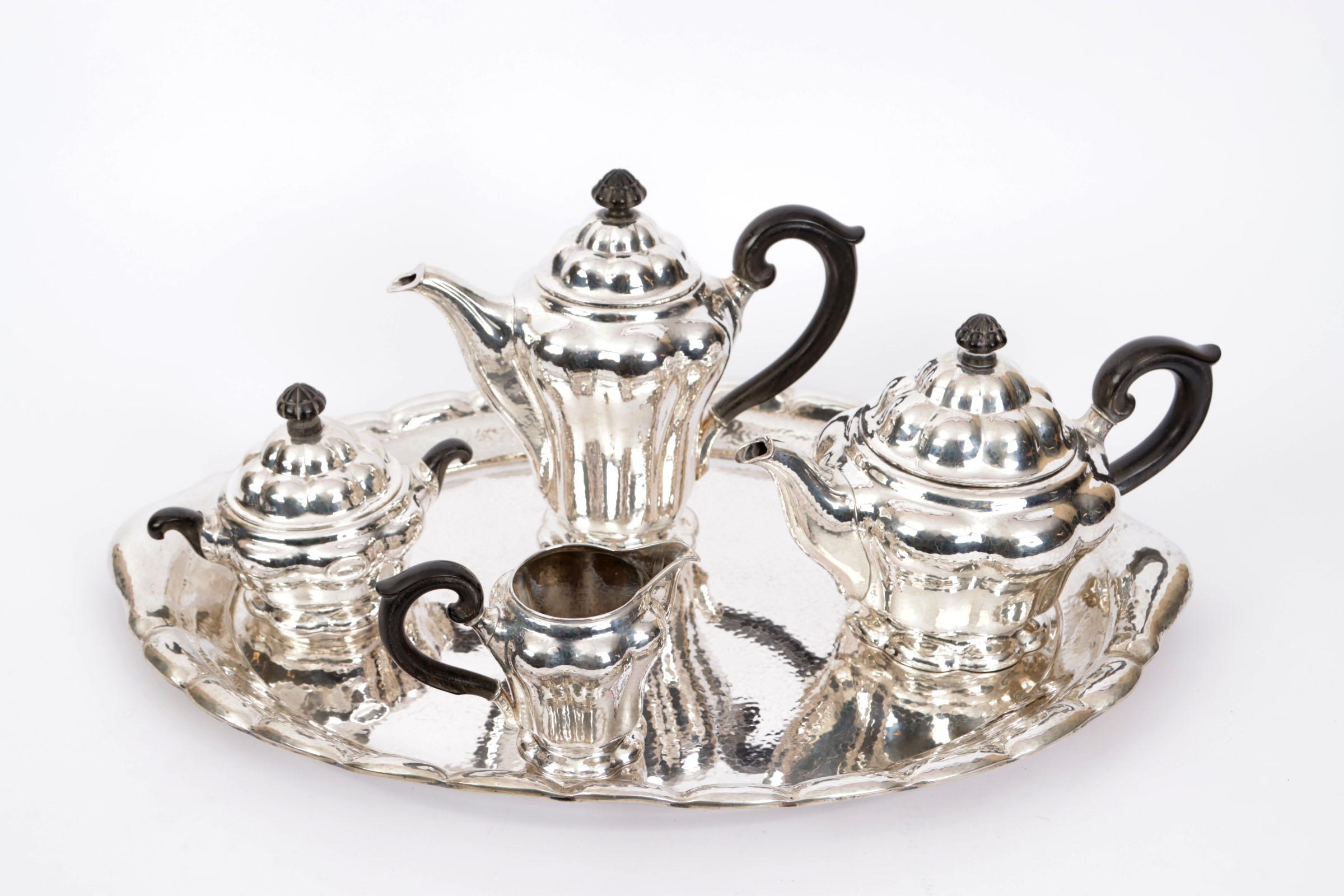 Duits Art-Deco zilveren vierdelig, gehamerd, koffie/theeservies met houten handgrepen, op zilver dienblad, totaal gewicht: 3343 gram