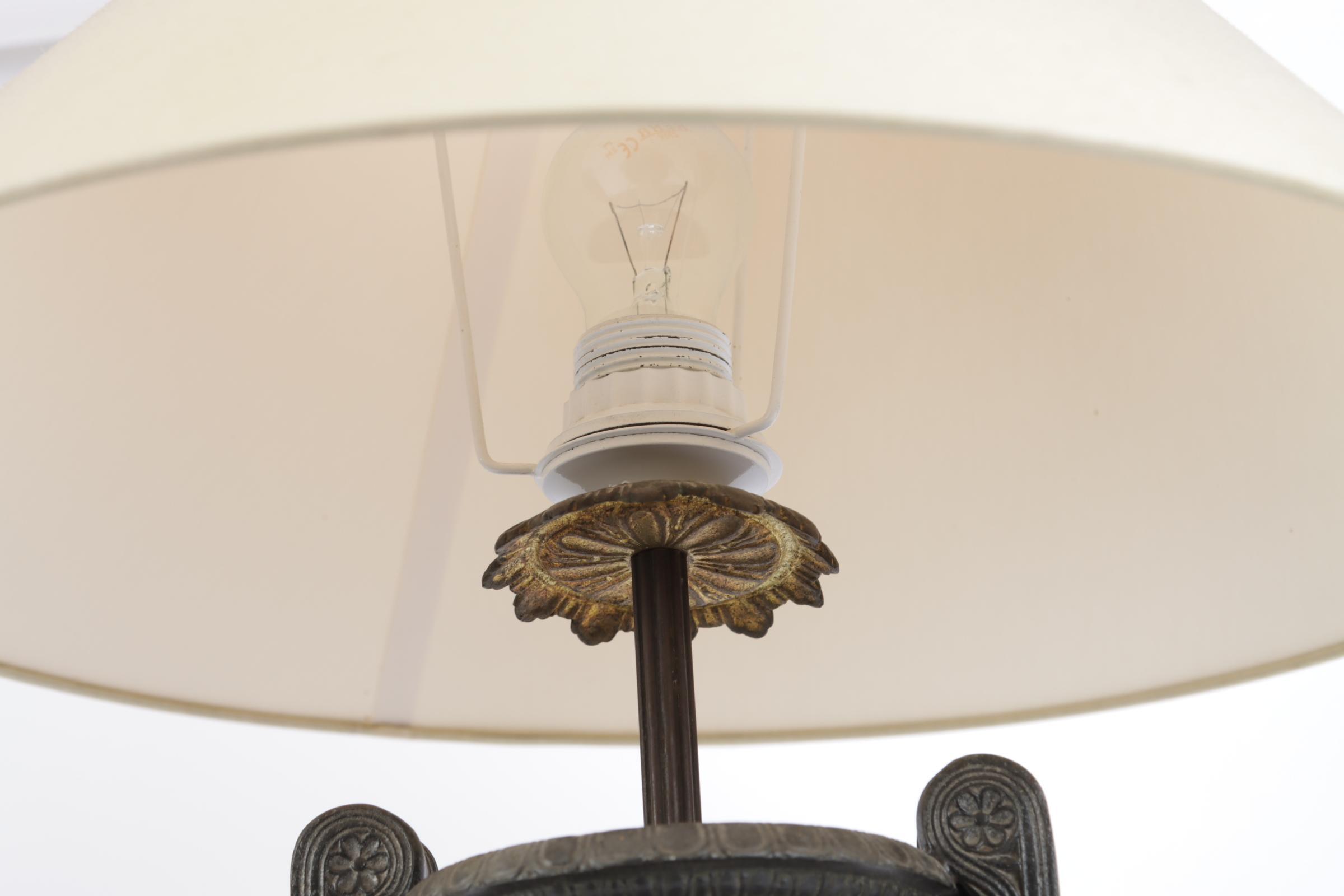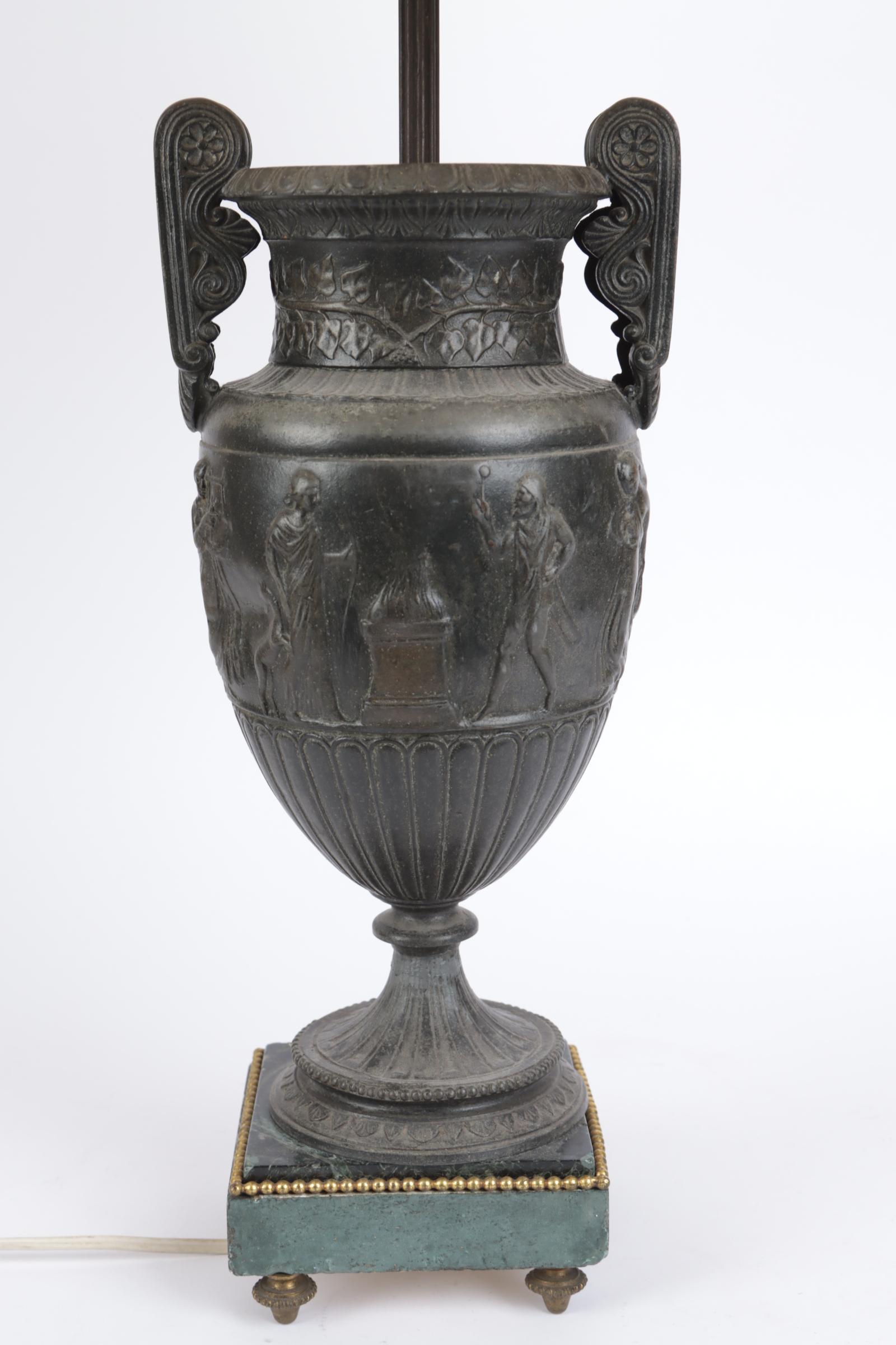 Neo klassieke legering lampvoet i.v.v. van een vaas met decor van personen, op groen marmeren voetstuk met beige kap, h.68 cm.