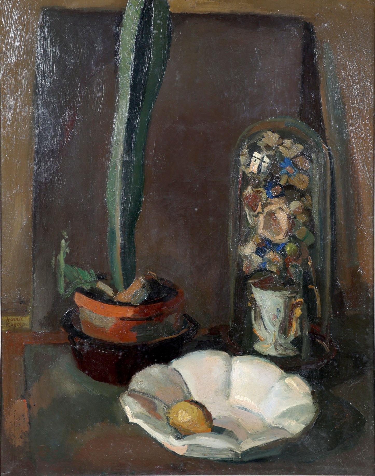 Henricus Johannes (Harry) Kuyten (1883-1952), Bloemstilleven met stolp, cactus en citroen, olieverf op doek, 80 x 66 cm., provenance particuliere collectie Bergen