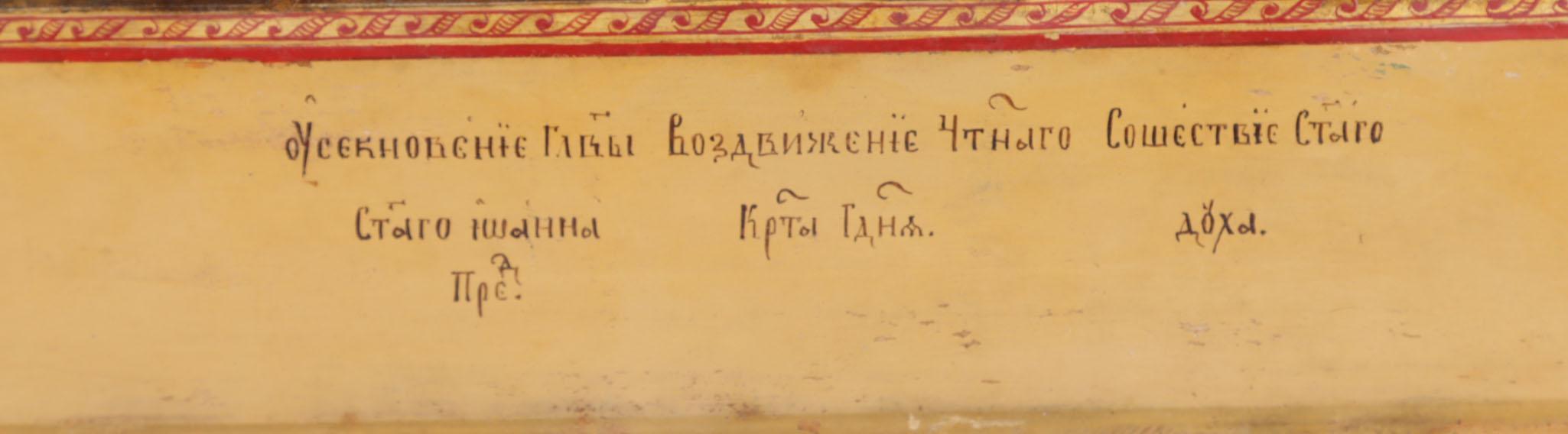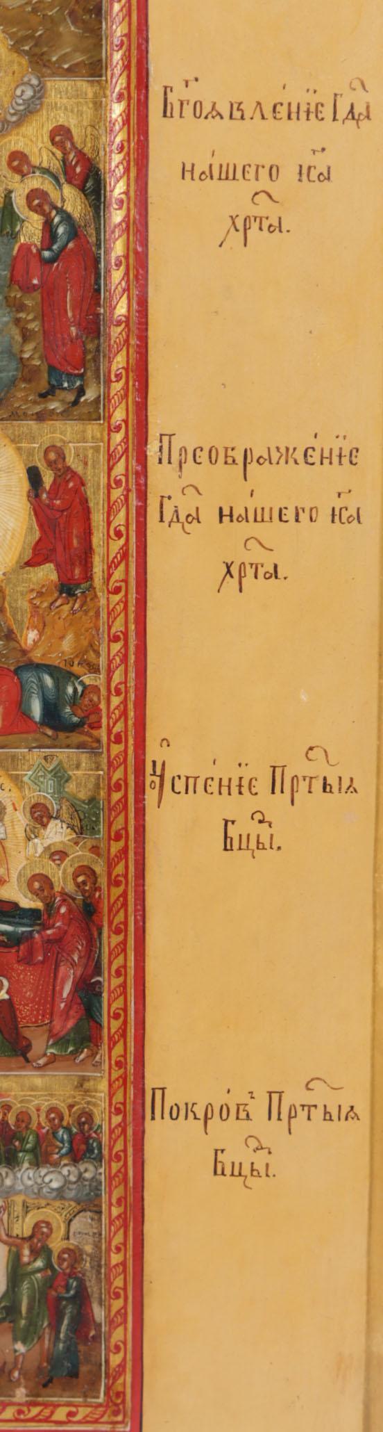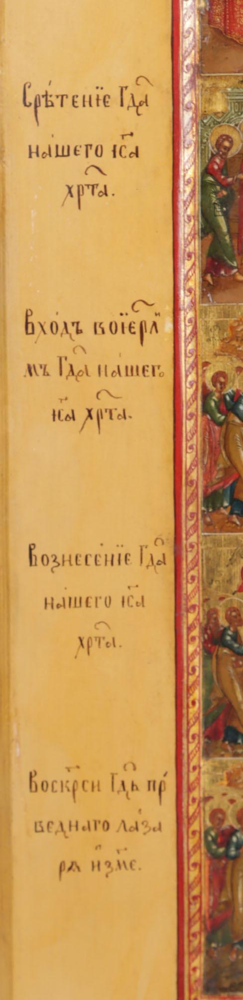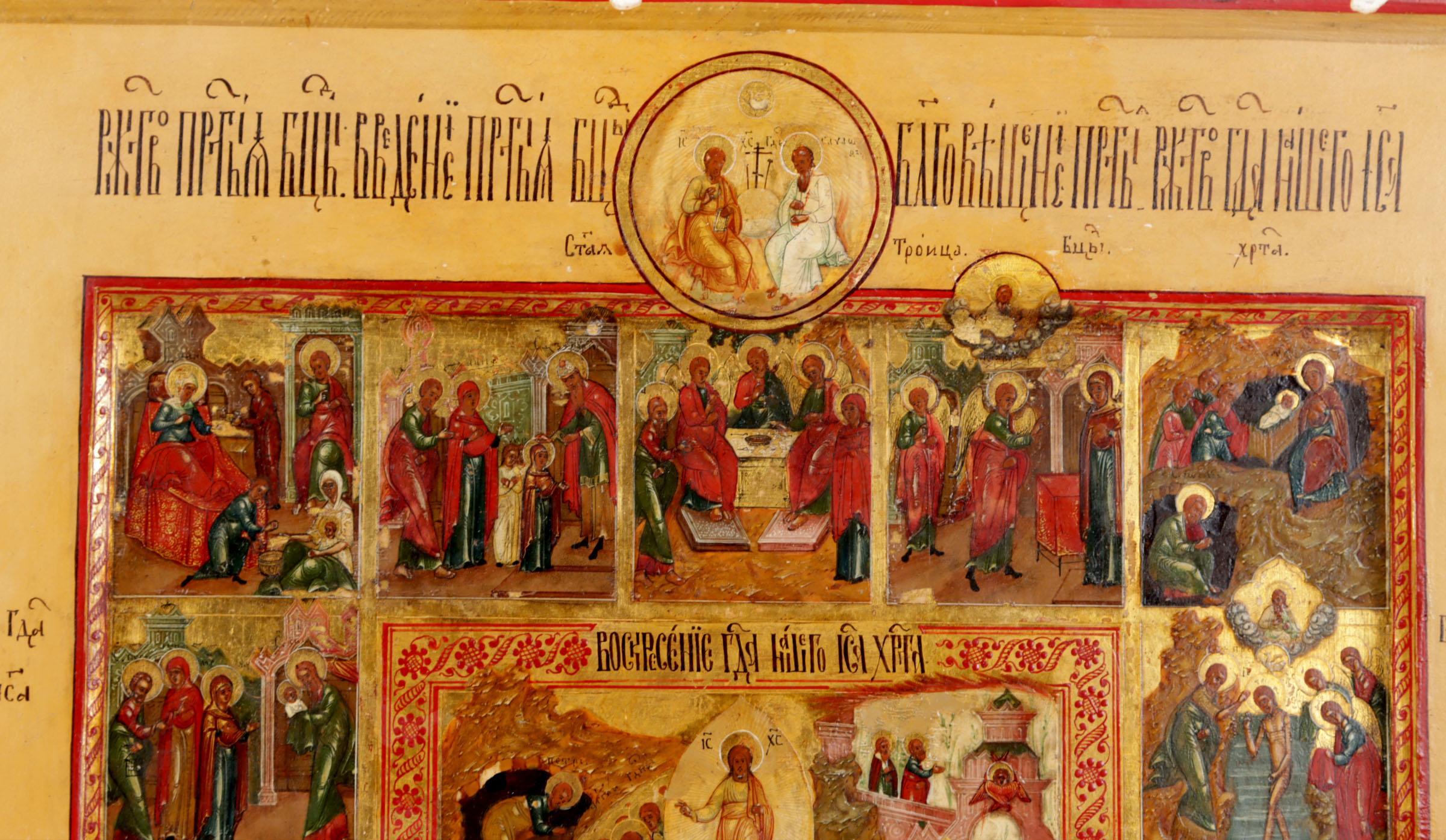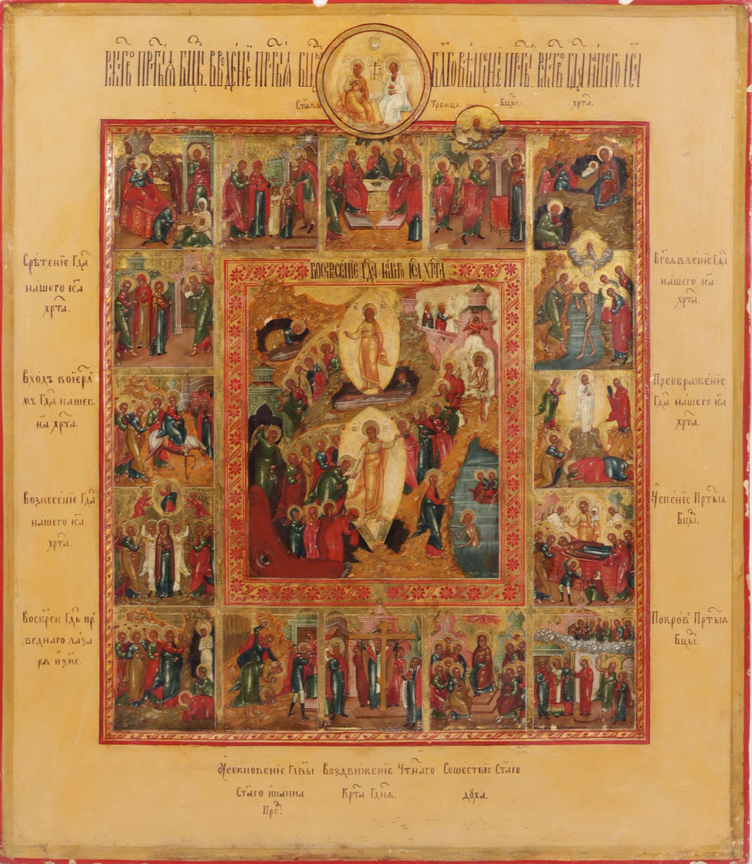 Russische Feestdagen ikoon met voorstellingen van de belangrijkste Russisch/Orthodoxe kerkelijke feestdagen gegroepeerd rond de paasvoorstelling, centraal Rusland, tempra op paneel, 19e eeuw, 35,5 x 31 cm.