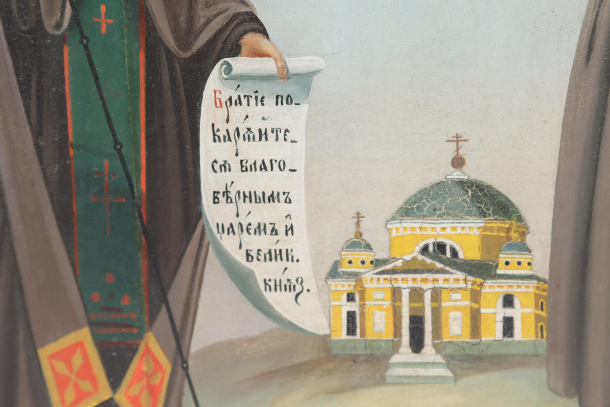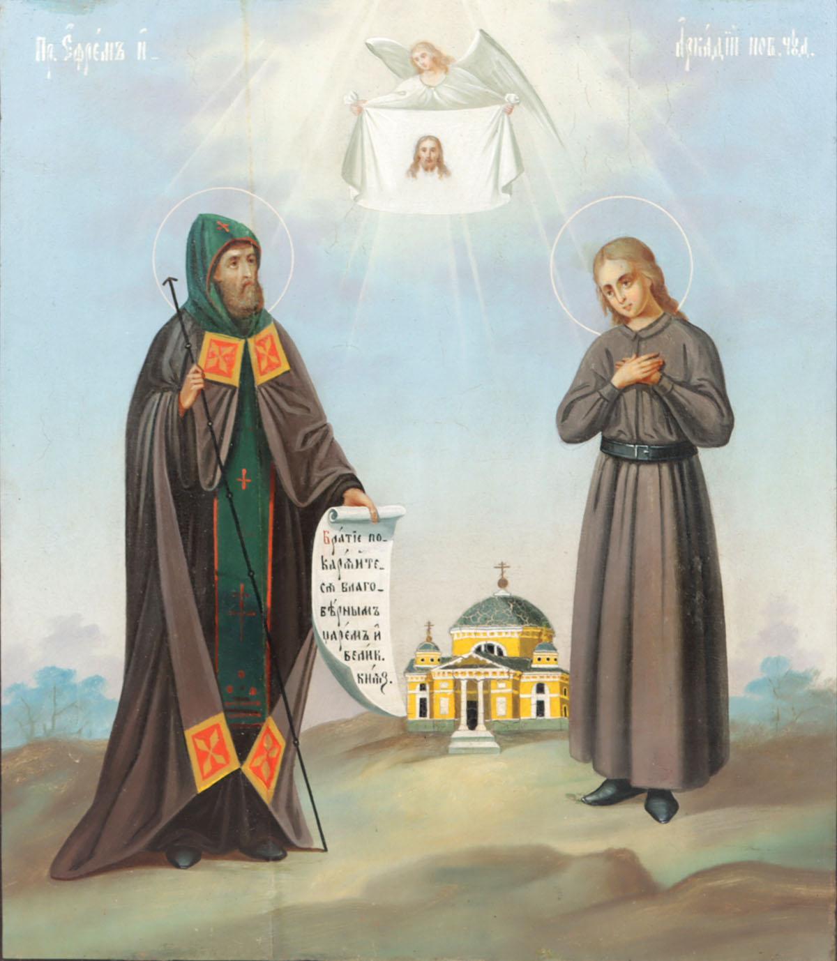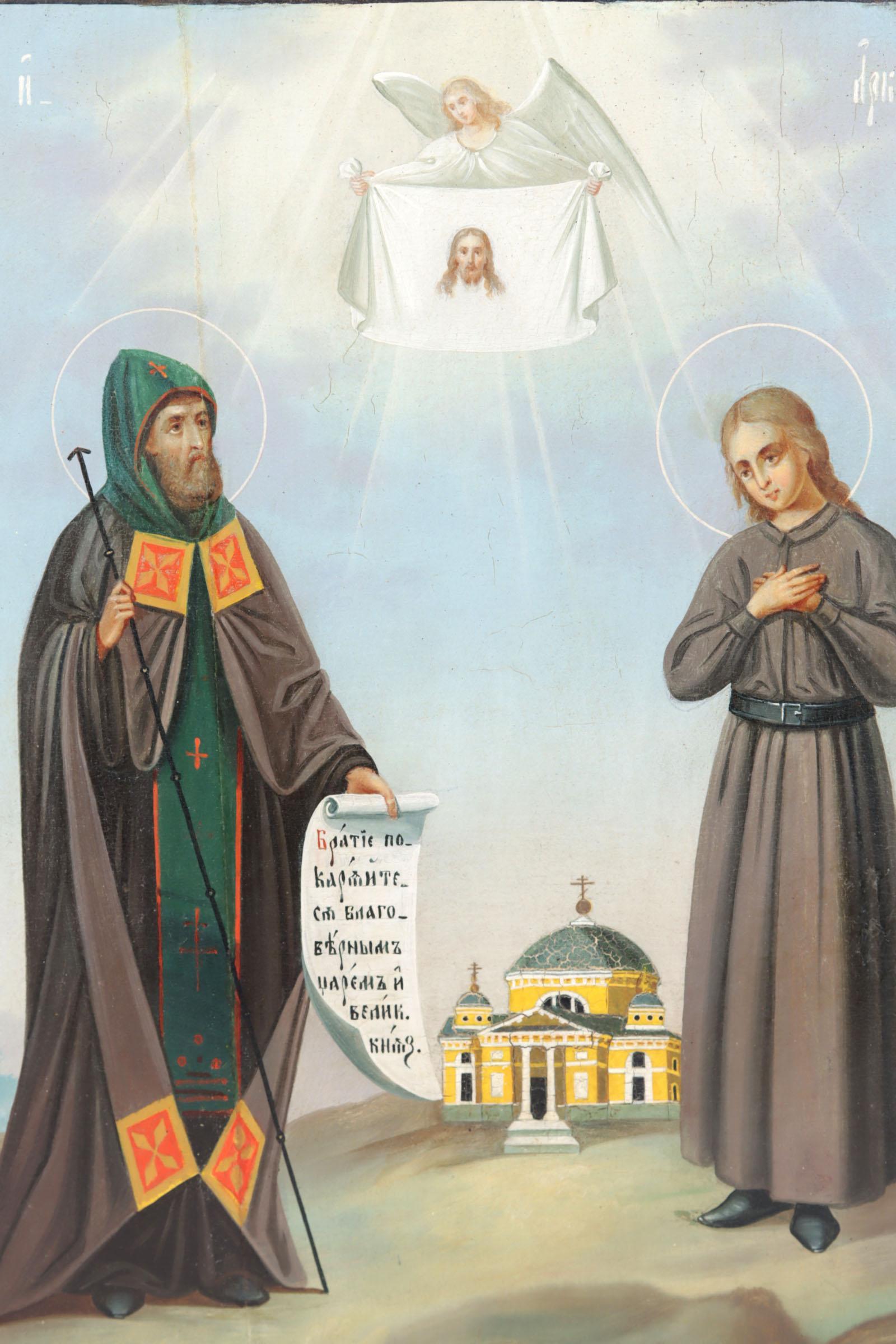 Oude ikoon, St. Ephraim en St. Arkady van Novy Torg, Moeder Gods, Feodorovskaja, tempra op paneel, 35 x 30 cm.