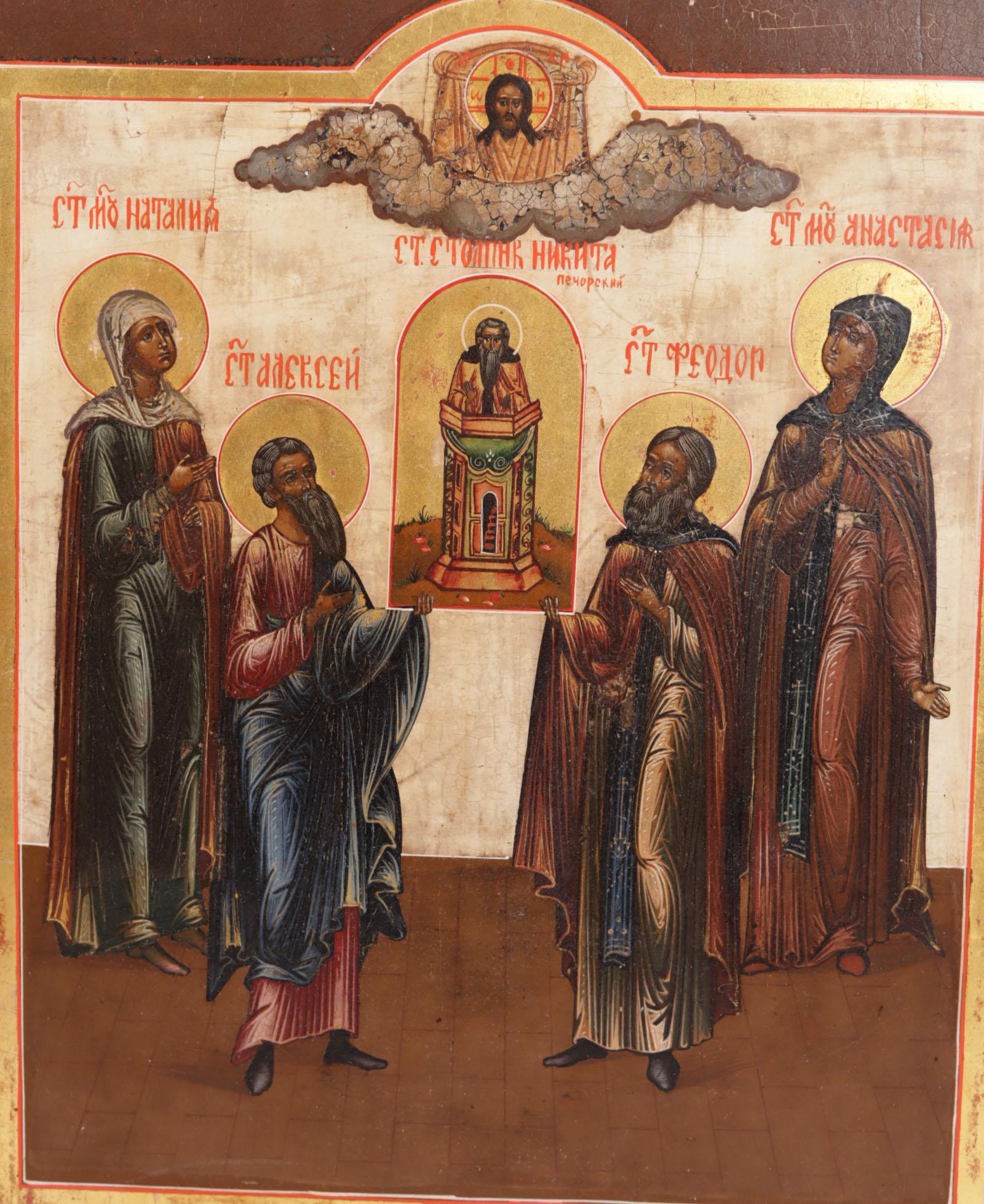 Russisch/Orthodoxe ikoon, links St.Nathalia, midden links St.Alexei(Alexius), midden rechts St.Fedor (Theodoor), rechts St. Anastasia, tempra op paneel, 31 x 27,5 cm., 19e eeuw