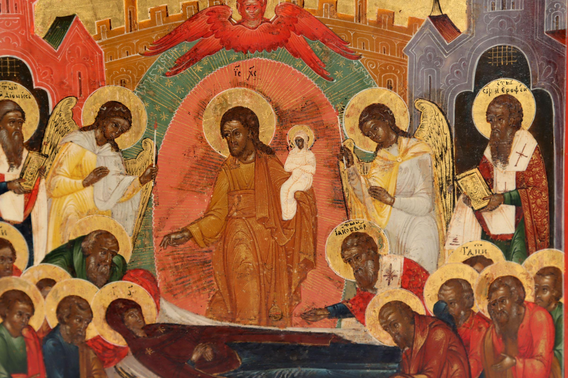 Russisch ikoon, Ontslaping van moeder Gods, tempra op paneel, 31 x 26,5 cm., 19e eeuw
