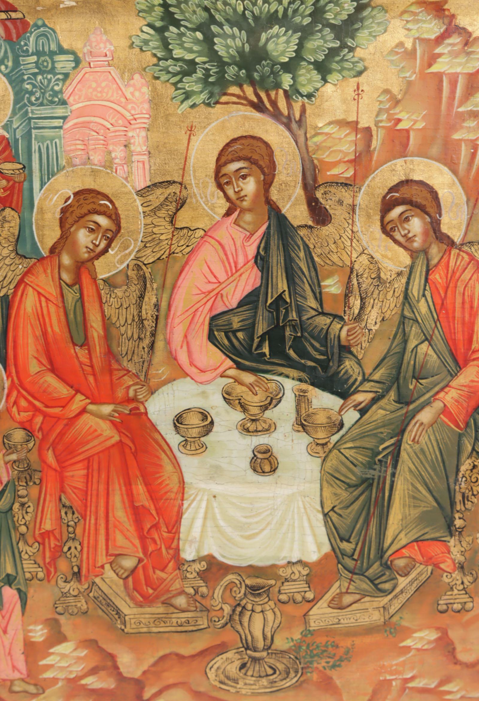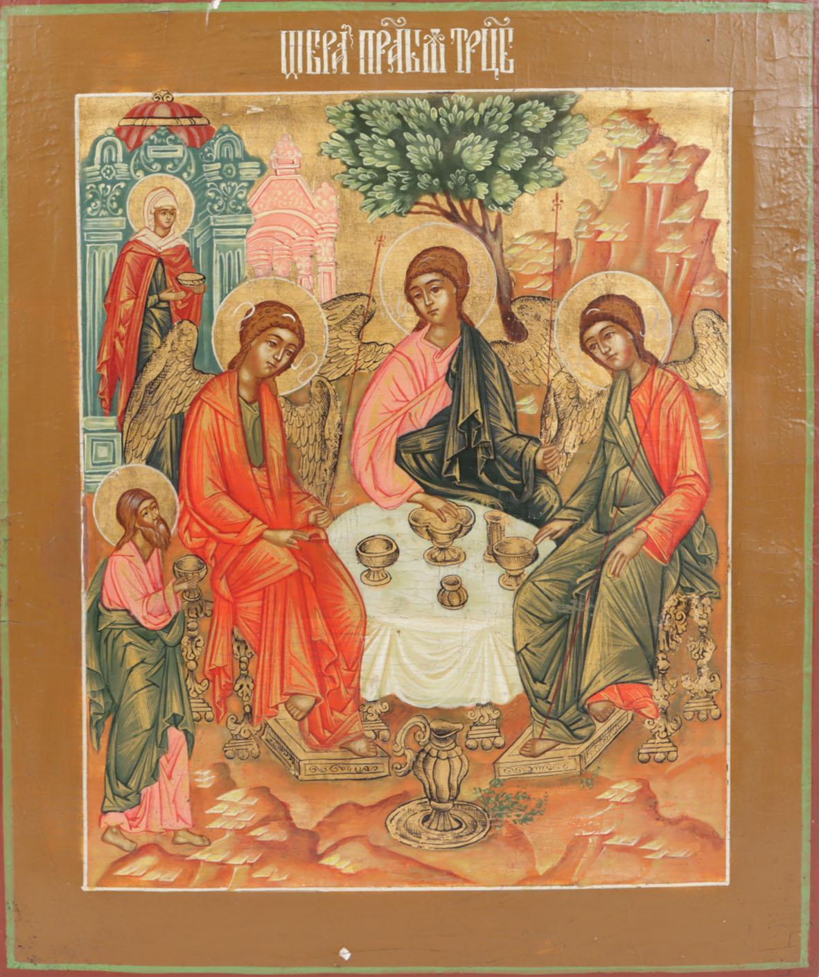 Russische ikoon, Oudtestamentische Drie-eenheid (De Gastvrijheid van Abraham), tempra op paneel, 30,5 x 26 cm., 19e eeuw