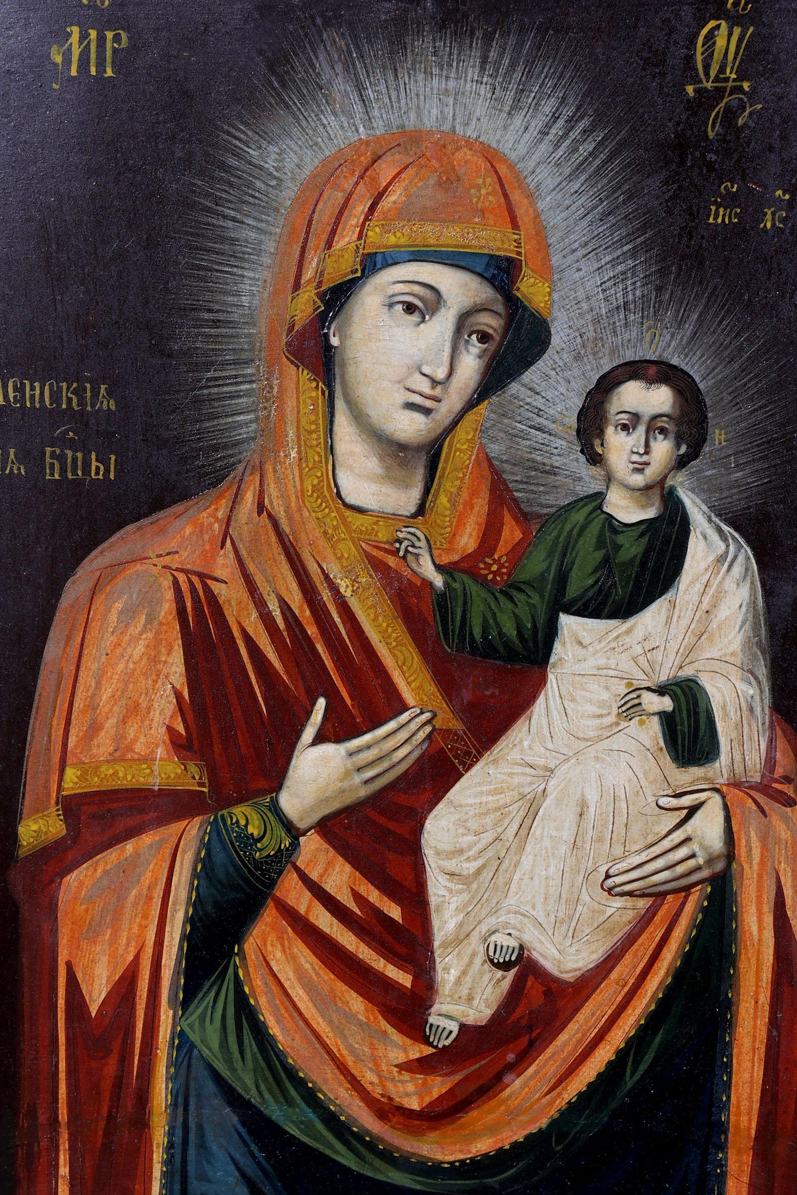 Griekse ikoon, Moeder Gods van Smolensk, tempra op paneel, 47,5 x 38 cm., 19e eeuw