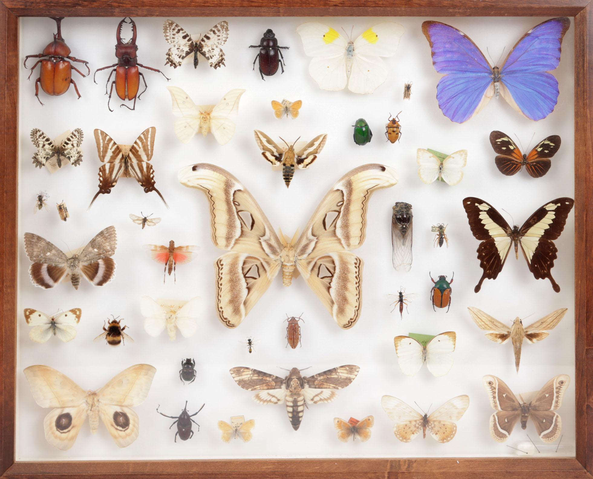 Insectenkabinet met diverse vlinders en torren, 19e eeuw, 50 x 40 cm.