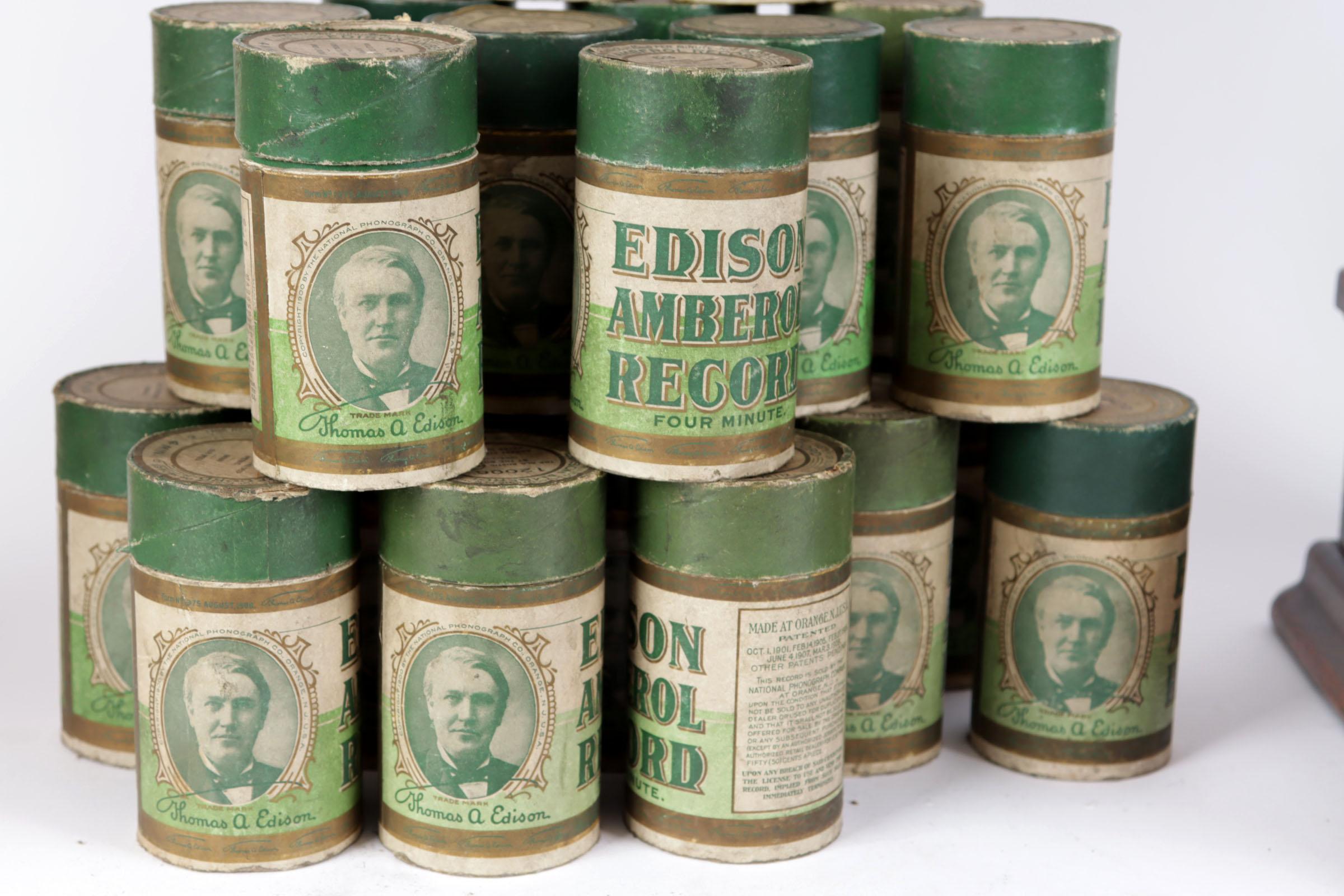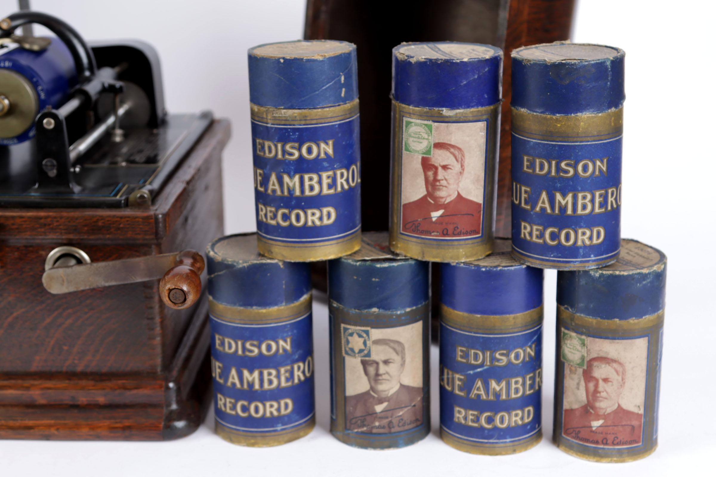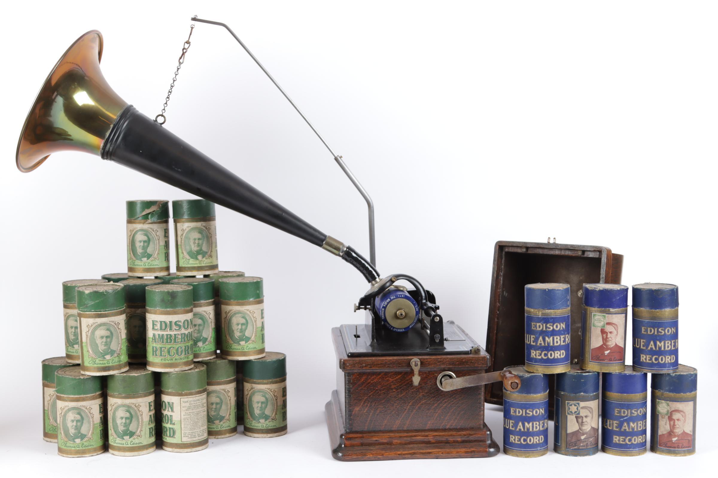 Antieke fonograaf, Thomas A. Edison, nr.27123, model A, met bijbehorende kist met rollen