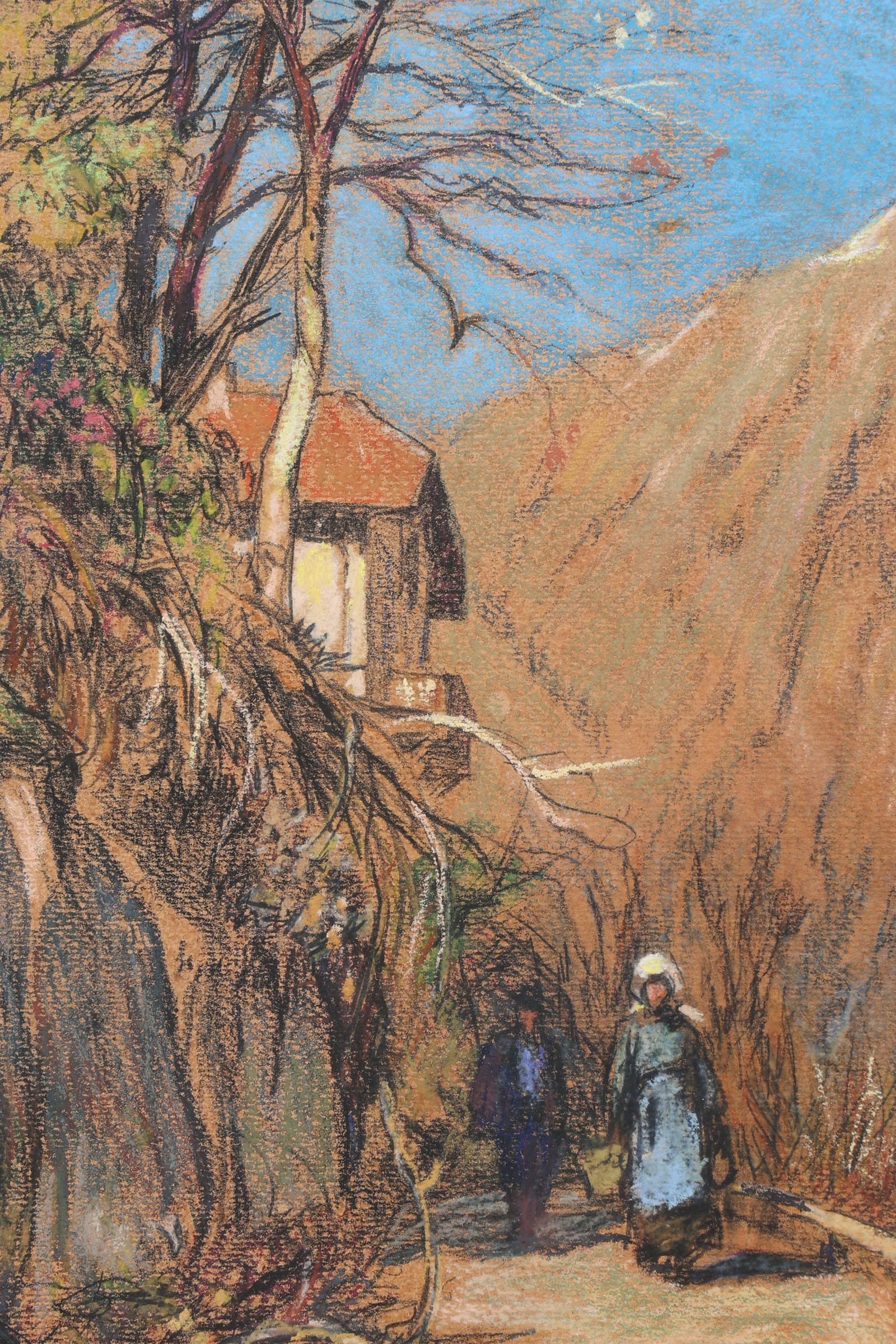 Zon, Landschap met personen, pasteltekening, 45 x 30 cm.