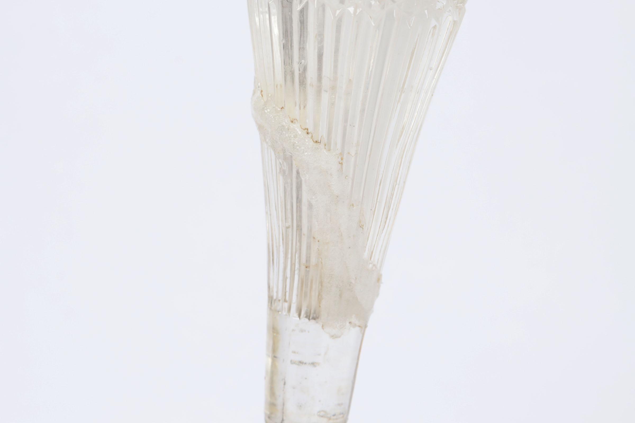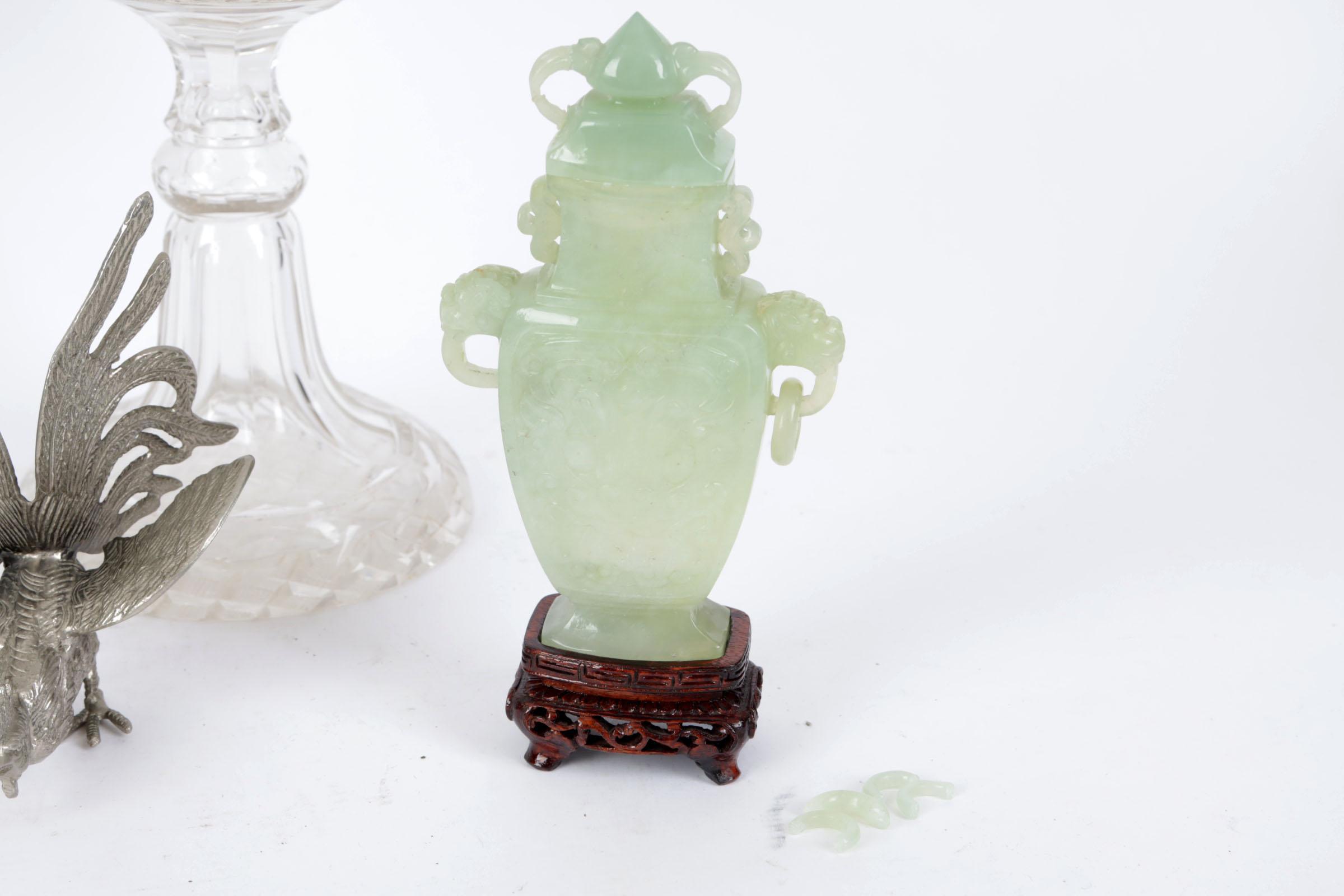 Koop van kristallen schaal, jade glazen vaasje op sokkel, piece de milieu op pleet onderstel en 2 tafelhanen