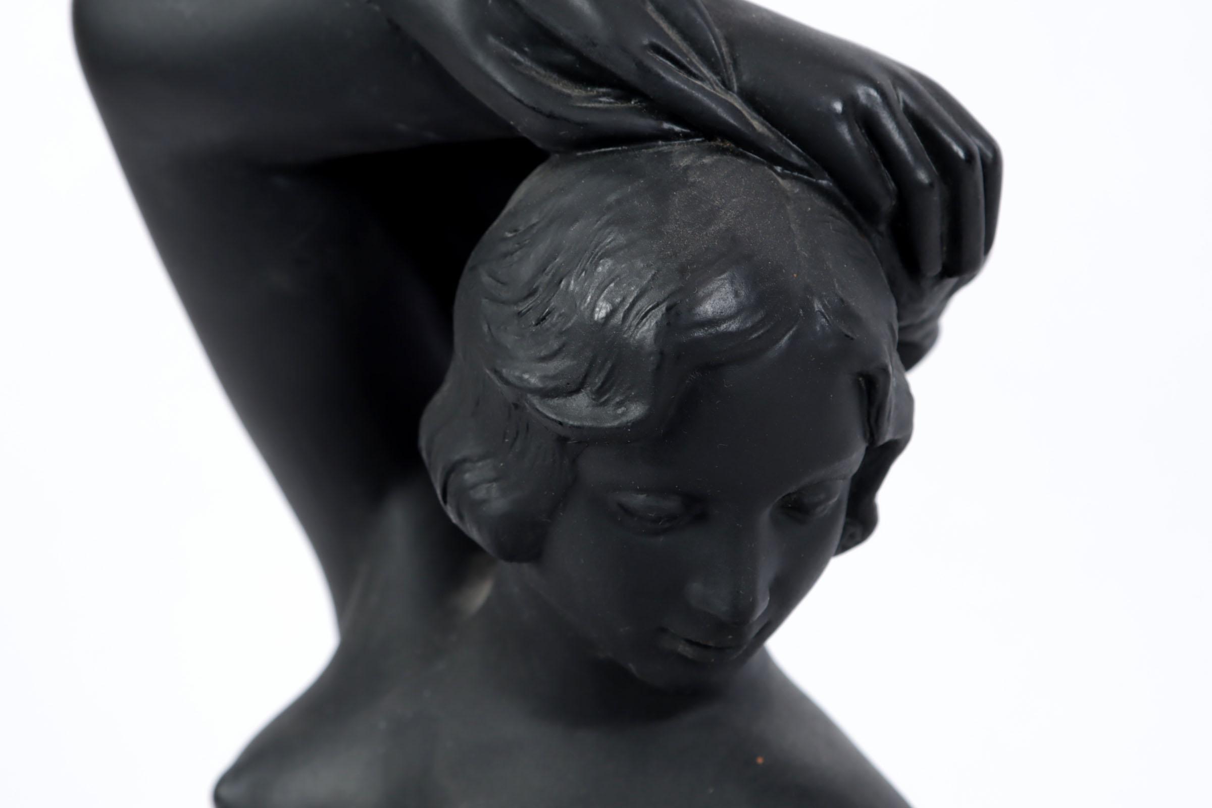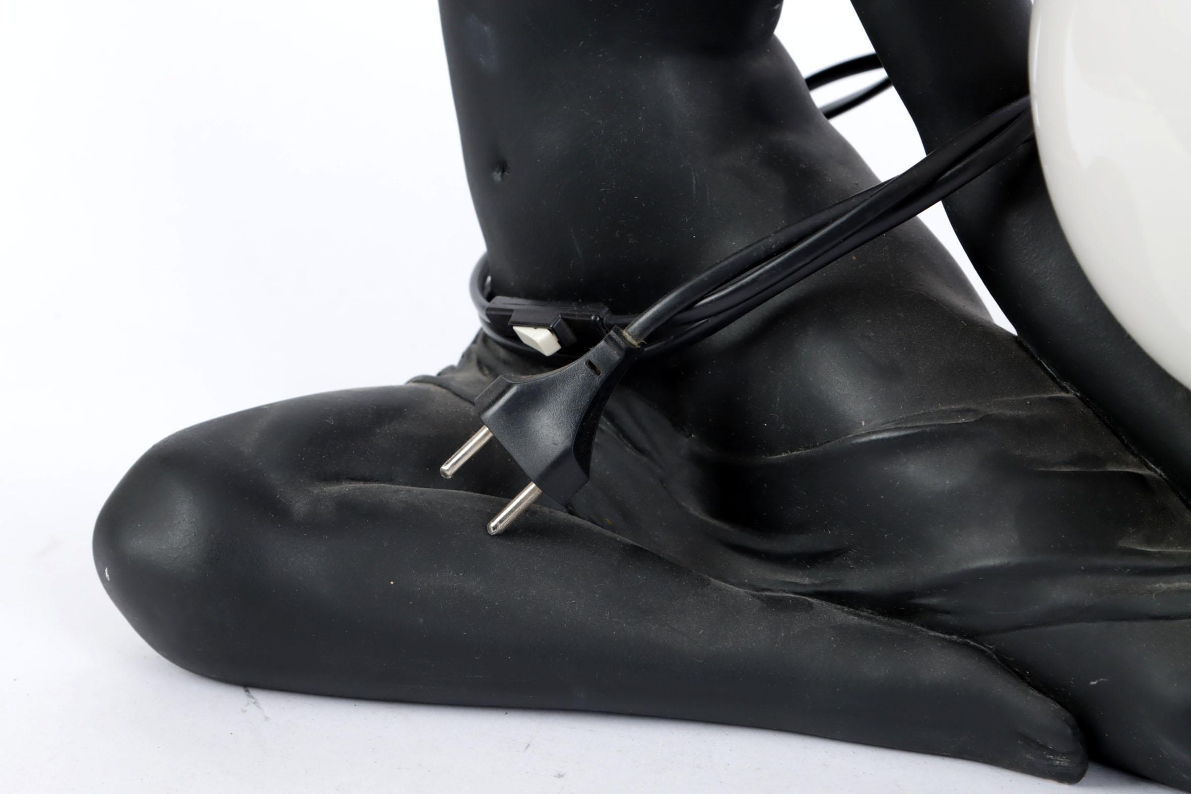 Zwart gelakt gipsen beeld van een Art Deco zittende dame met lamp, h.40 b 52 x d29 cm.