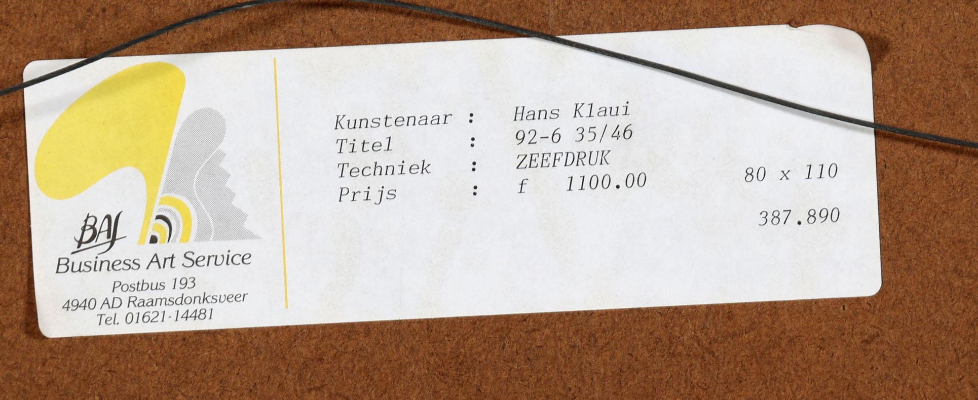 Hans Klaui (1945), 92-6, handgesigneerde zeefdruk, genummerd 35/46, 80 x 110 cm.