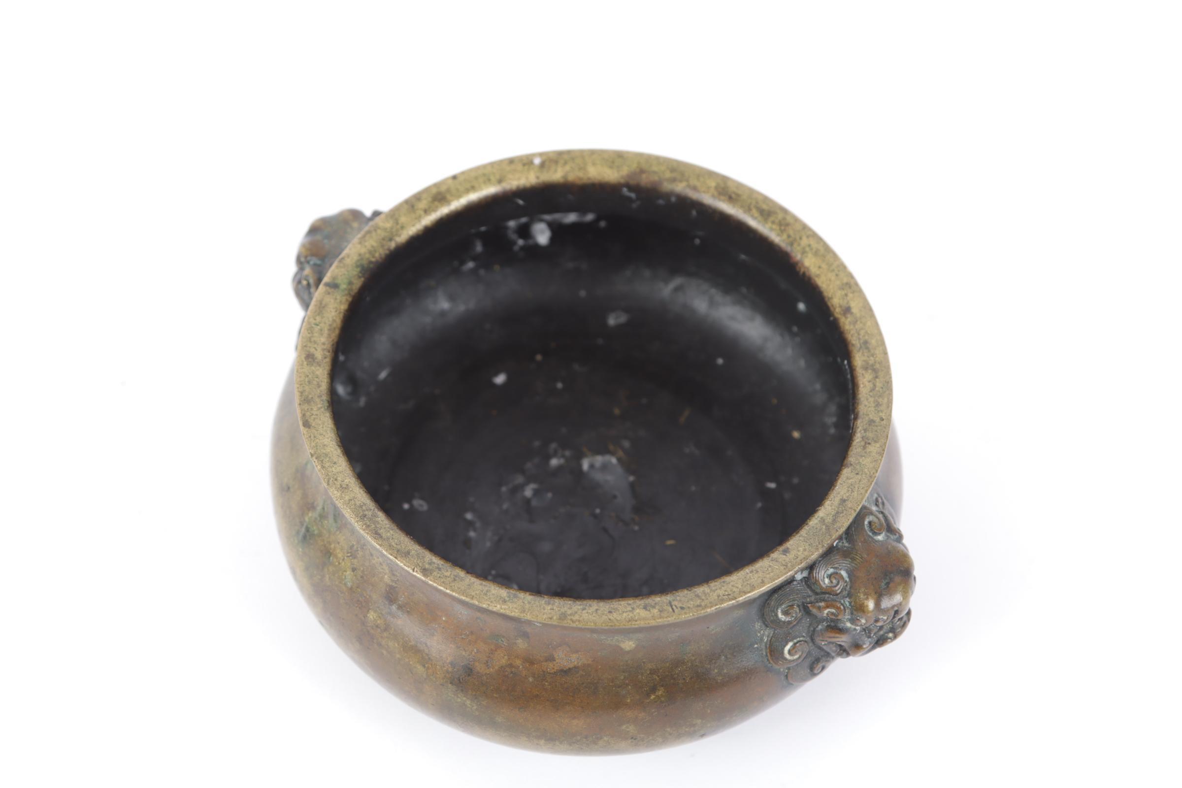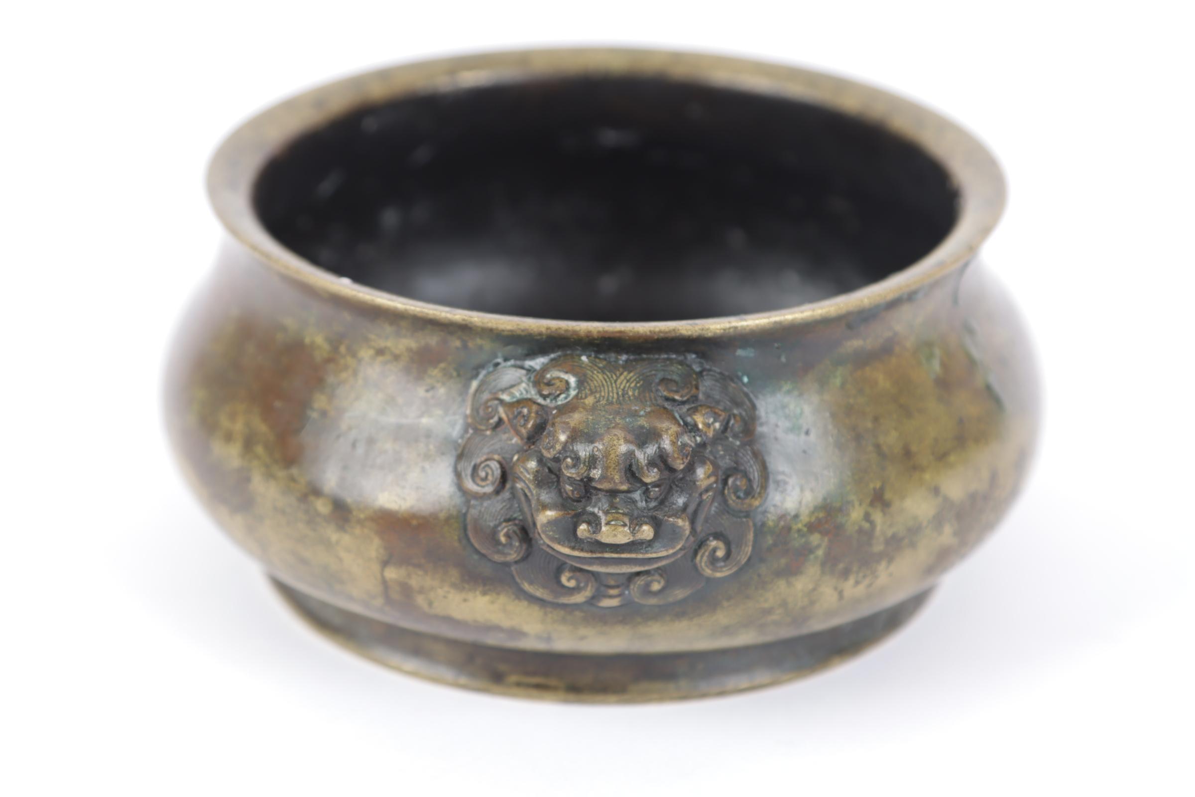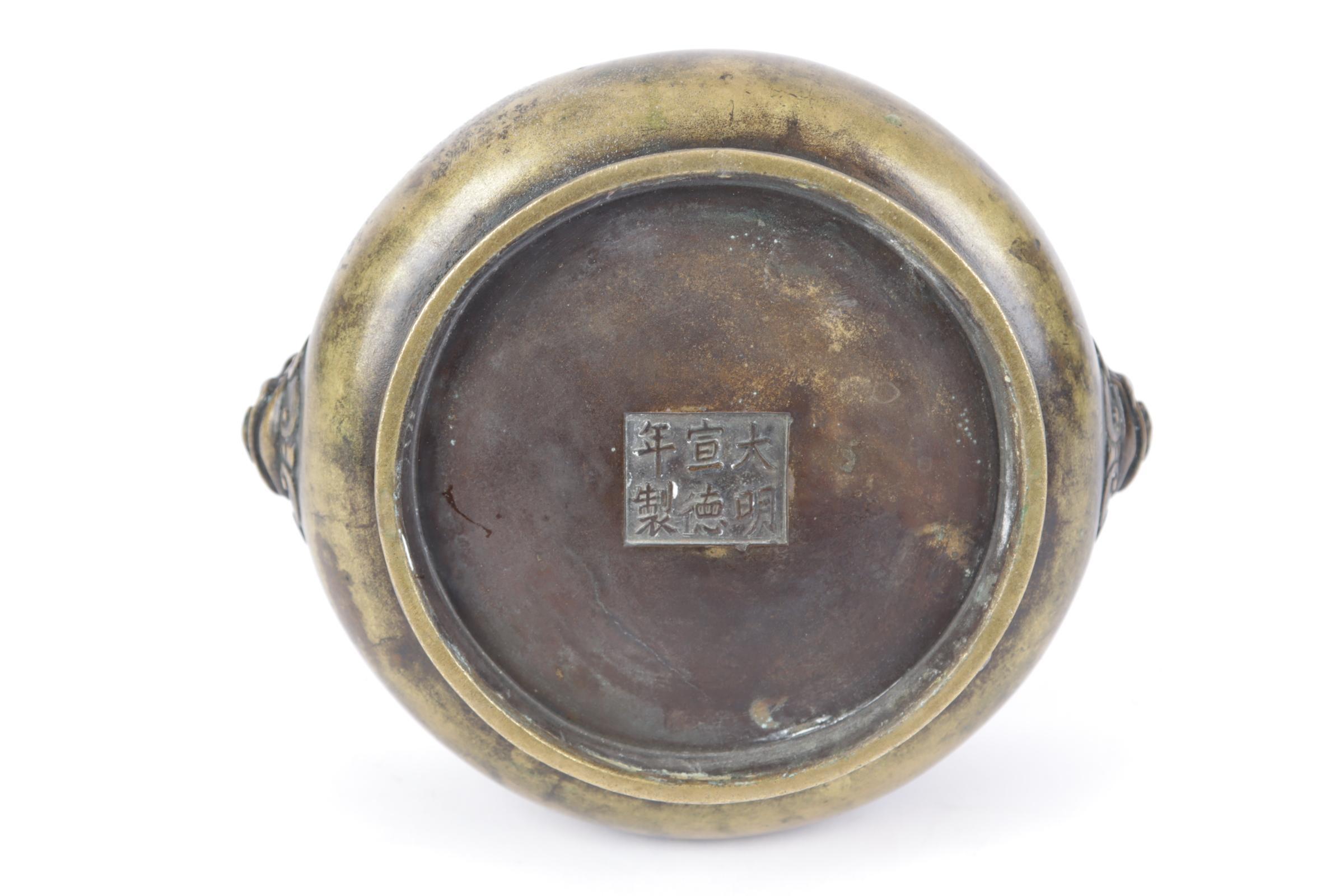 Een wierookbrander van gegoten brons met handvatten in de vorm van leeuwenkoppen, vermoedelijke Xuande zeskaraktermerk, 17e/18e eeuw.