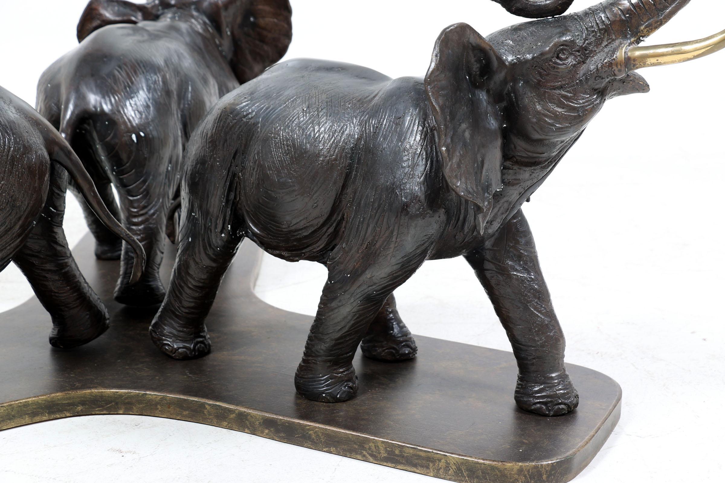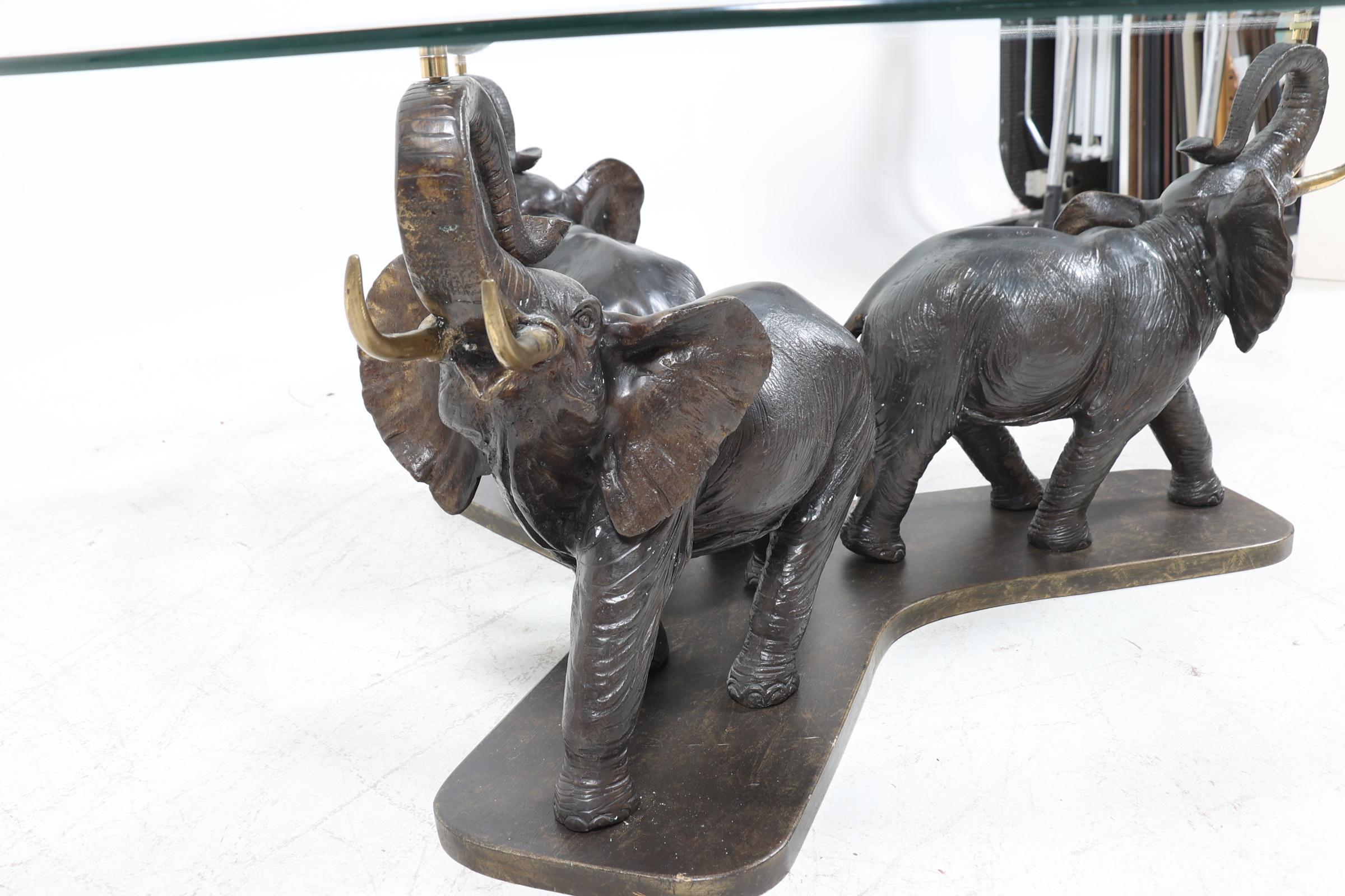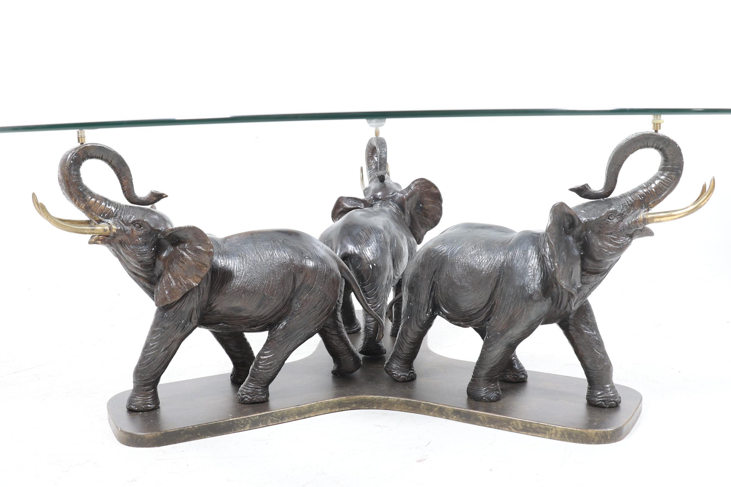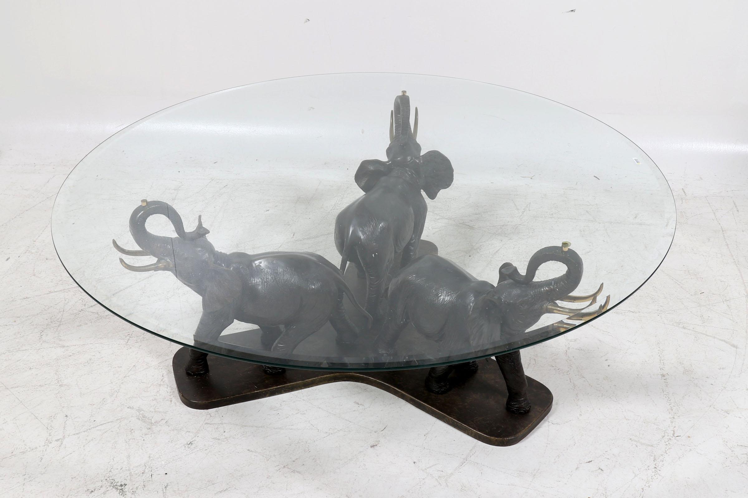 Salontafel met glazen blad en onderstel met 3 bronzen olifanten, h.48 x diam.130 cm.