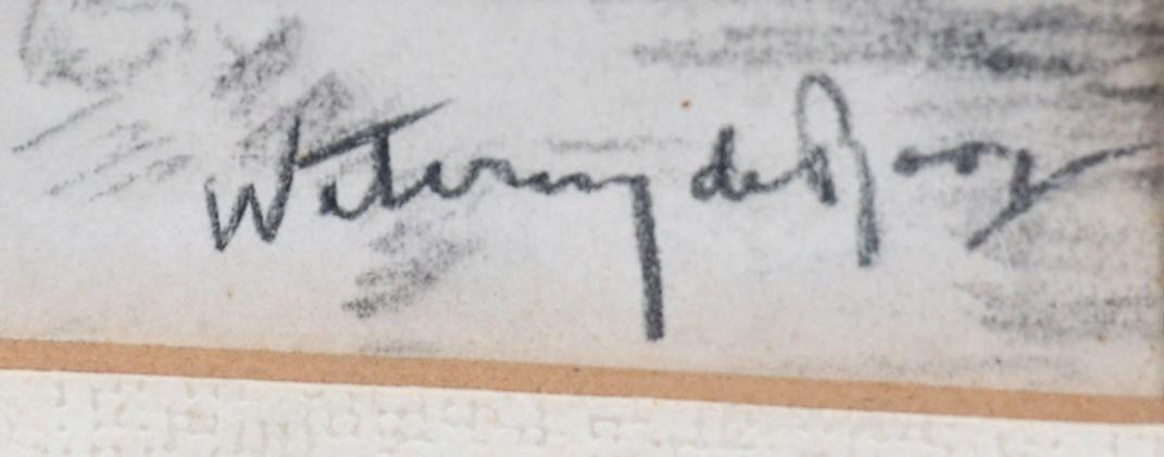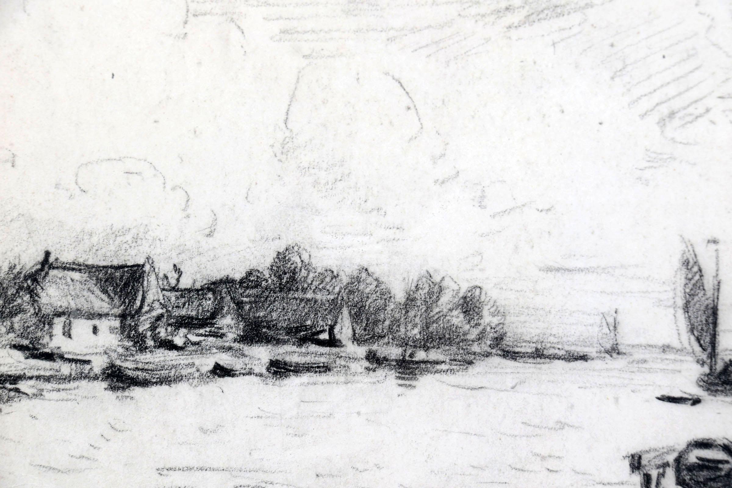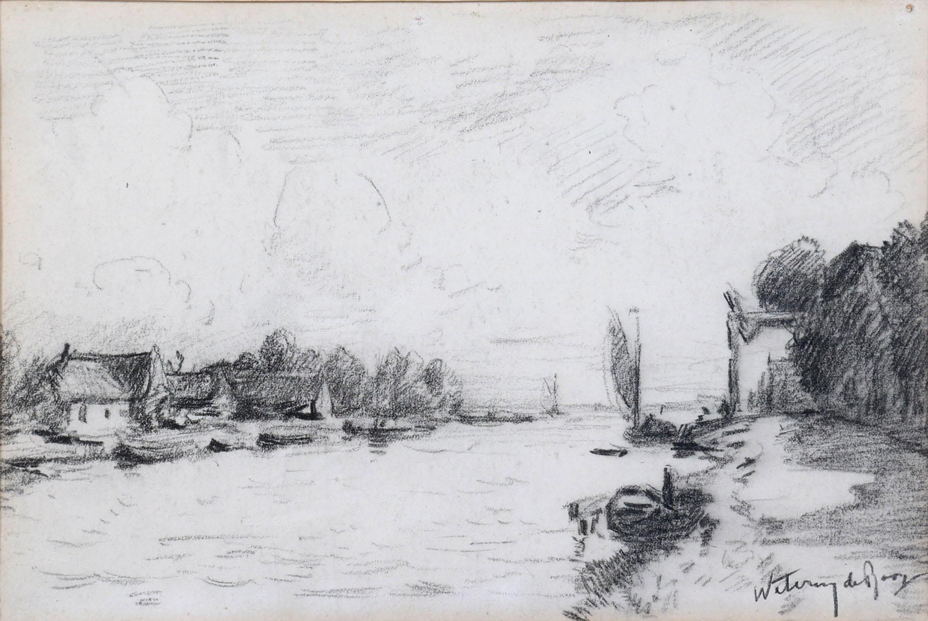 Johannes Embrosius van de Wetering de Rooij (1877-1972), Huisjes langs de waterkant, houtskooltekening, 16 x 23,5 cm.