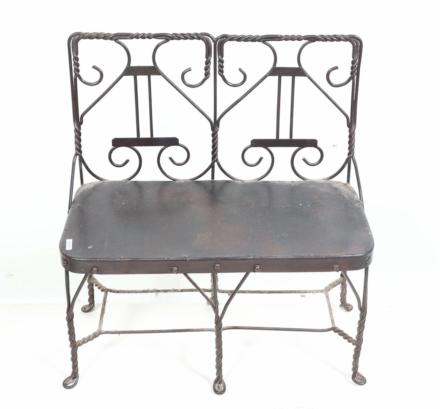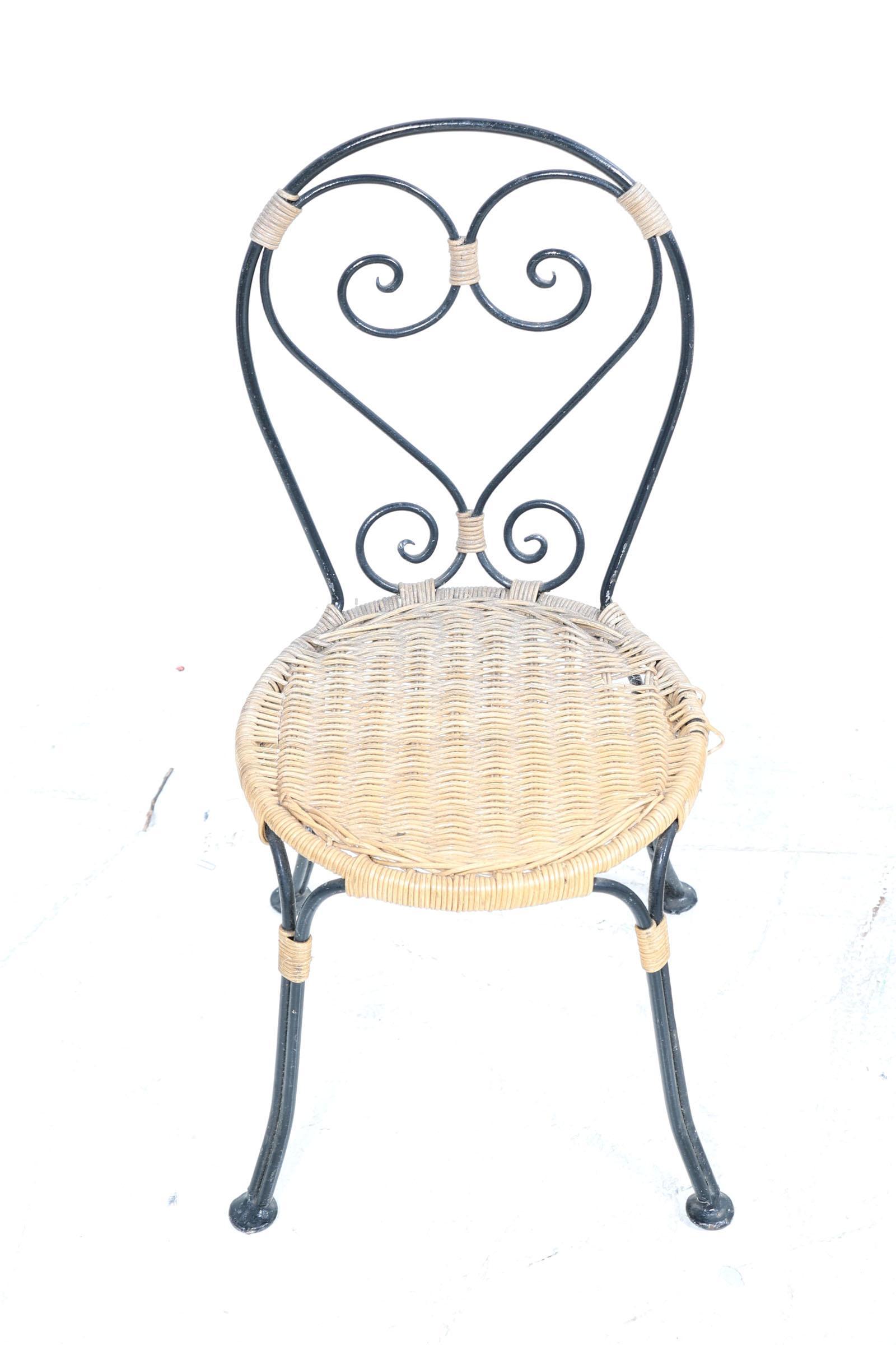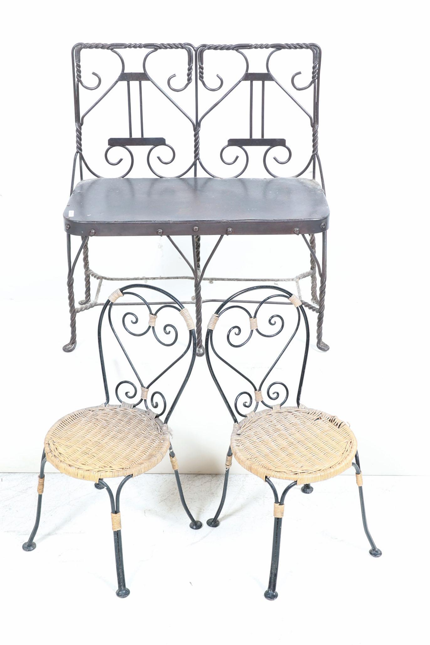 IJzeren kinderbankje en 2 stoelen met rieten zitting