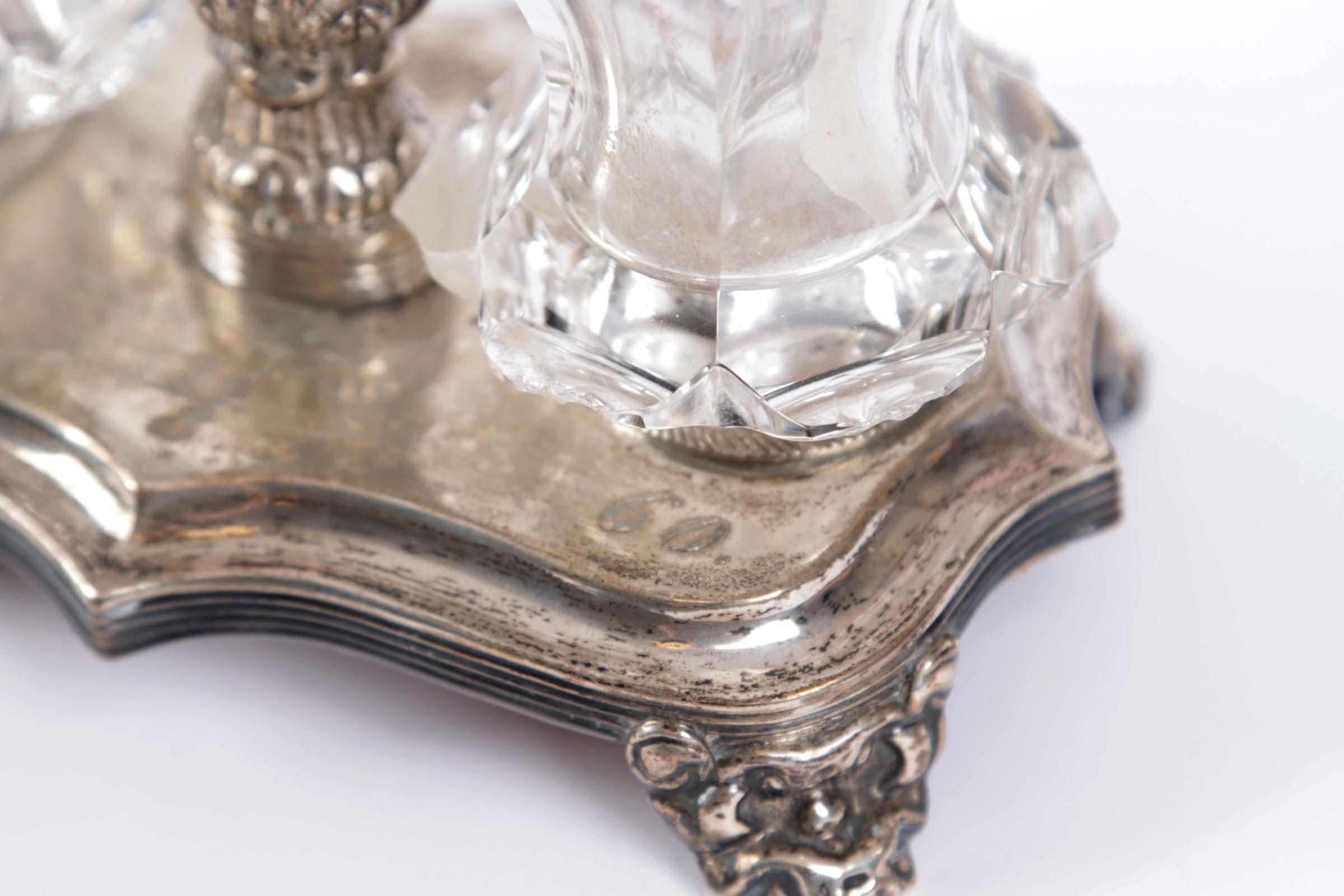 Zilveren inktstel met kristallen potjes, h.14 cm.