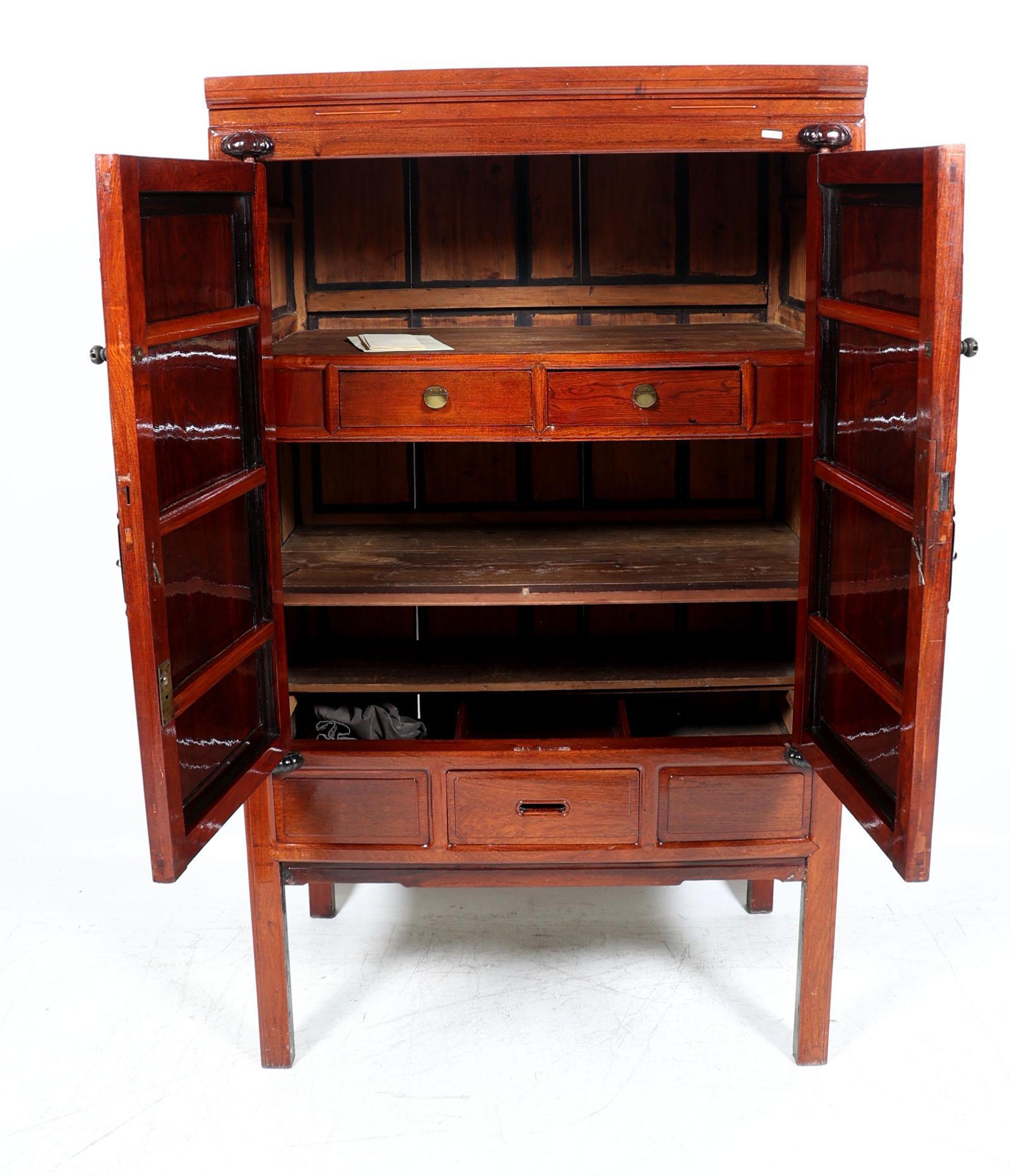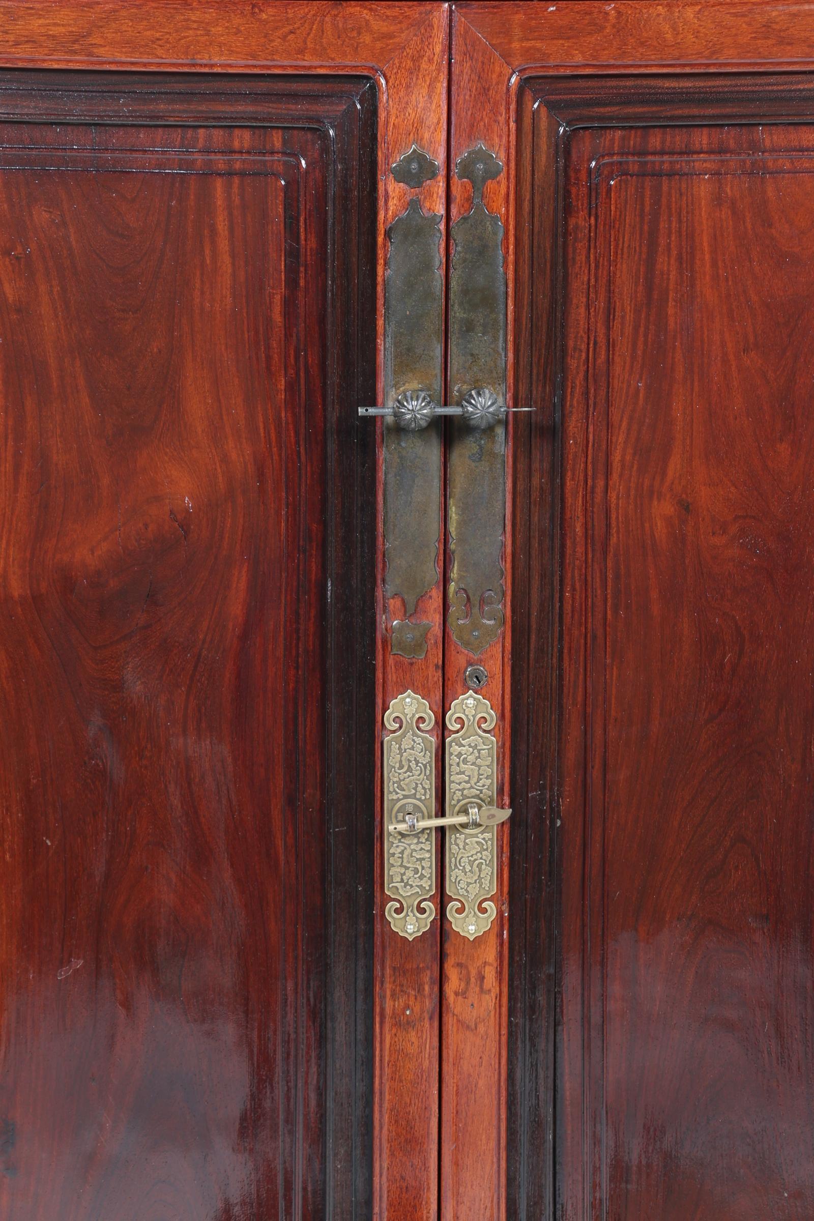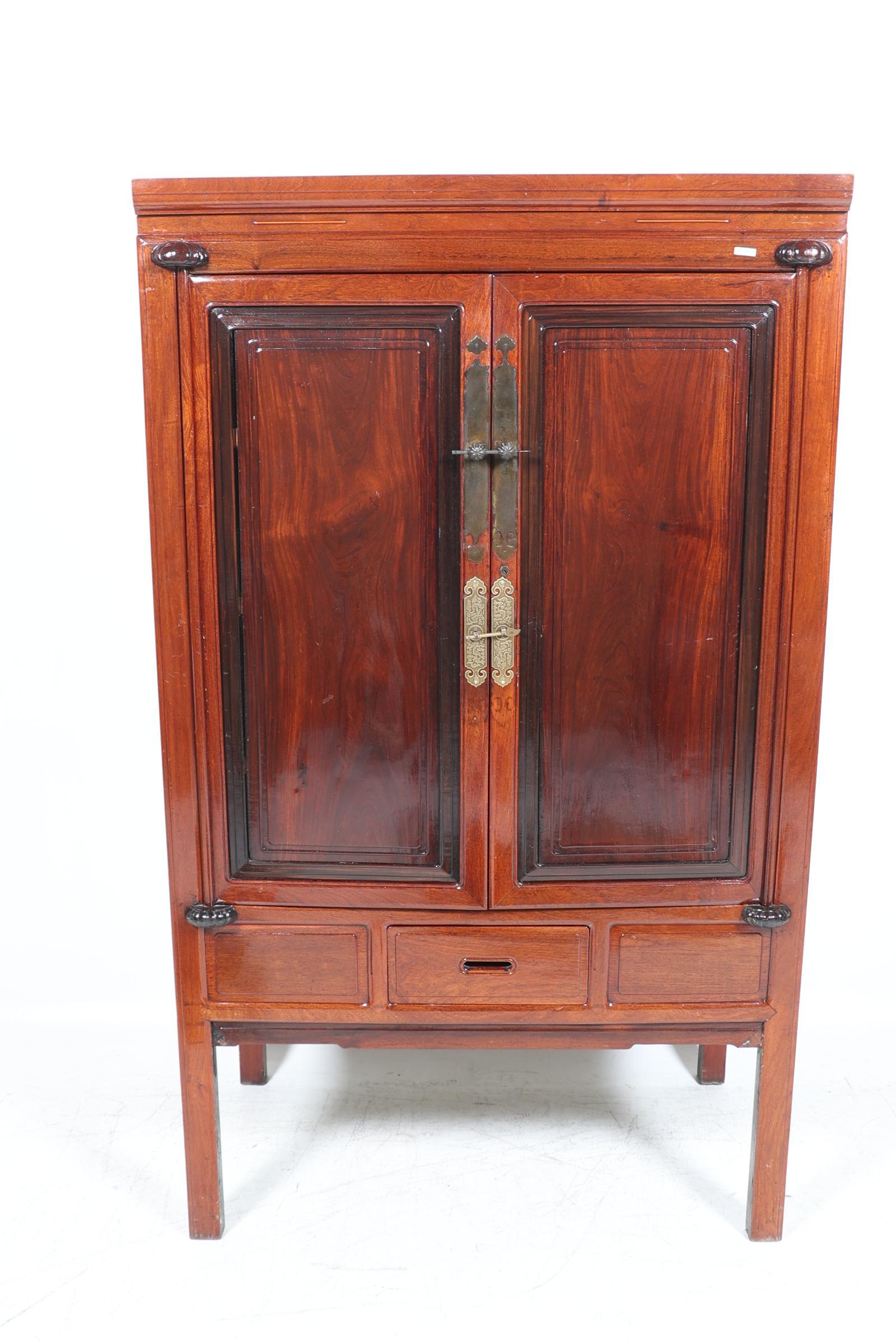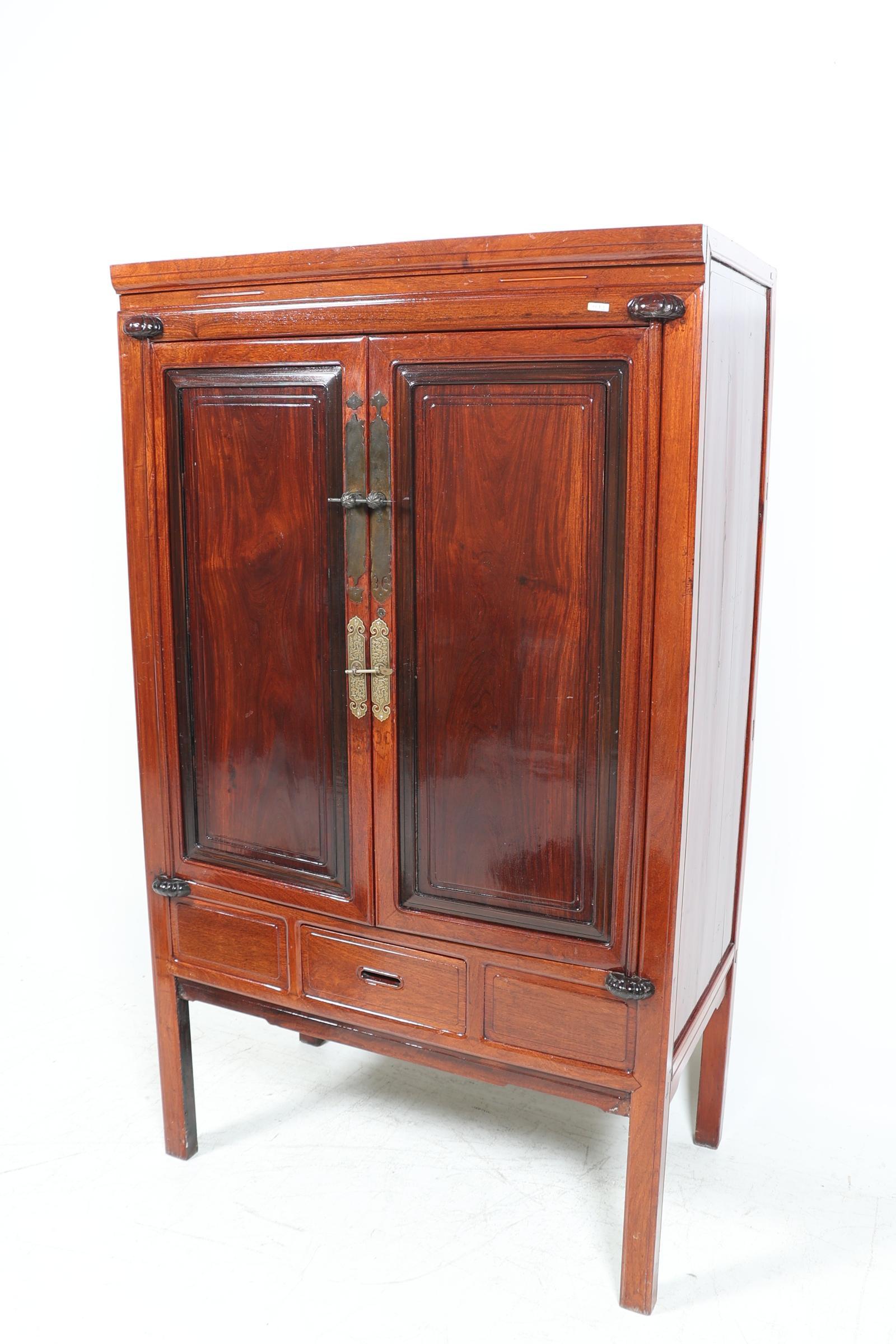 Houten Chinese bruidskast met koperen beslag, h.185 x b.109 x d.60 cm.